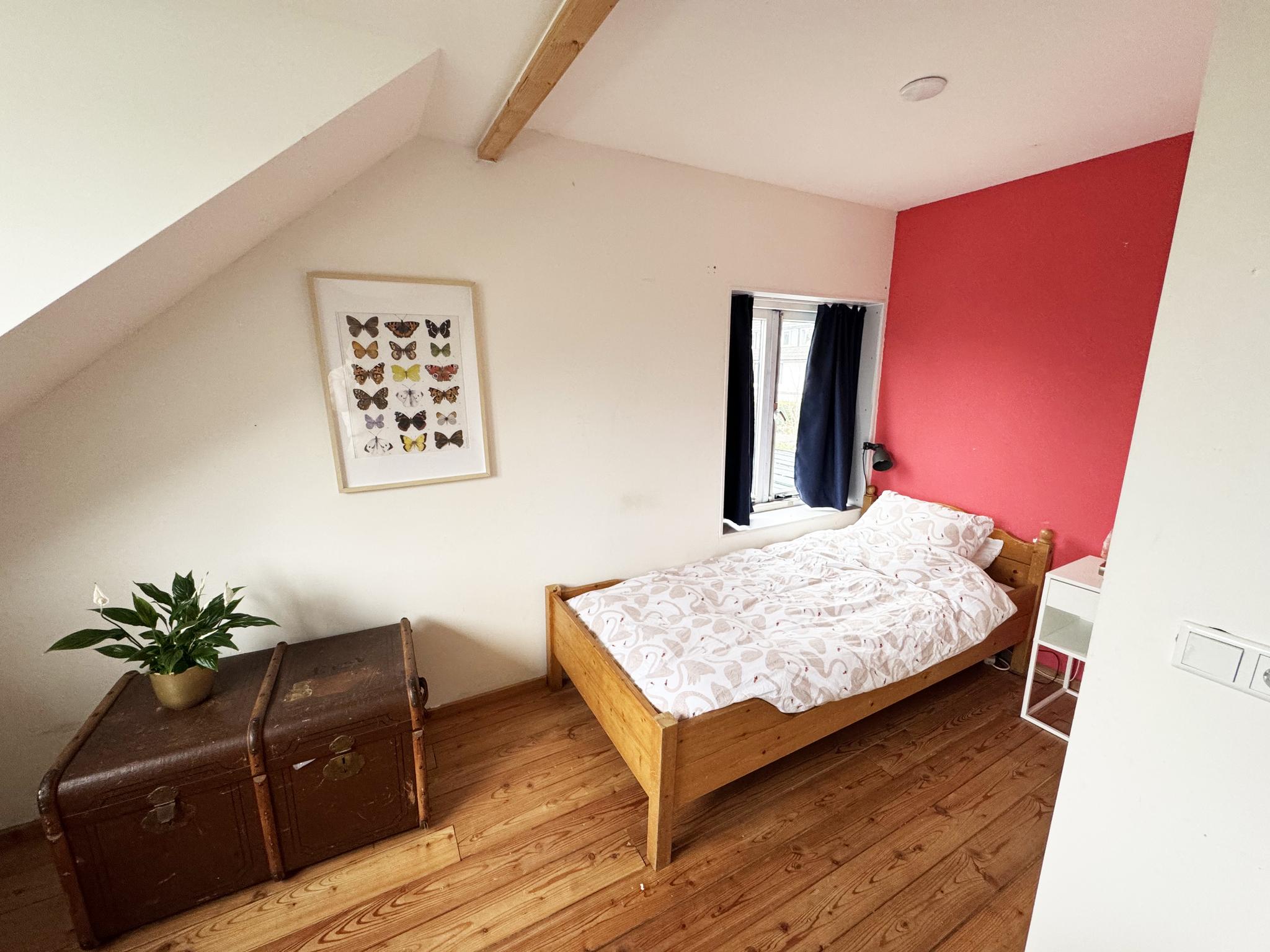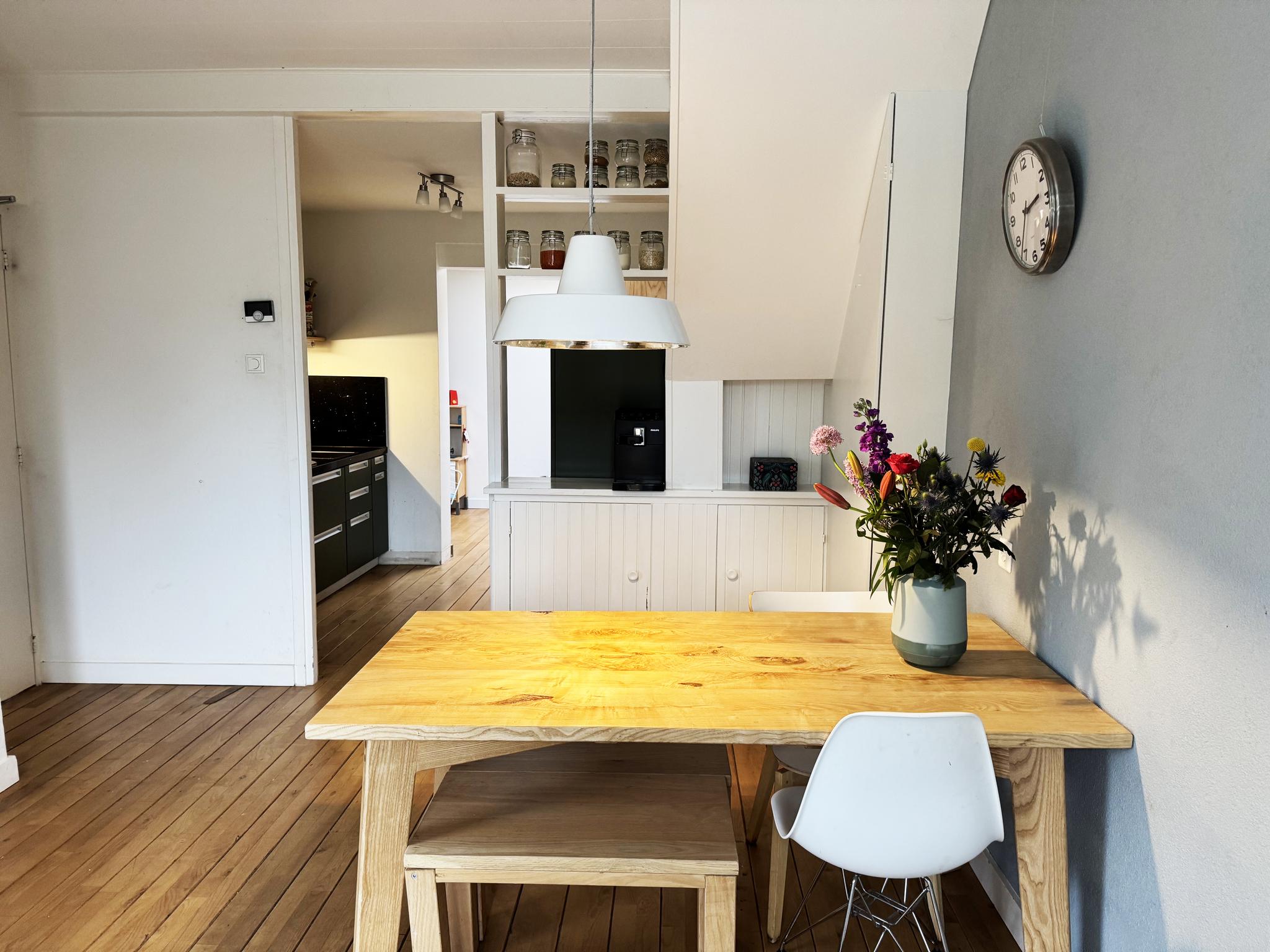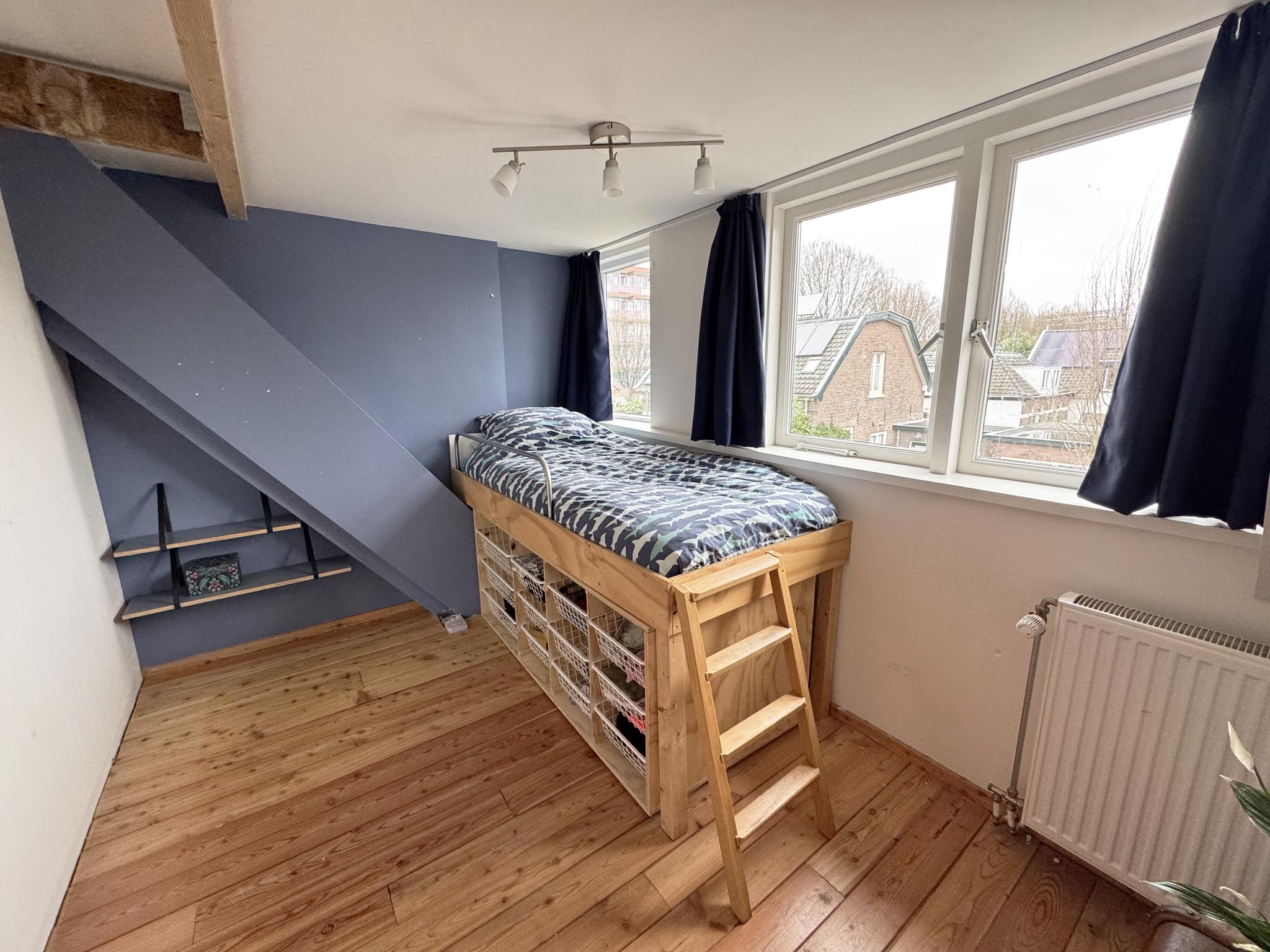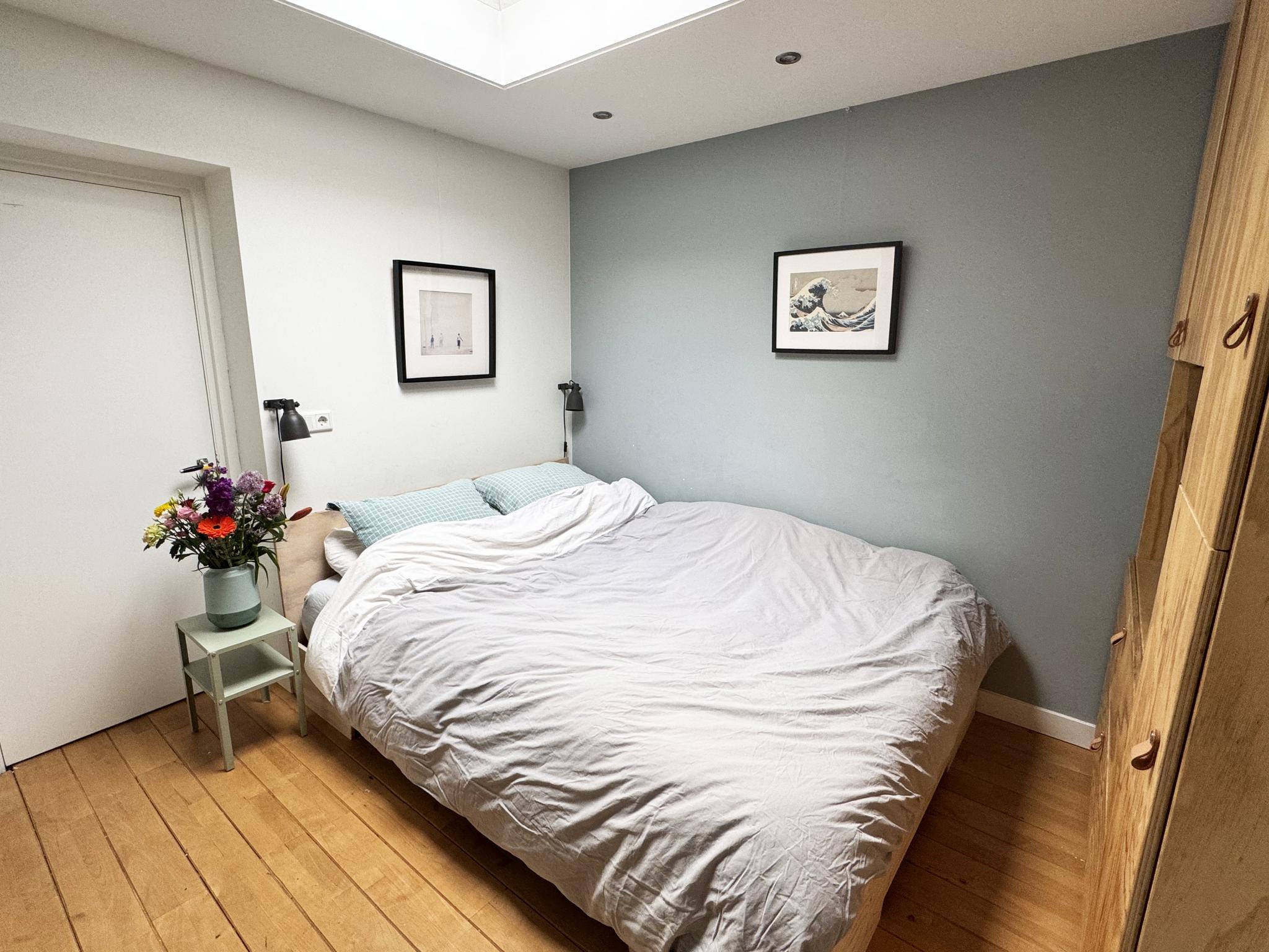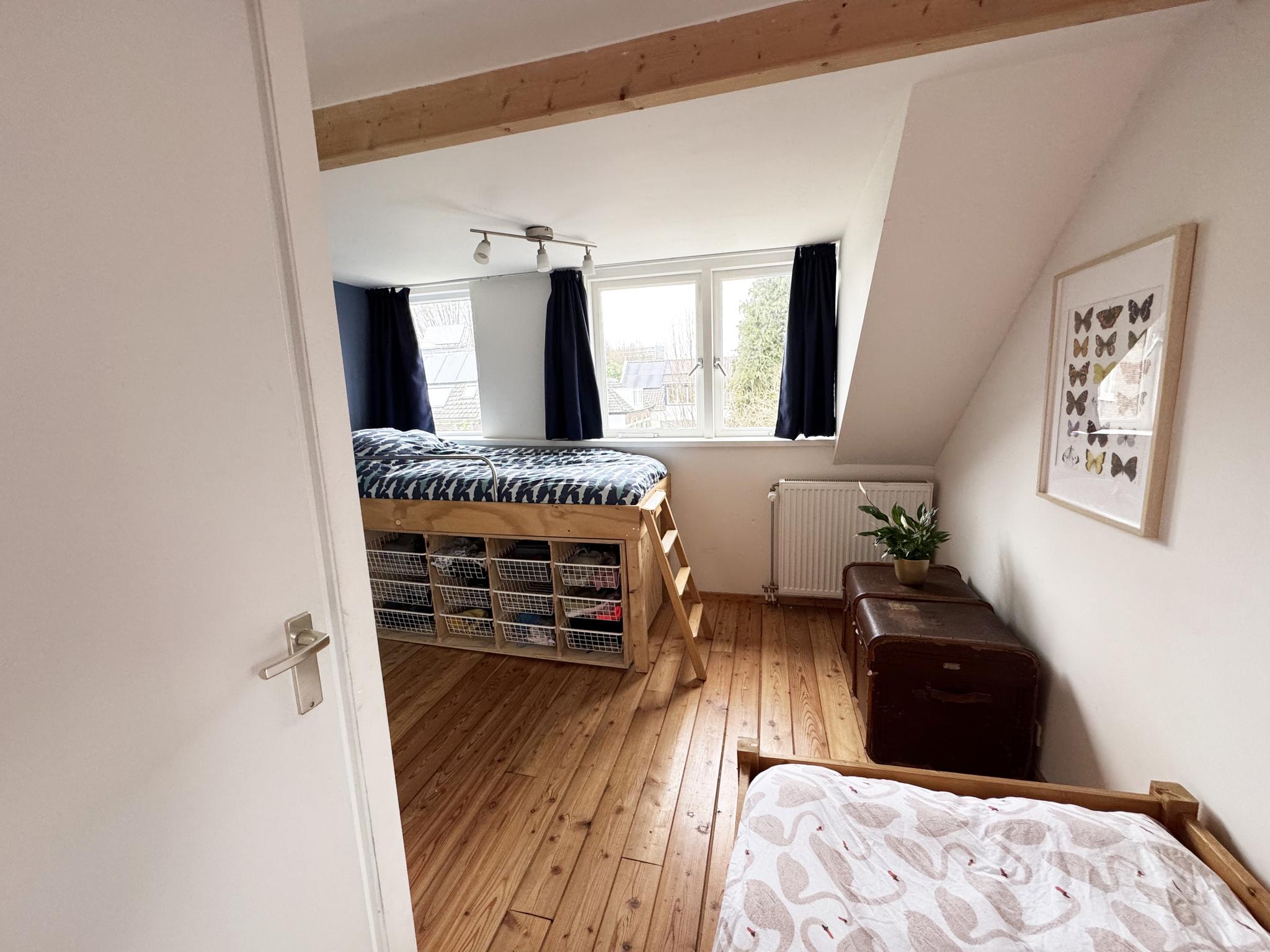Op de eerste verdieping bevindt zich een ruime, zonnige 2 slaapkamers uitgerust met verschillende opbergmogelijkheden en twee dakkapellen, wat de ruimte bijzonder licht maakt. De zolder is een handige bergzolder voor extra opslag.