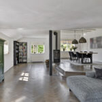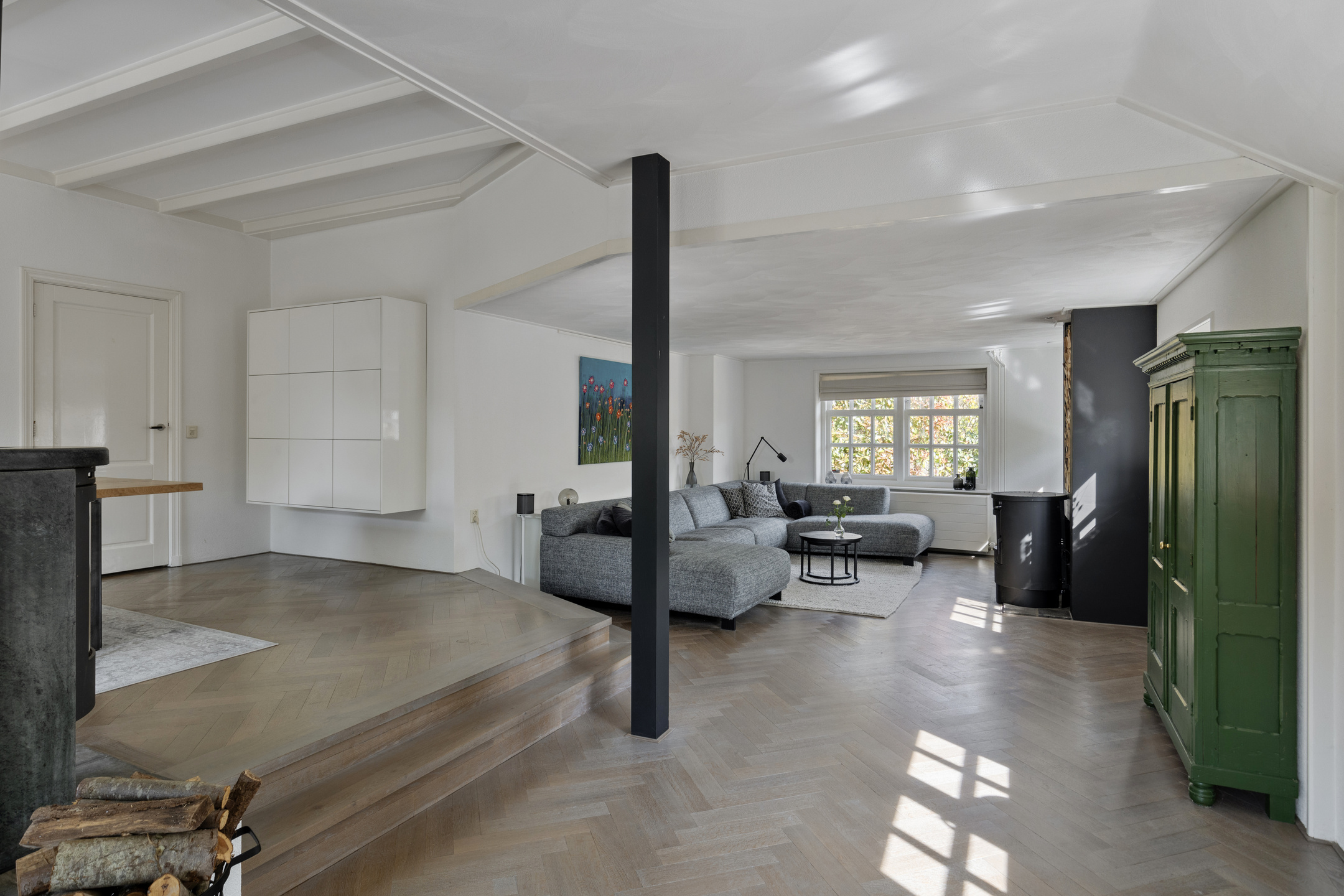 Binnen heerst een sfeer van rust en vrijheid. De woonkamer is zeer ruim en karakteristiek ingedeeld, met een niveauverschil dat een sfeervolle ruimte creëert rond de houtkachel. Grote raampartijen aan de achterzijde halen het buitenlicht naar binnen en verbinden de ruimte met het omliggende groen. De massief eiken visgraat vloer en originele details geven het geheel warmte, rust en uitstraling.