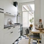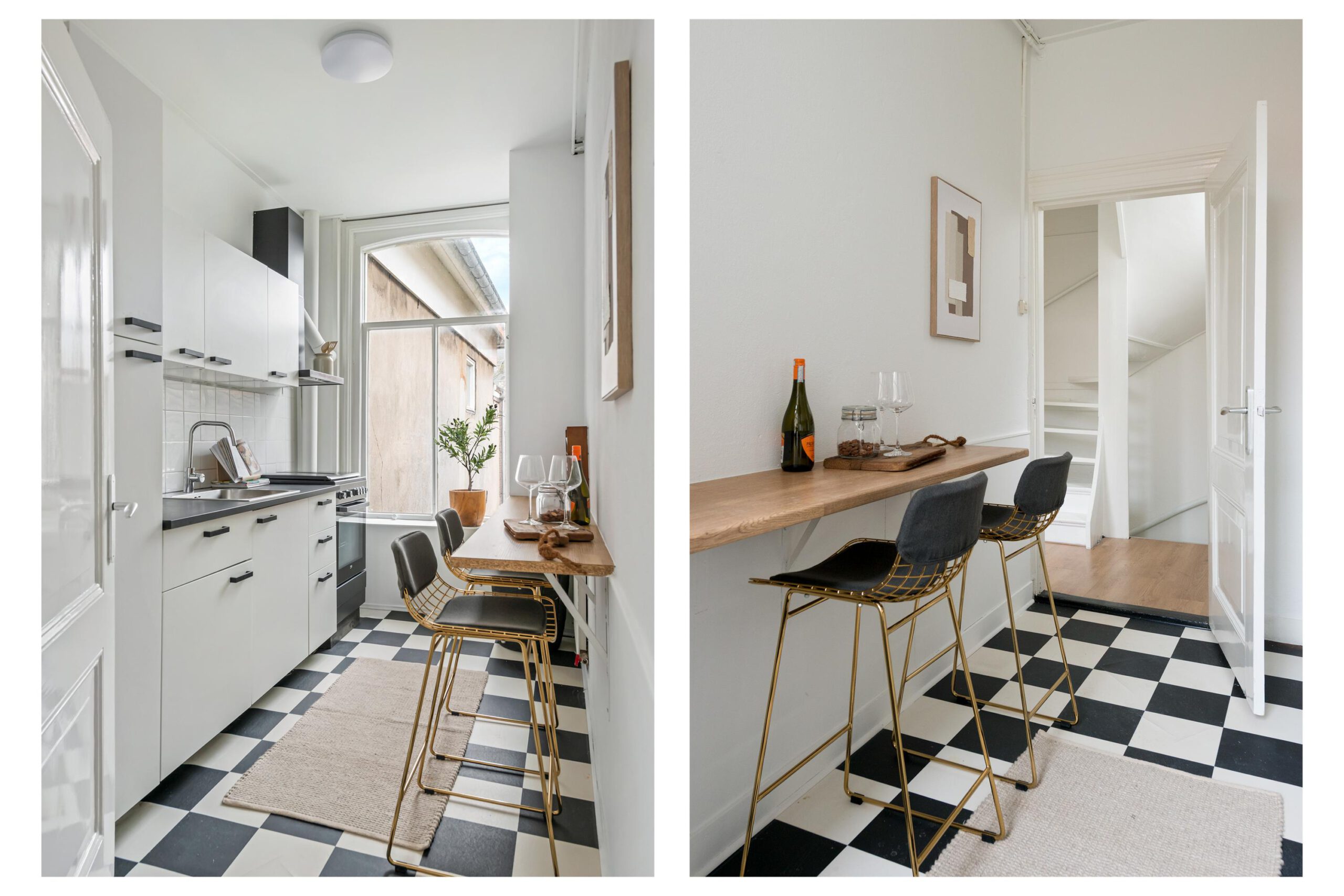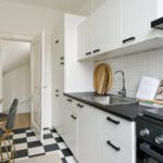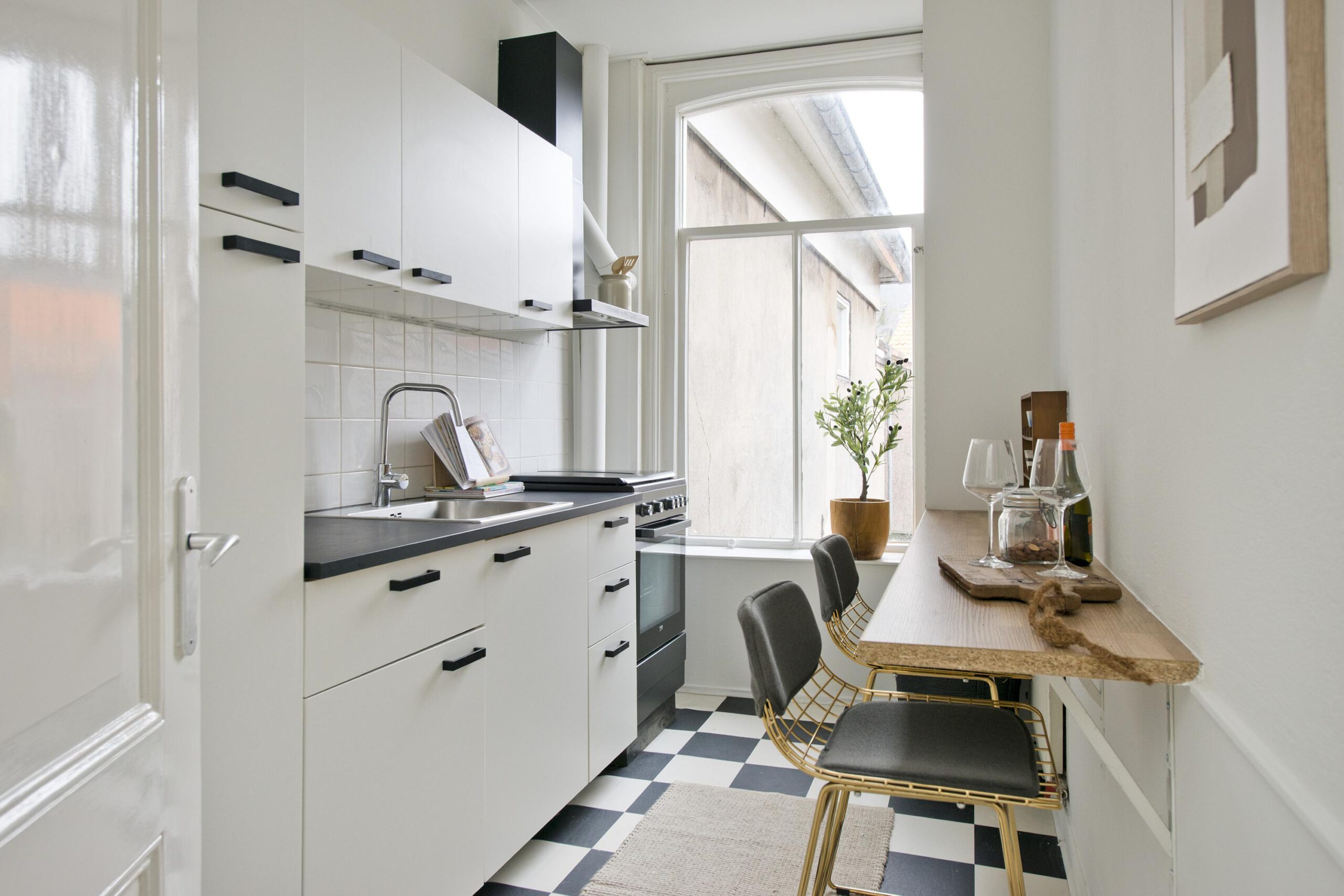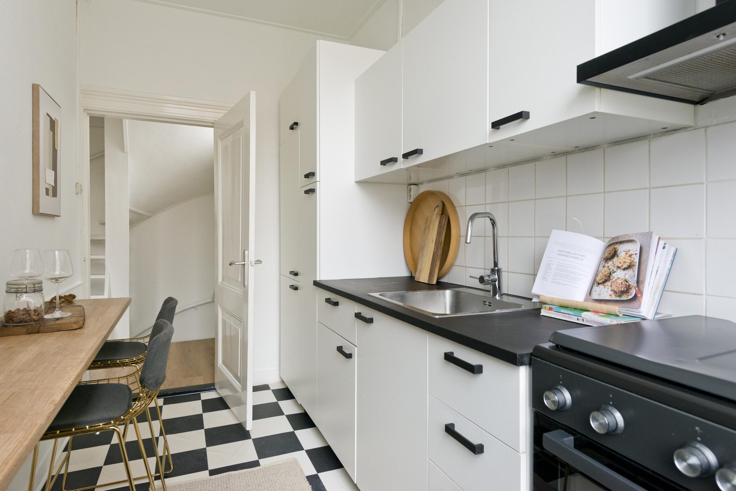 De overloop biedt toegang tot de keuken, de woonkamer en een werk-/slaapkamer. De keuken is uitgerust met een koelkast, vriezer, kookplaat, afzuigkap en oven.