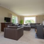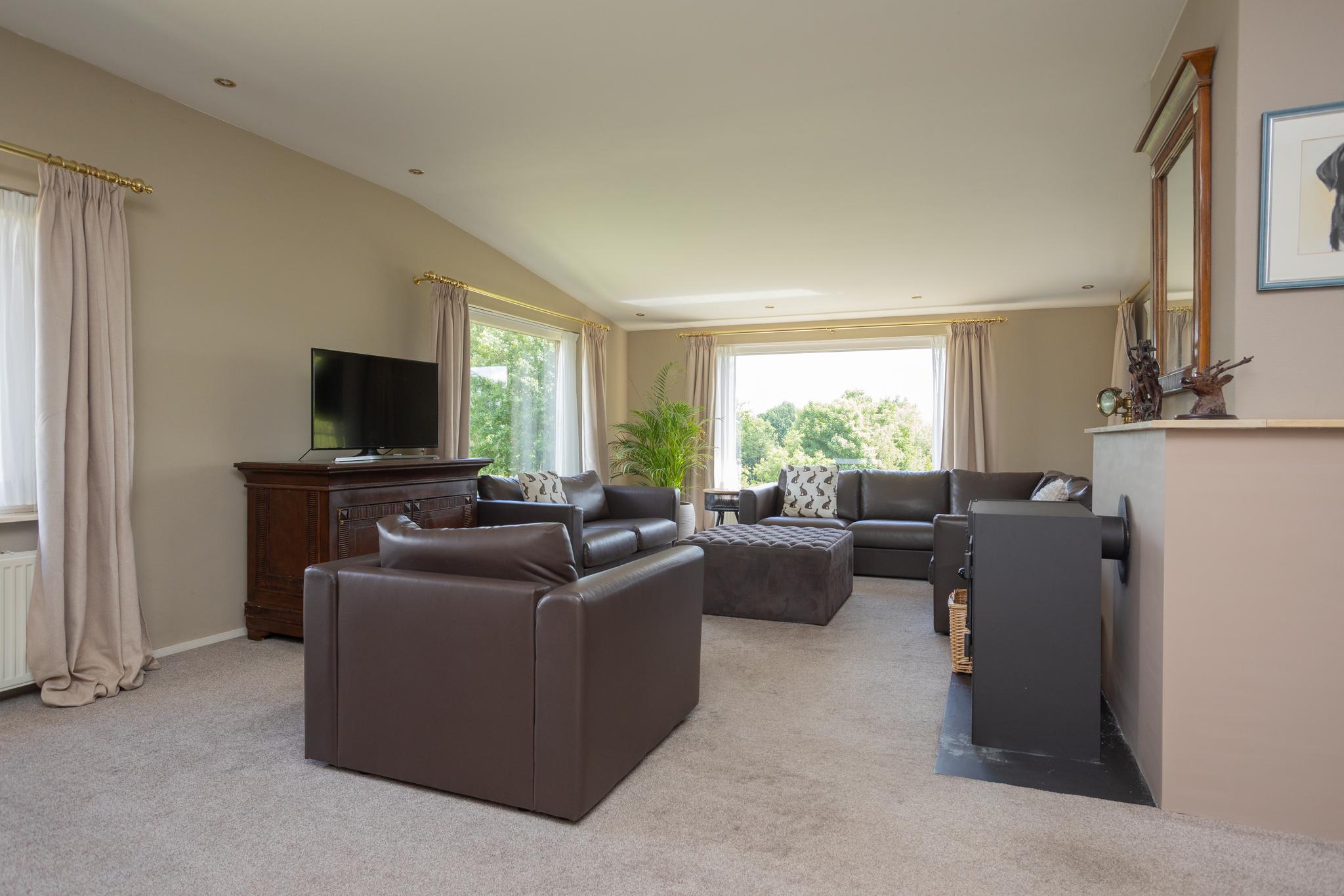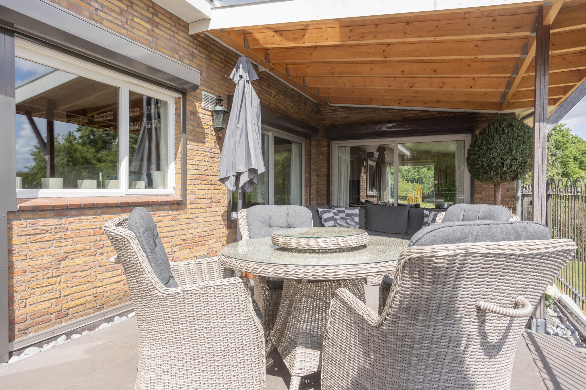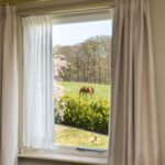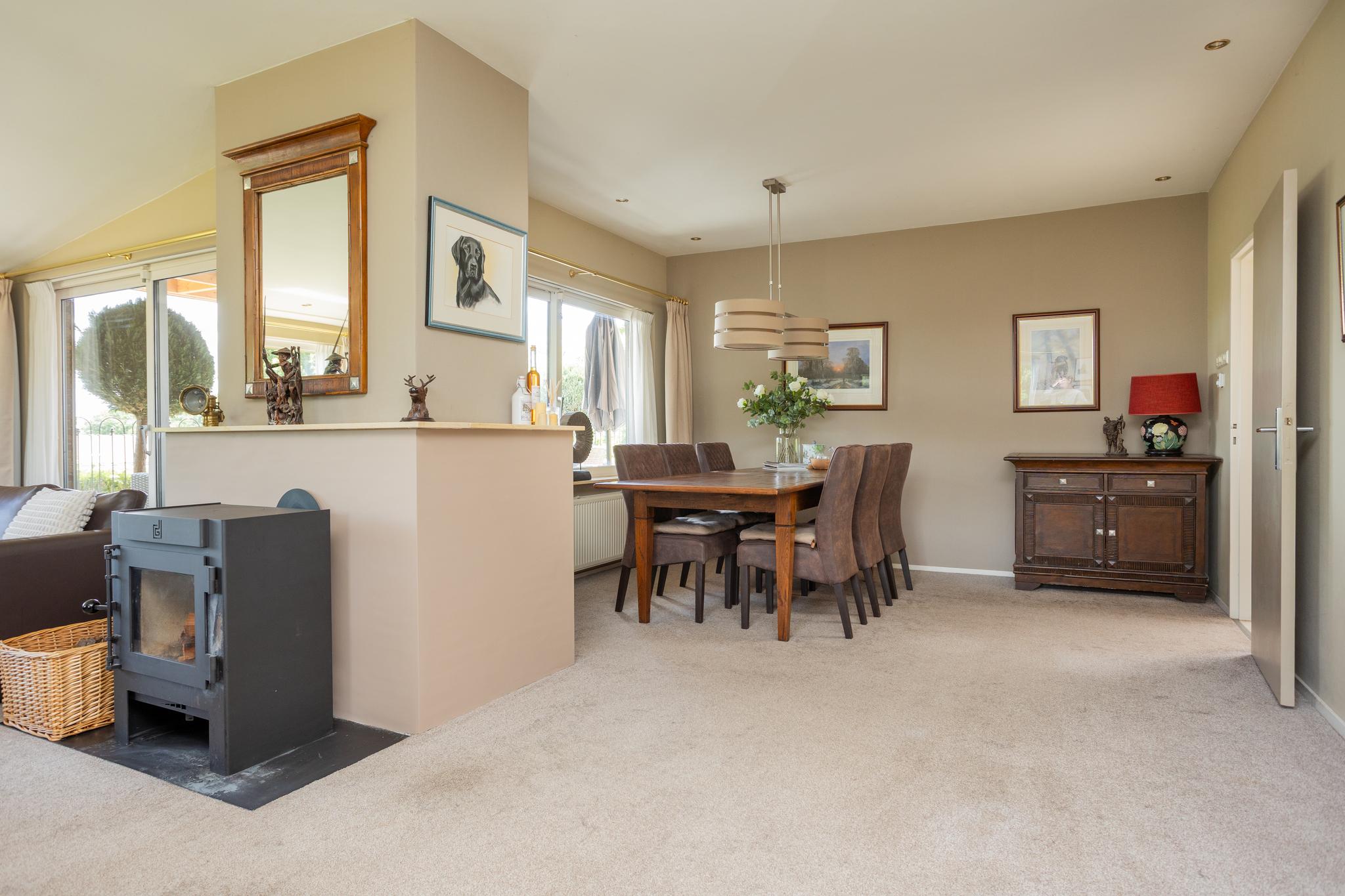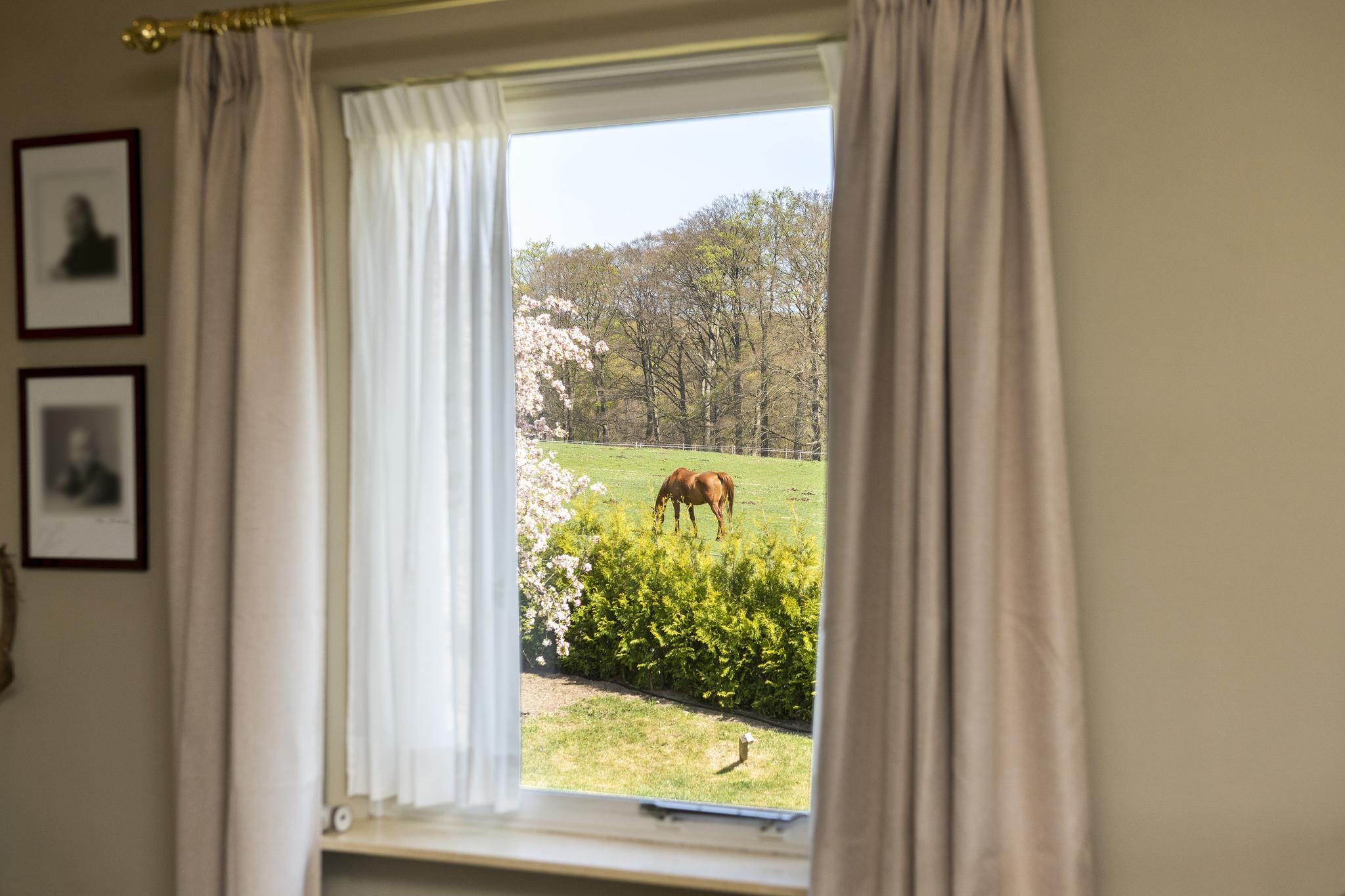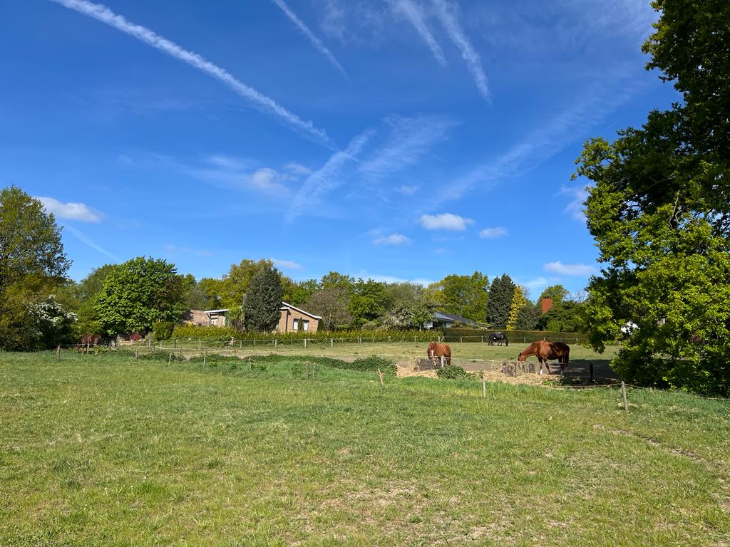 Begane grond: L-vormige woonkamer met afsluitbare houthaard, schuifpui naar groot deels overdekt terras, uitzicht op paardenwei, drie slaapkamers, luxe badkamer met whirlpool bad, toilet, meubel met wastafel en kasten. Volledig ingerichte moderne eetkeuken.