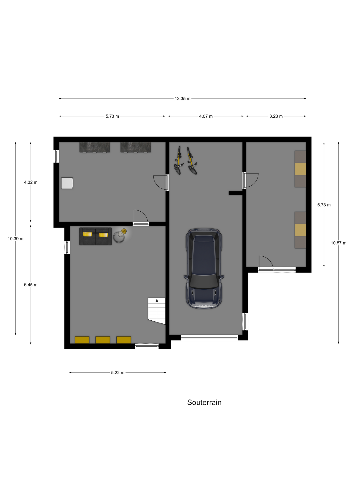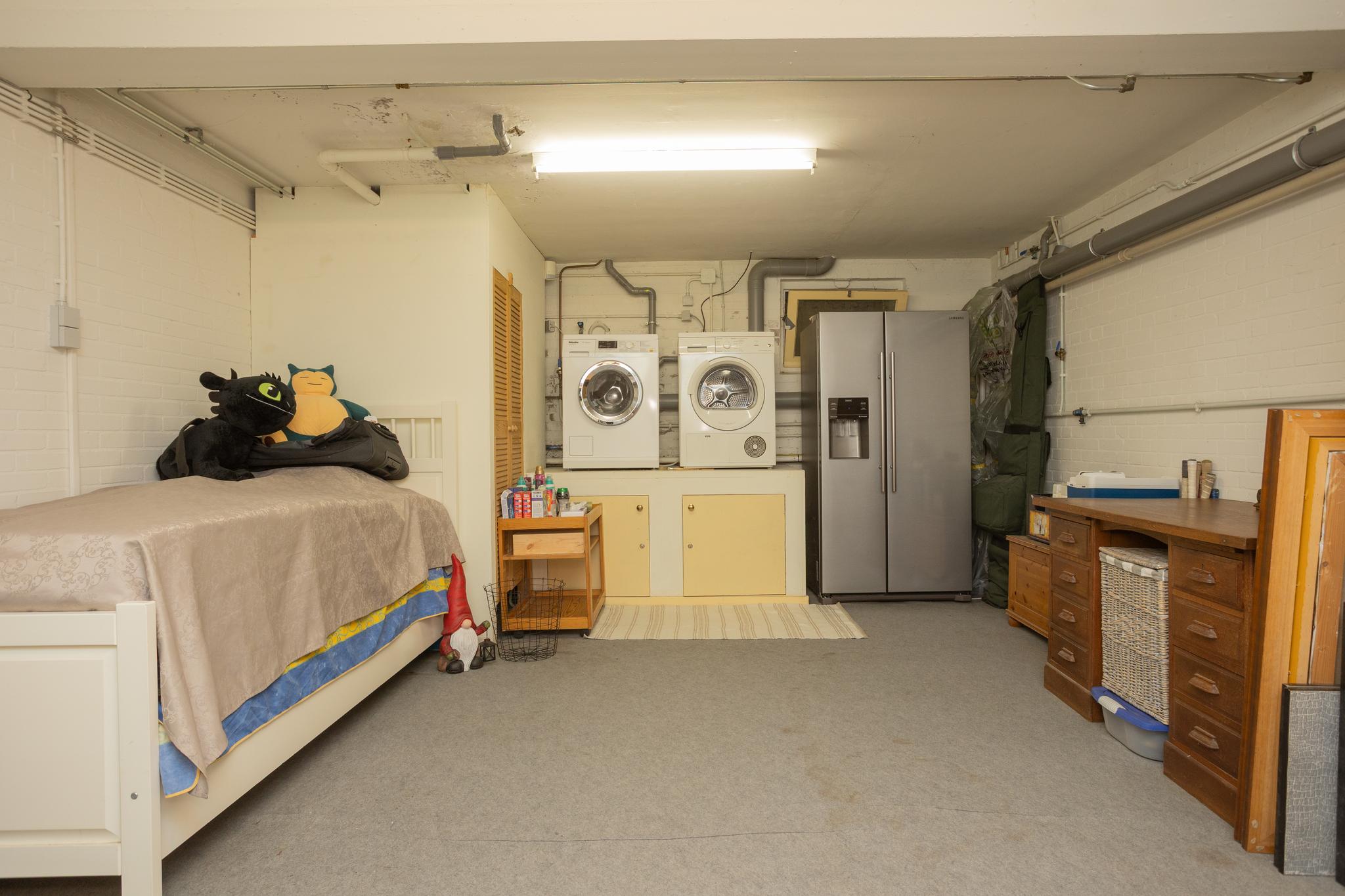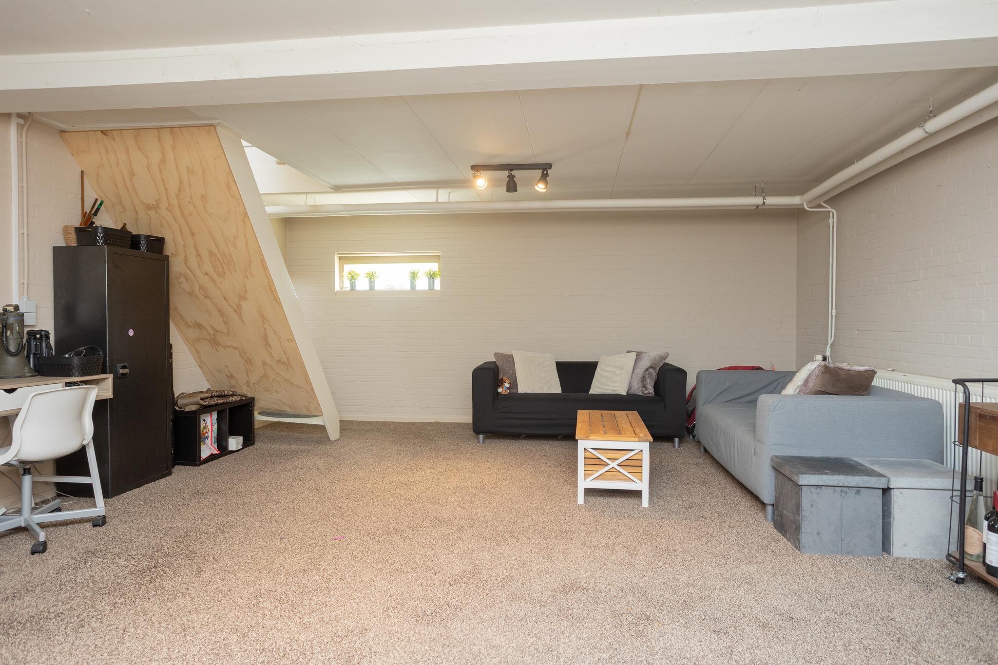 Beneden afdeling: hobbyruimte 33m2, tweede ruimte 25m2 met meterkast en wasmachine droogmachine aansluiting, derde ruimte 22m2 cv ketel ruimte, inpandige garage van ruim 40m2