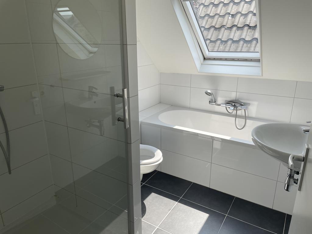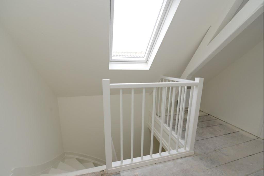 Overloop, Toilet, moderne ruime woonkamer met veel lichtinval, een dichte keuken met diverse apparatuur te weten oven, magnetron, vaatwasser, inductiekookplaat en afzuigkap, bijkeuken (met meterkast, cv- opstelling, aansluiting voor de wasmachine en droger) en toegang tot terras (vanuit de bijkeuken). Via het fraaie trappenhuis heeft men toegang tot de bovenste woonlaag met overloop, TWEE slaapkamers (met de oude spanten in het zicht) en een moderne badkamer (2013) met douche, ligbad, tweede toilet en wastafel.