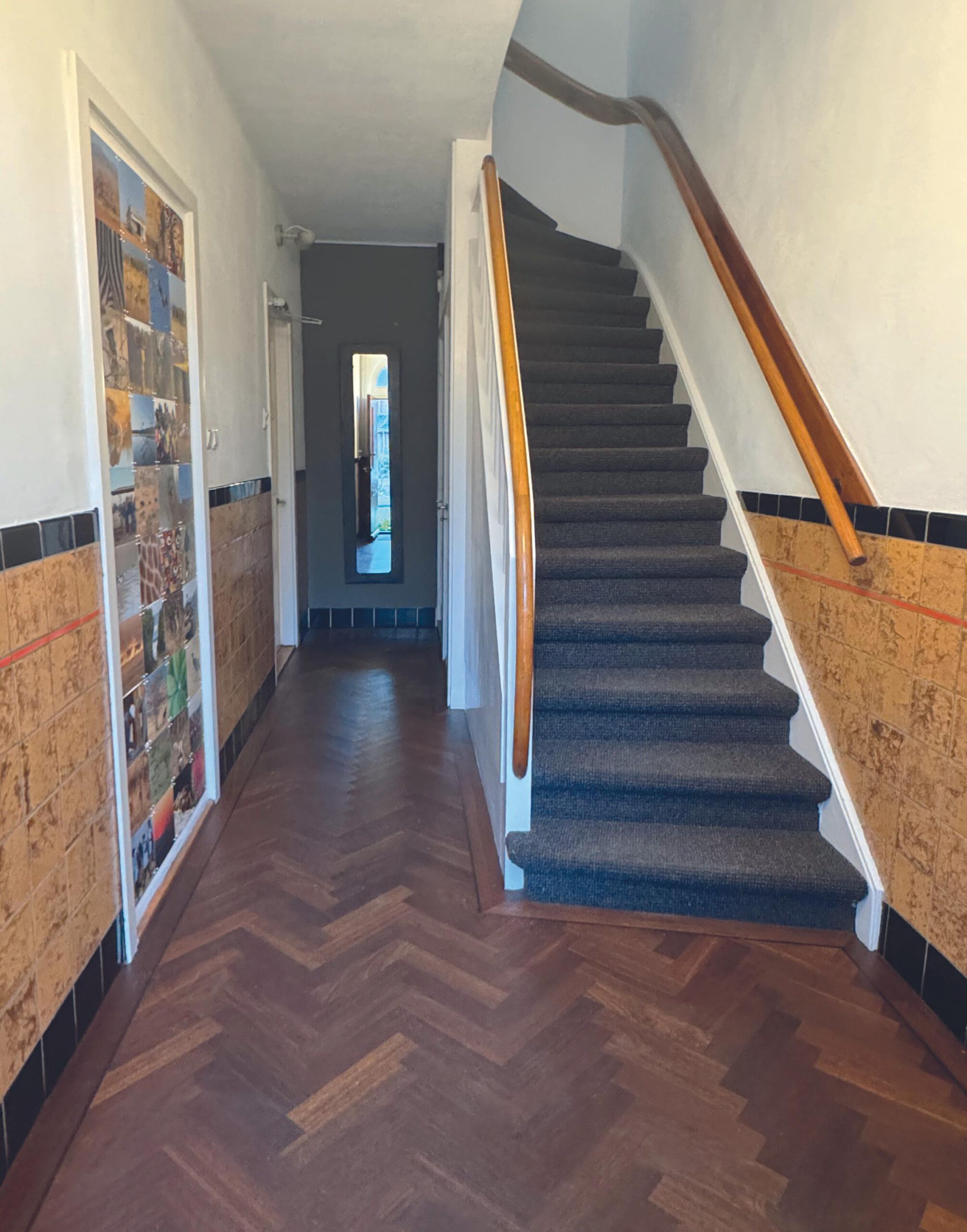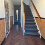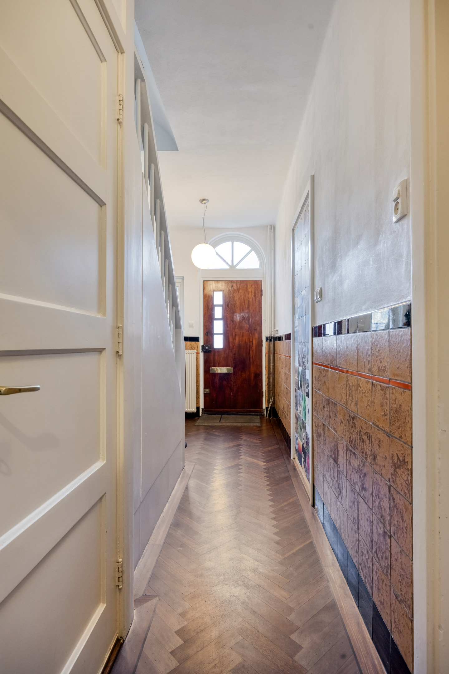 Entree Prachtige hal met originele voordeur, parketvloer en wandtegels. Toegang tot het toilet en de provisiekelder.