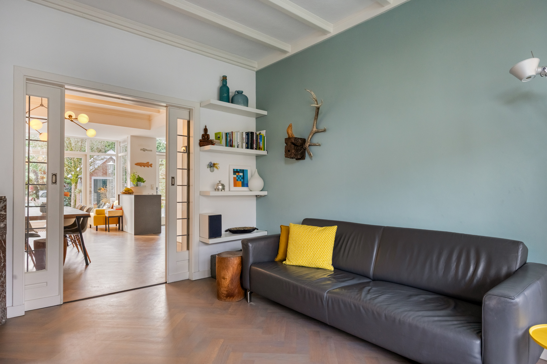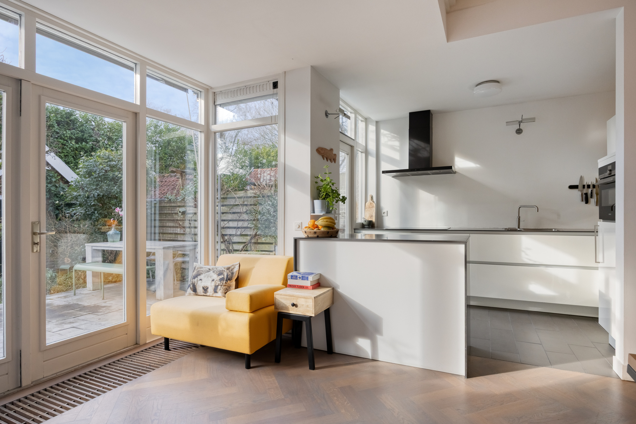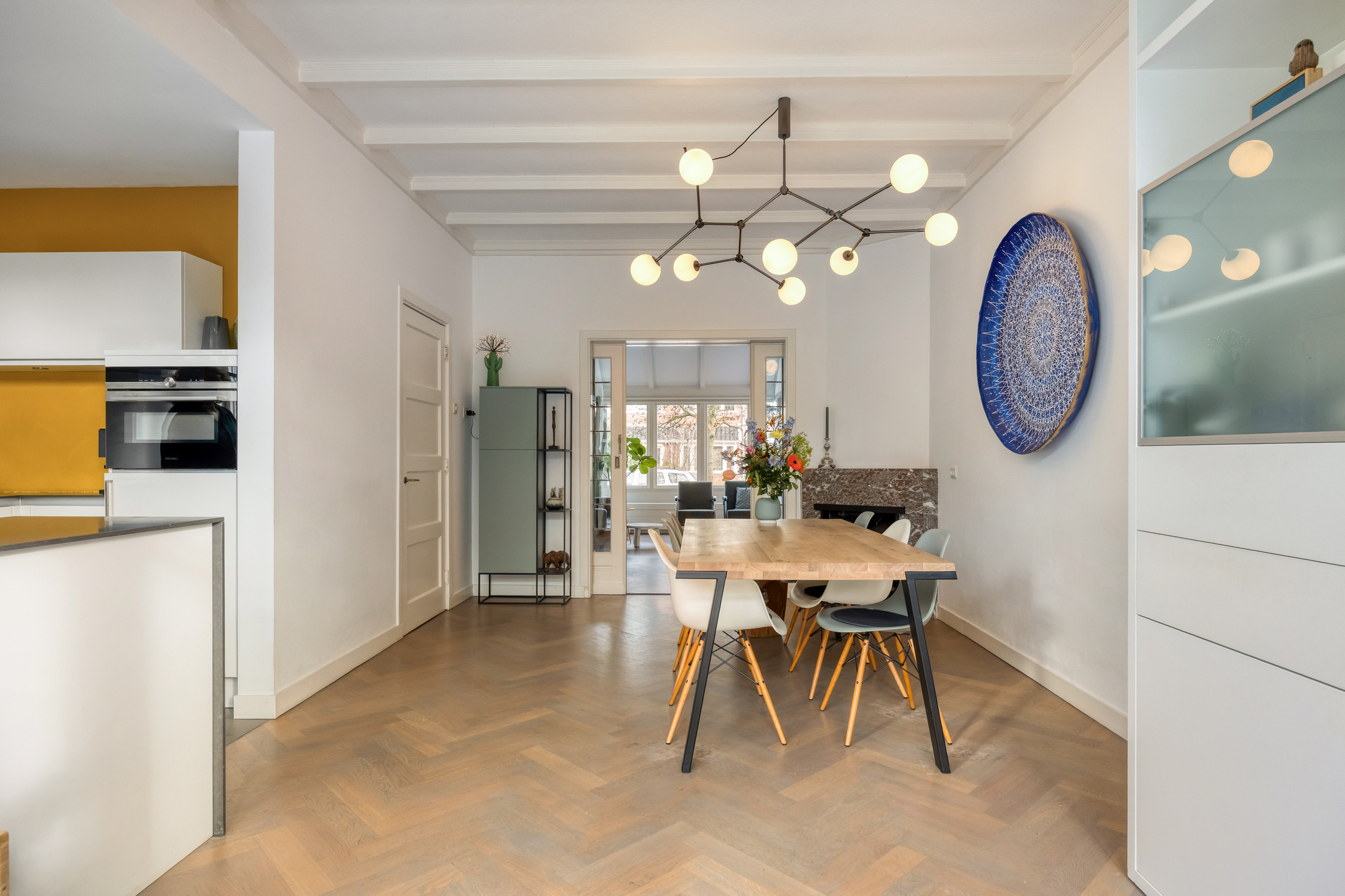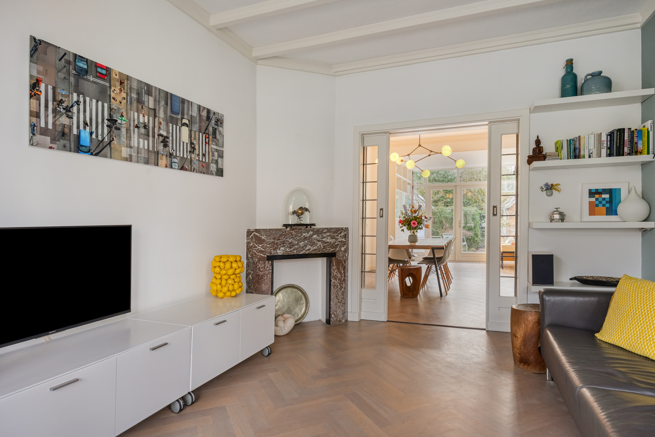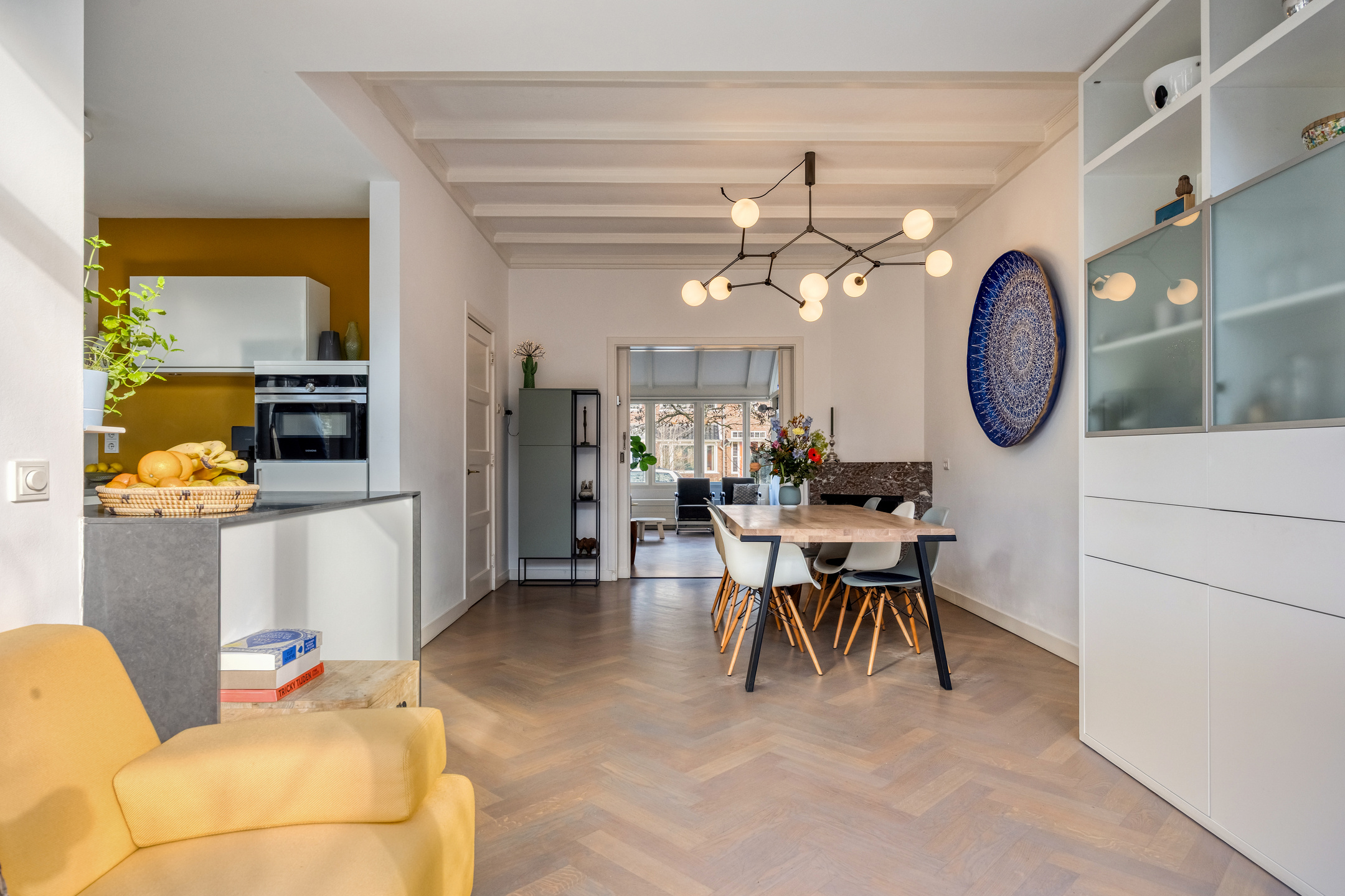 Woonkamer en keuken: De ruime, sfeervolle woonkamer vormt het warme hart van de woning en is een prachtig voorbeeld van de jaren ’30-stijl, compleet met glas-in-lood en-suite deuren, marmeren schouwen, een fraaie Frans massief houten vloer en een prachtige erker die veel natuurlijk licht binnenlaat. Deze ruimte ademt karakter en gezelligheid en biedt volop mogelijkheden voor een comfortabele indeling. De open, moderne keuken is van alle gemakken voorzien, inclusief diverse inbouwapparatuur zoals een vaatwasmachine, combi-oven, koelkast, Quooker, inductiekookplaat en afzuigkap. Vanuit de woonkamer zorgen openslaande deuren voor een directe verbinding met de zonnige achtertuin, waardoor binnen en buiten mooi in elkaar overlopen.