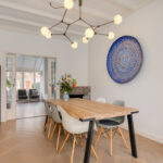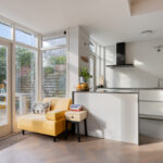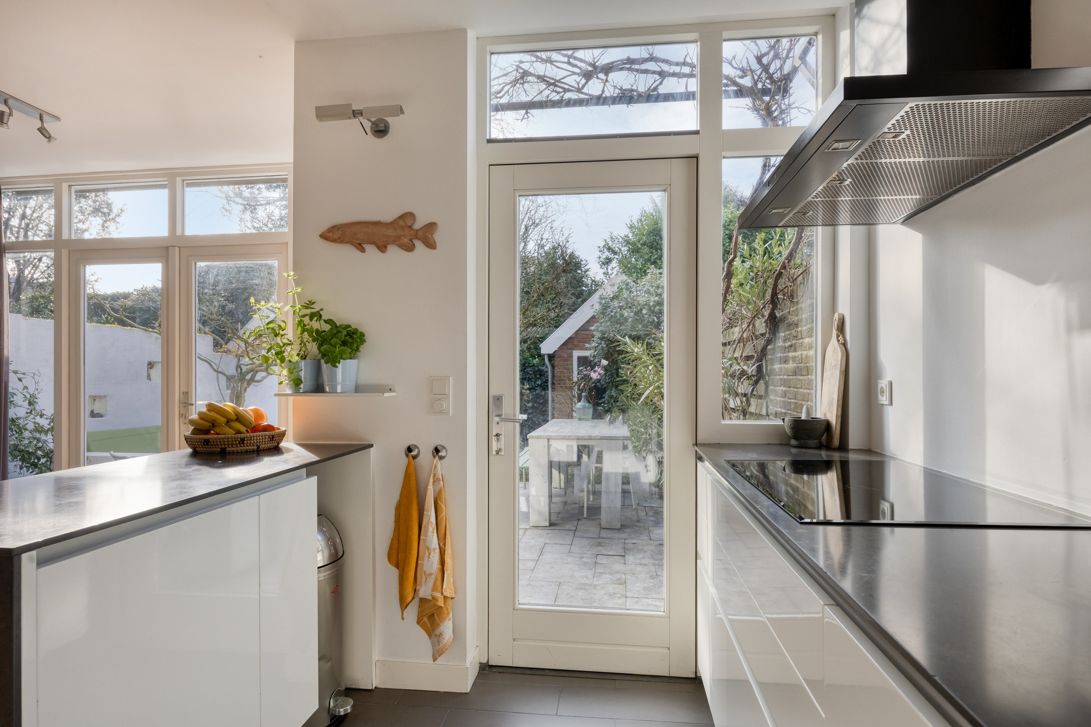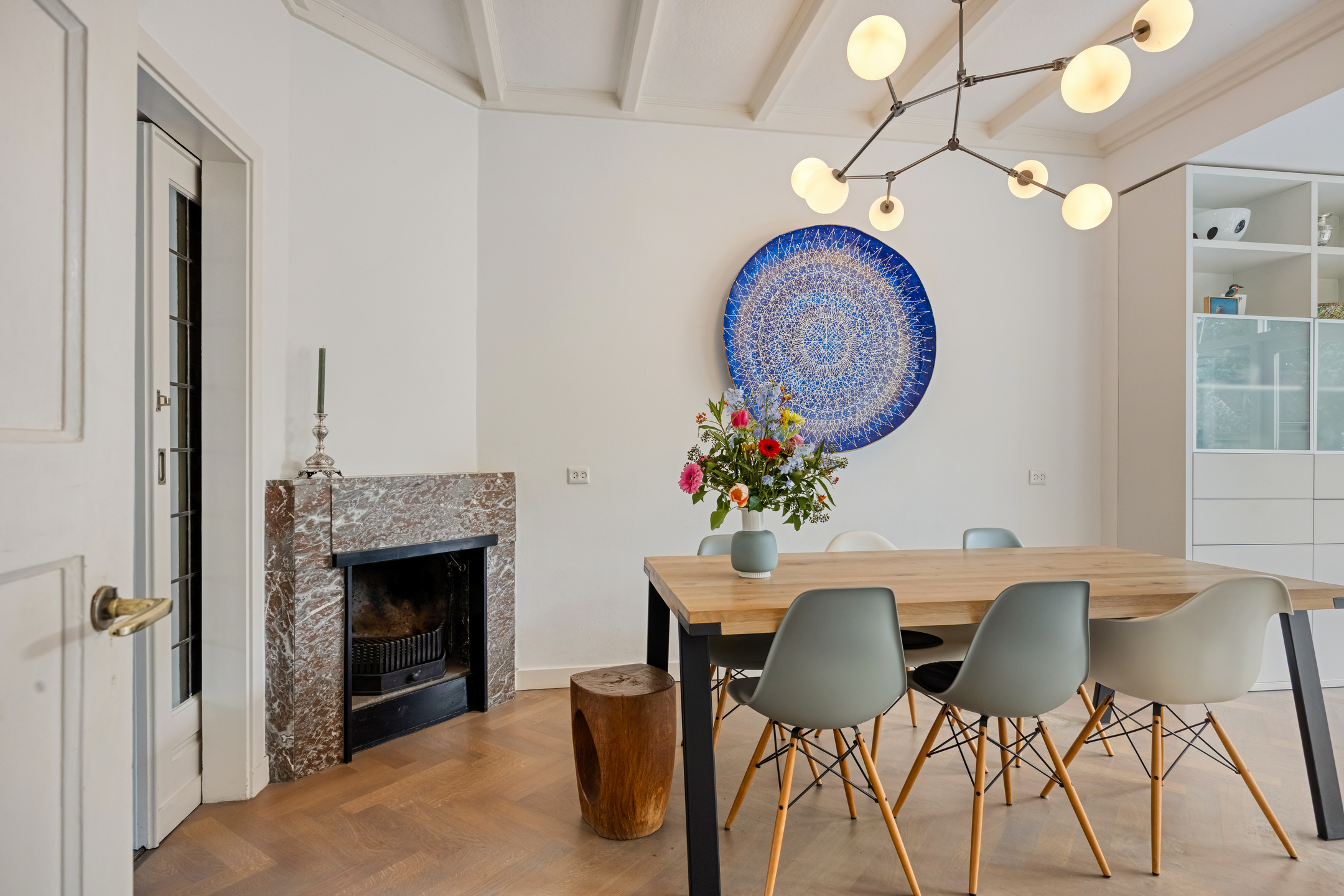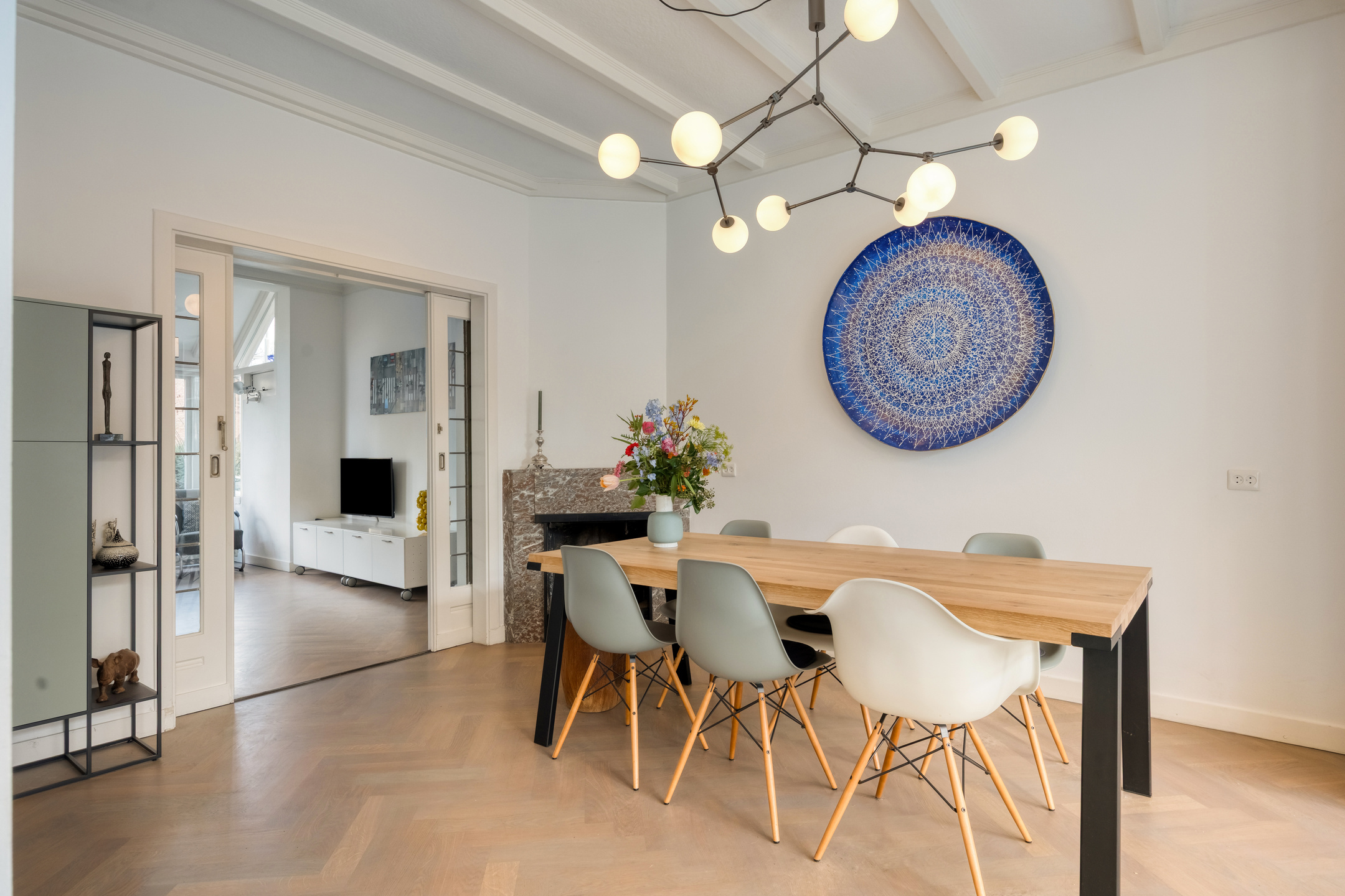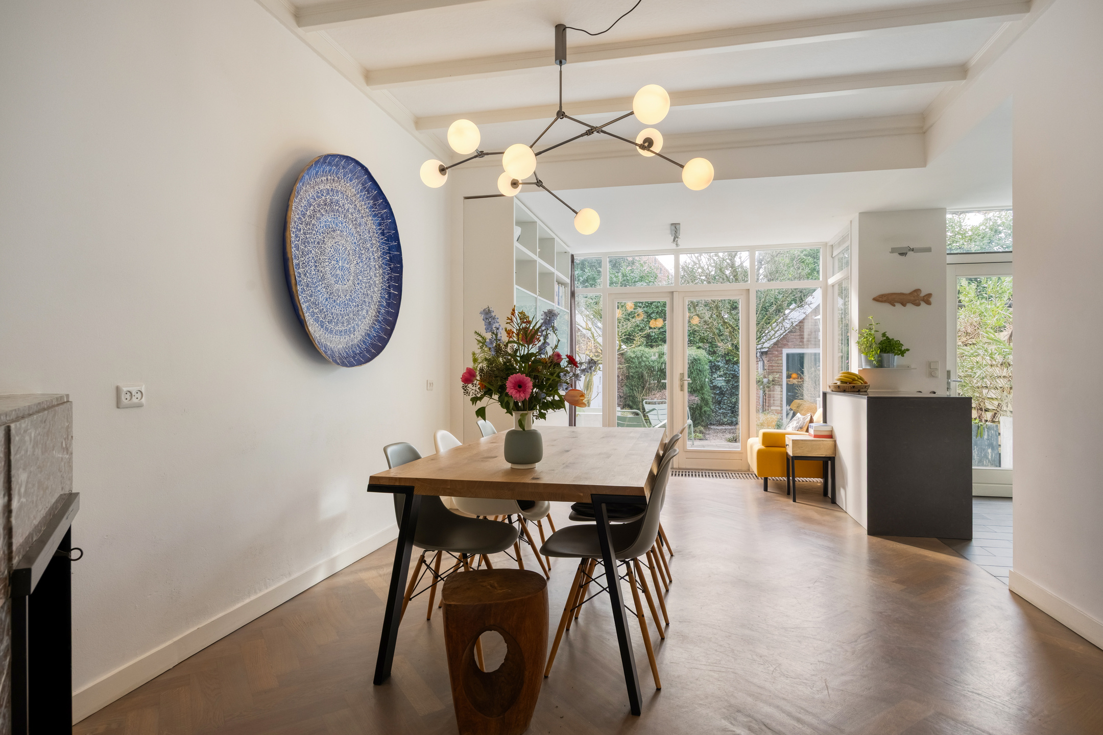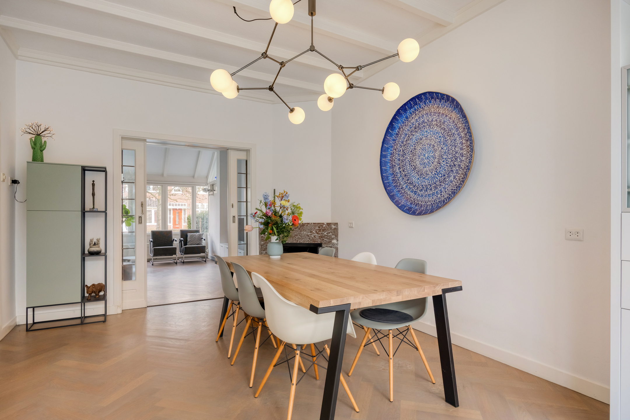 Woonkamer en keuken: De ruime, sfeervolle woonkamer vormt het warme hart van de woning en is een prachtig voorbeeld van de jaren ’30-stijl, compleet met glas-in-lood en-suite deuren, marmeren schouwen, een fraaie Frans massief houten vloer en een prachtige erker die veel natuurlijk licht binnenlaat. Deze ruimte ademt karakter en gezelligheid en biedt volop mogelijkheden voor een comfortabele indeling. De open, moderne keuken is van alle gemakken voorzien, inclusief diverse inbouwapparatuur zoals een vaatwasmachine, combi-oven, koelkast, Quooker, inductiekookplaat en afzuigkap. Vanuit de woonkamer zorgen openslaande deuren voor een directe verbinding met de zonnige achtertuin, waardoor binnen en buiten mooi in elkaar overlopen.