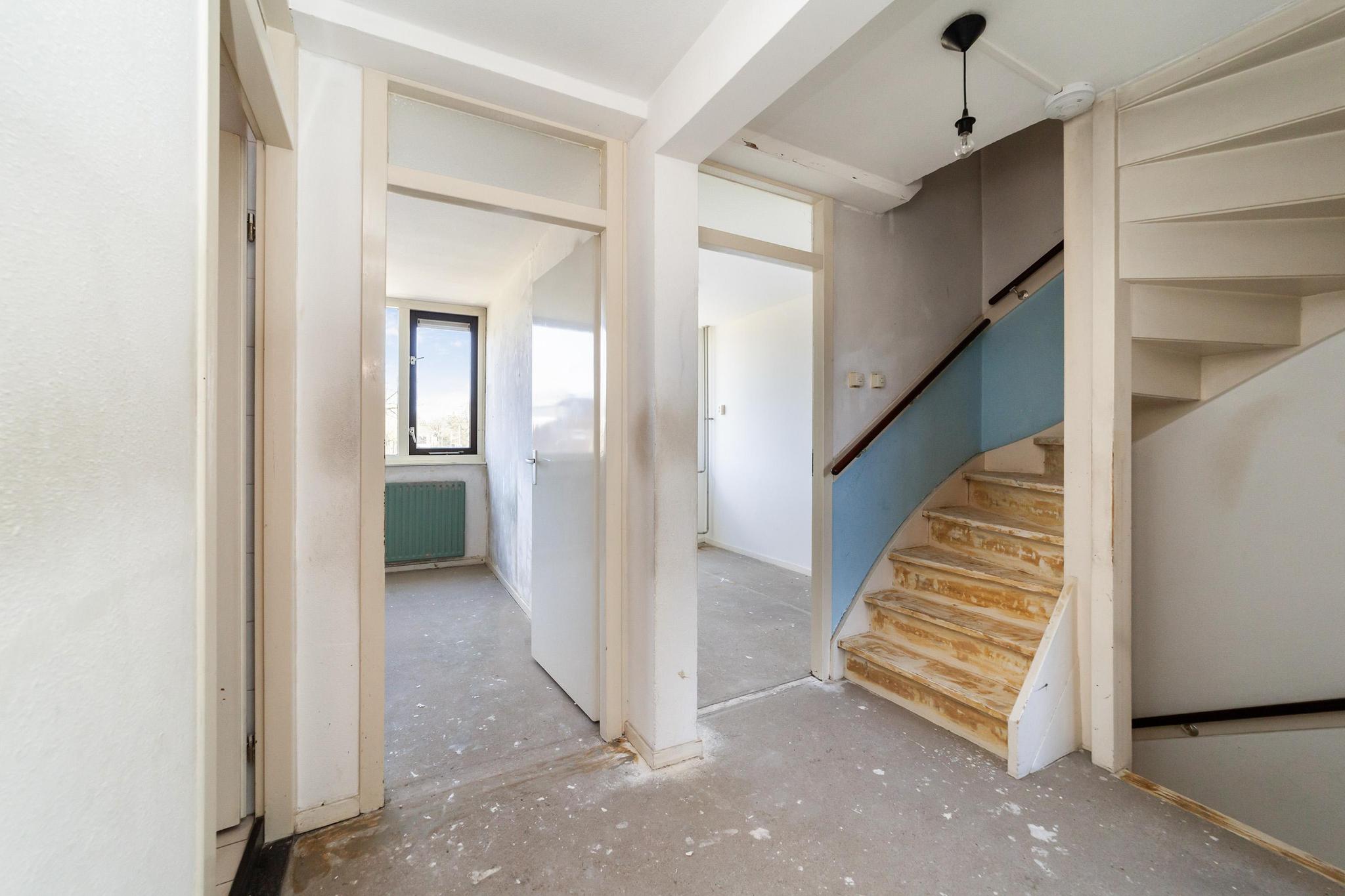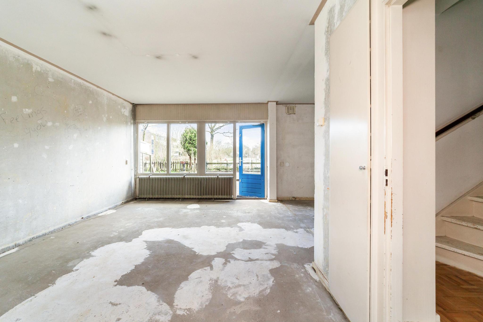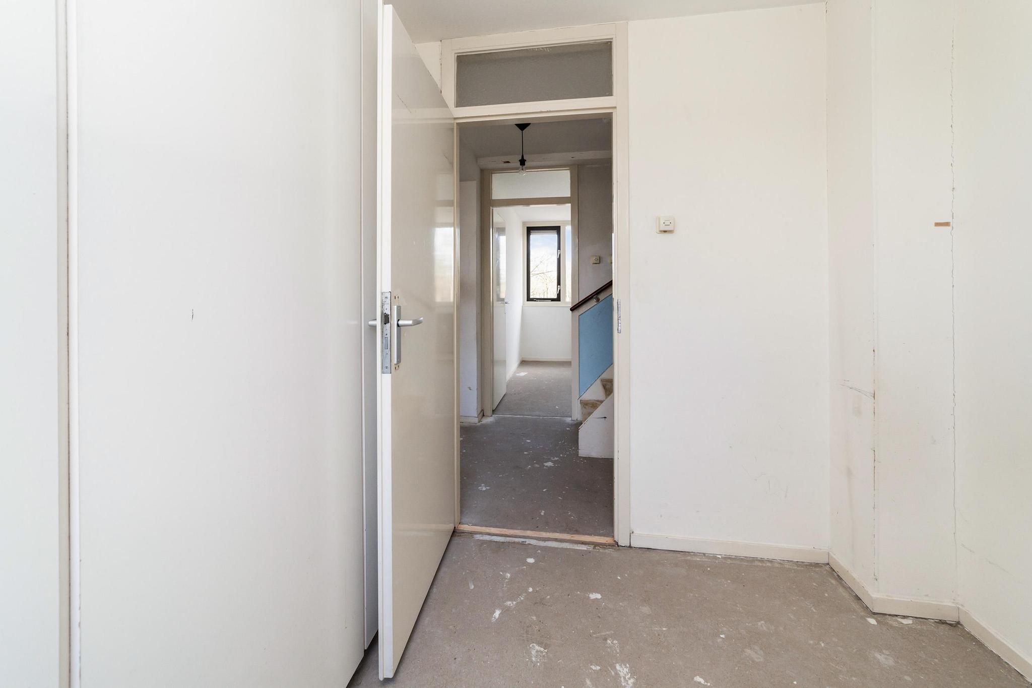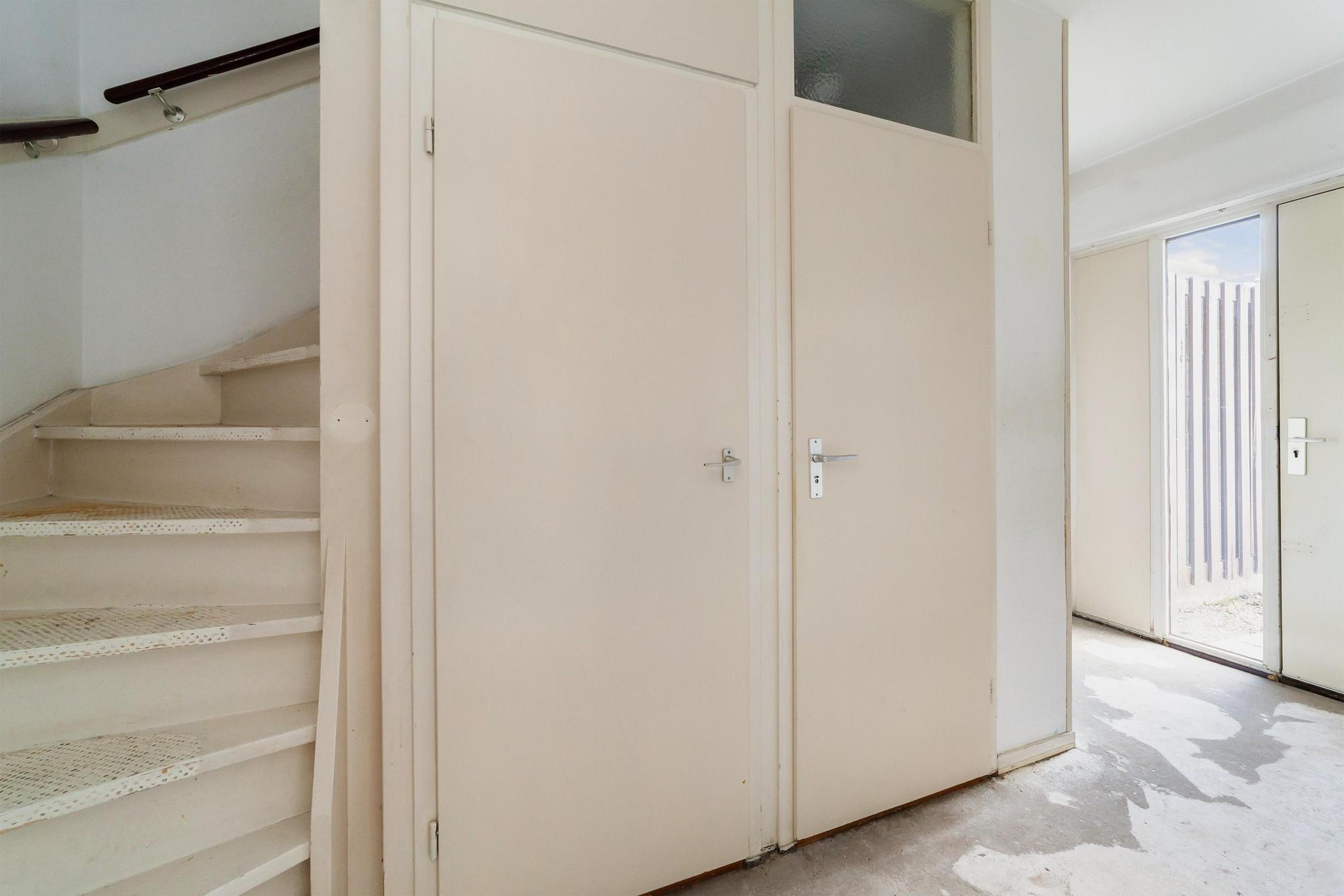 Entree, ruime hal met de meterkast, praktische bergkasten en het toilet met fonteintje. De speelse L-vormige woonkamer met half open keuken zonder keukenblok en vanuit de woonkamer is er toegang tot de achtertuin.