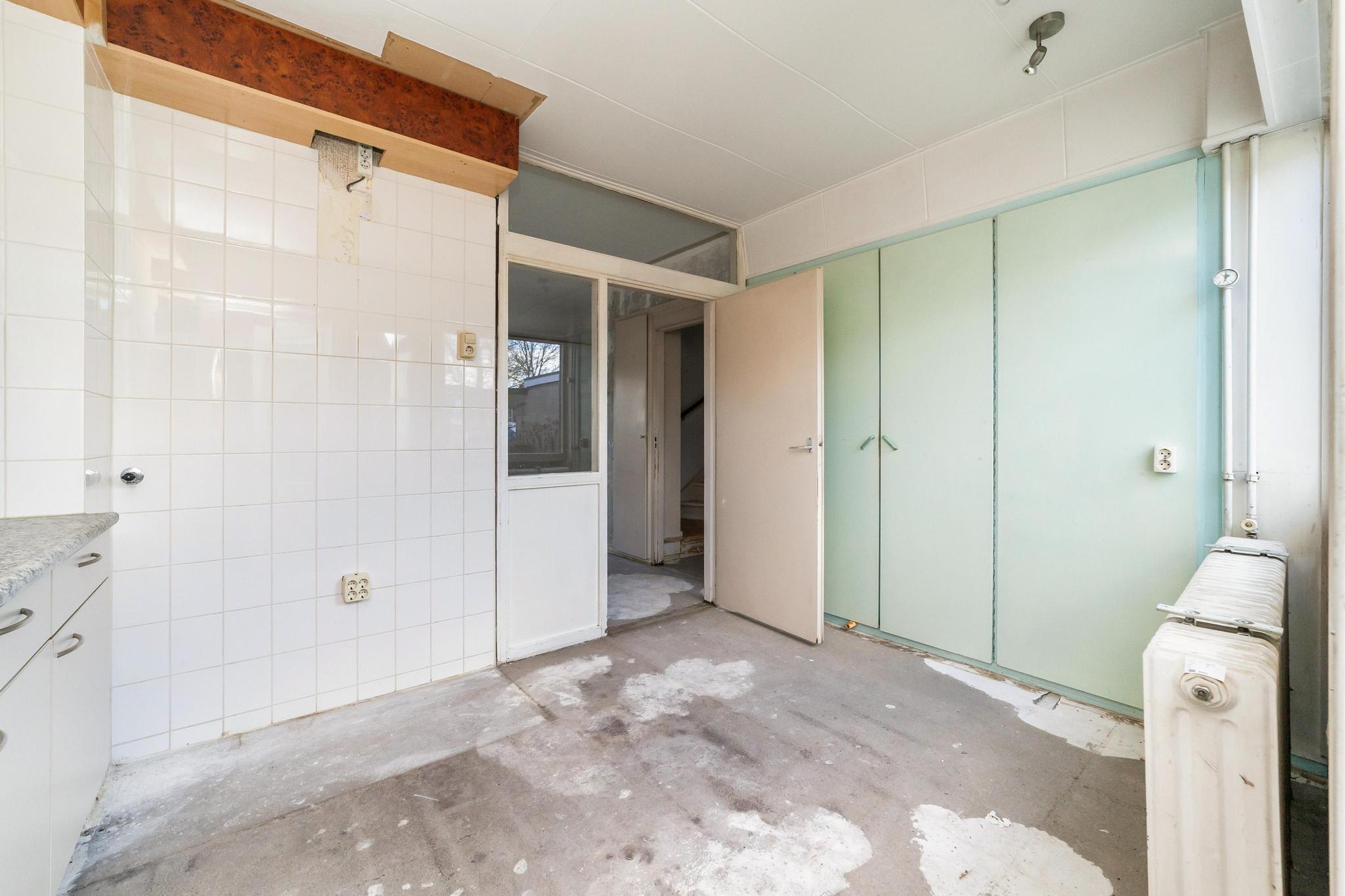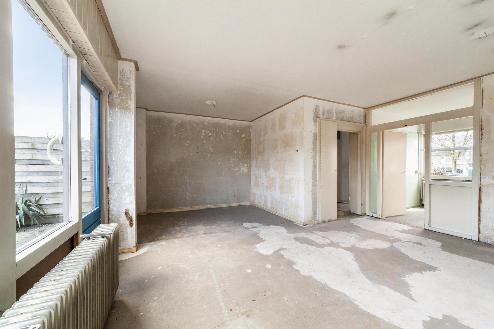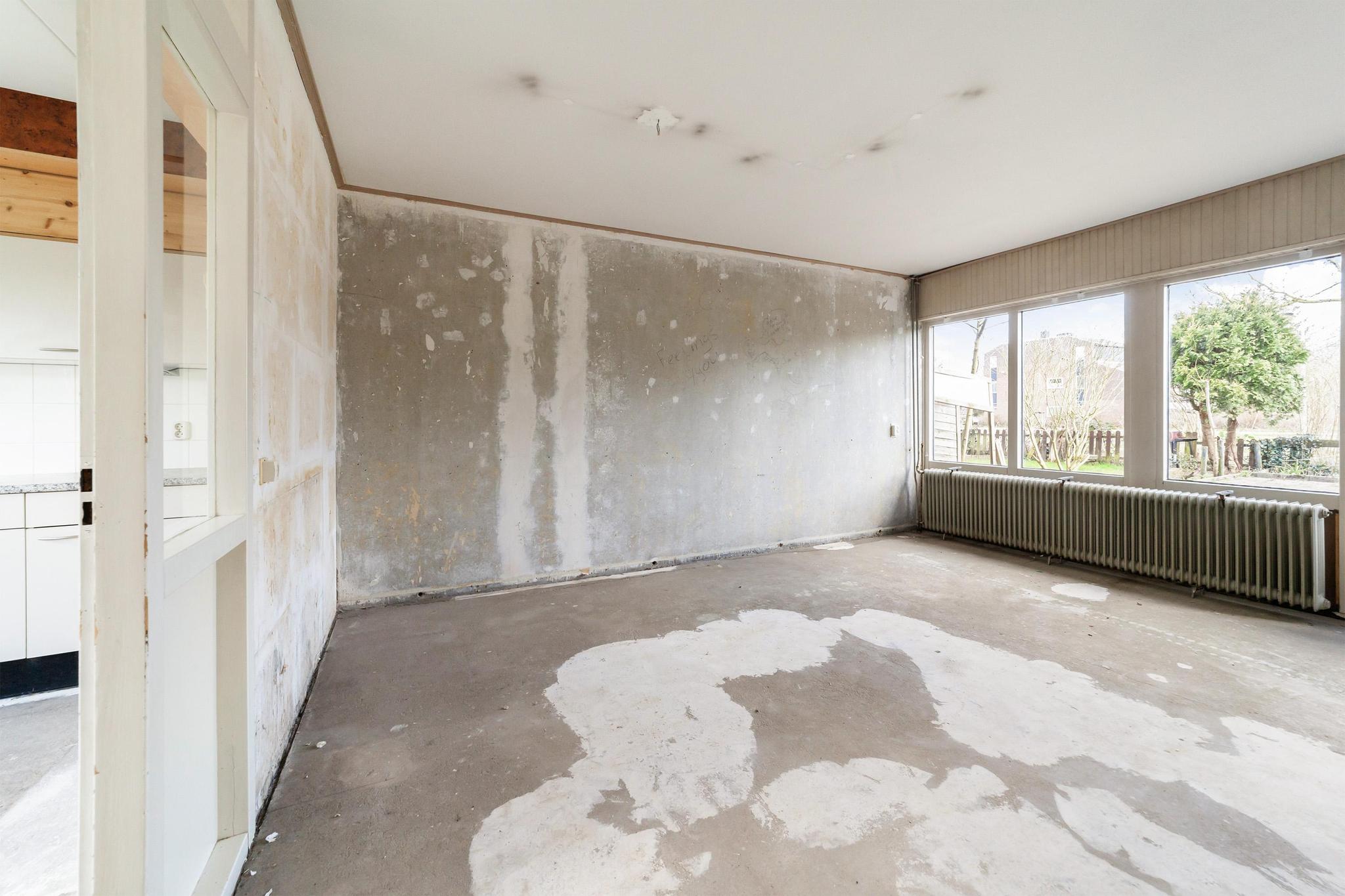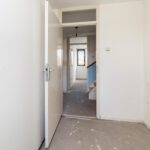 Entree, ruime hal met de meterkast, praktische bergkasten en het toilet met fonteintje. De speelse L-vormige woonkamer met half open keuken zonder keukenblok en vanuit de woonkamer is er toegang tot de achtertuin.