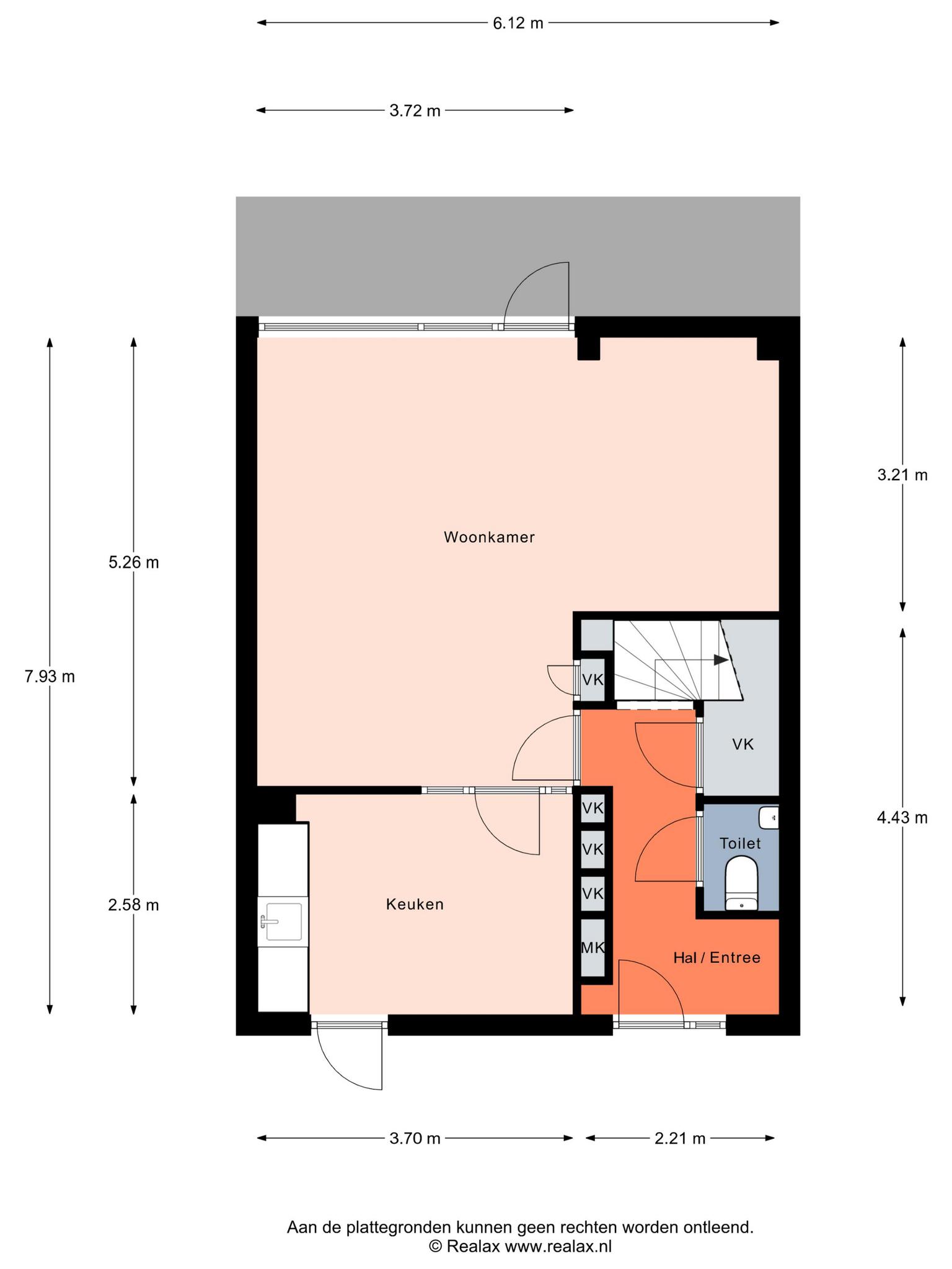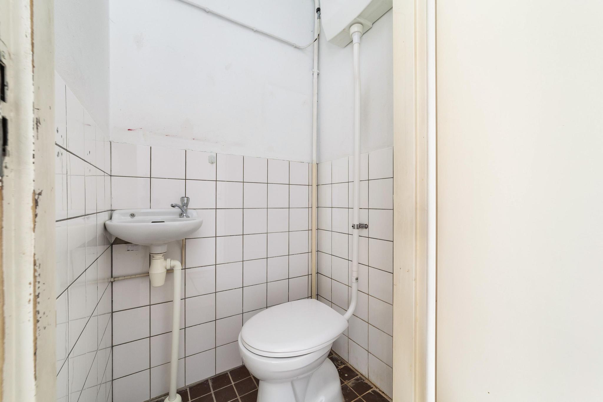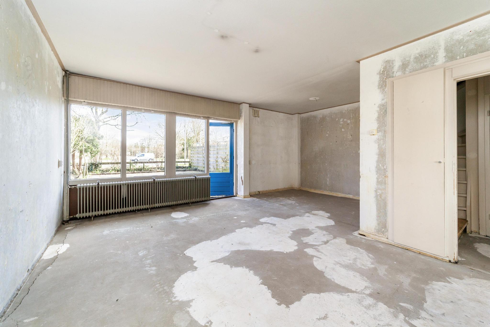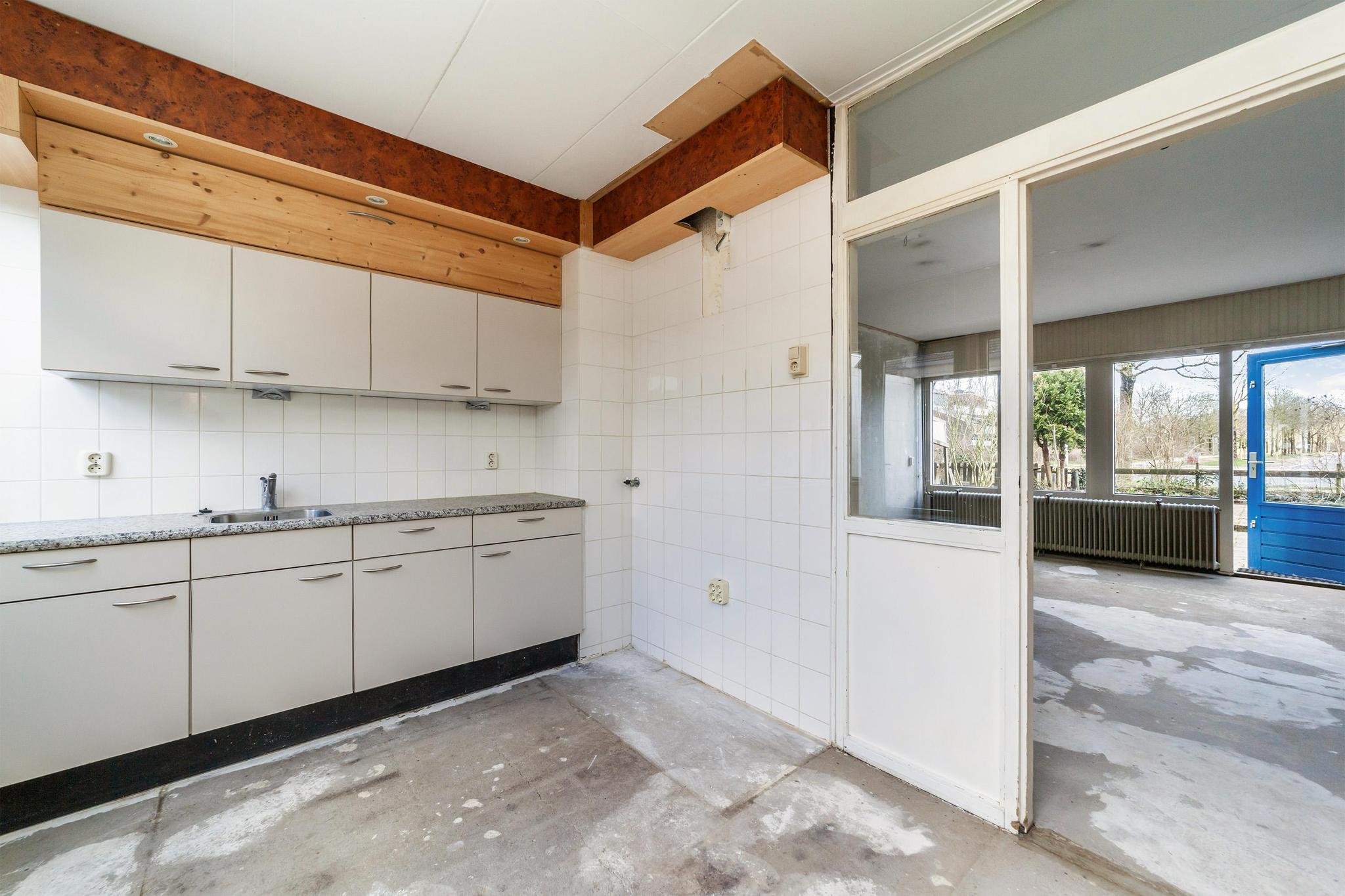Entree, ruime hal met de meterkast, praktische bergkasten en het toilet met fonteintje. De speelse L-vormige woonkamer met half open keuken zonder keukenblok en vanuit de woonkamer is er toegang tot de achtertuin.