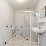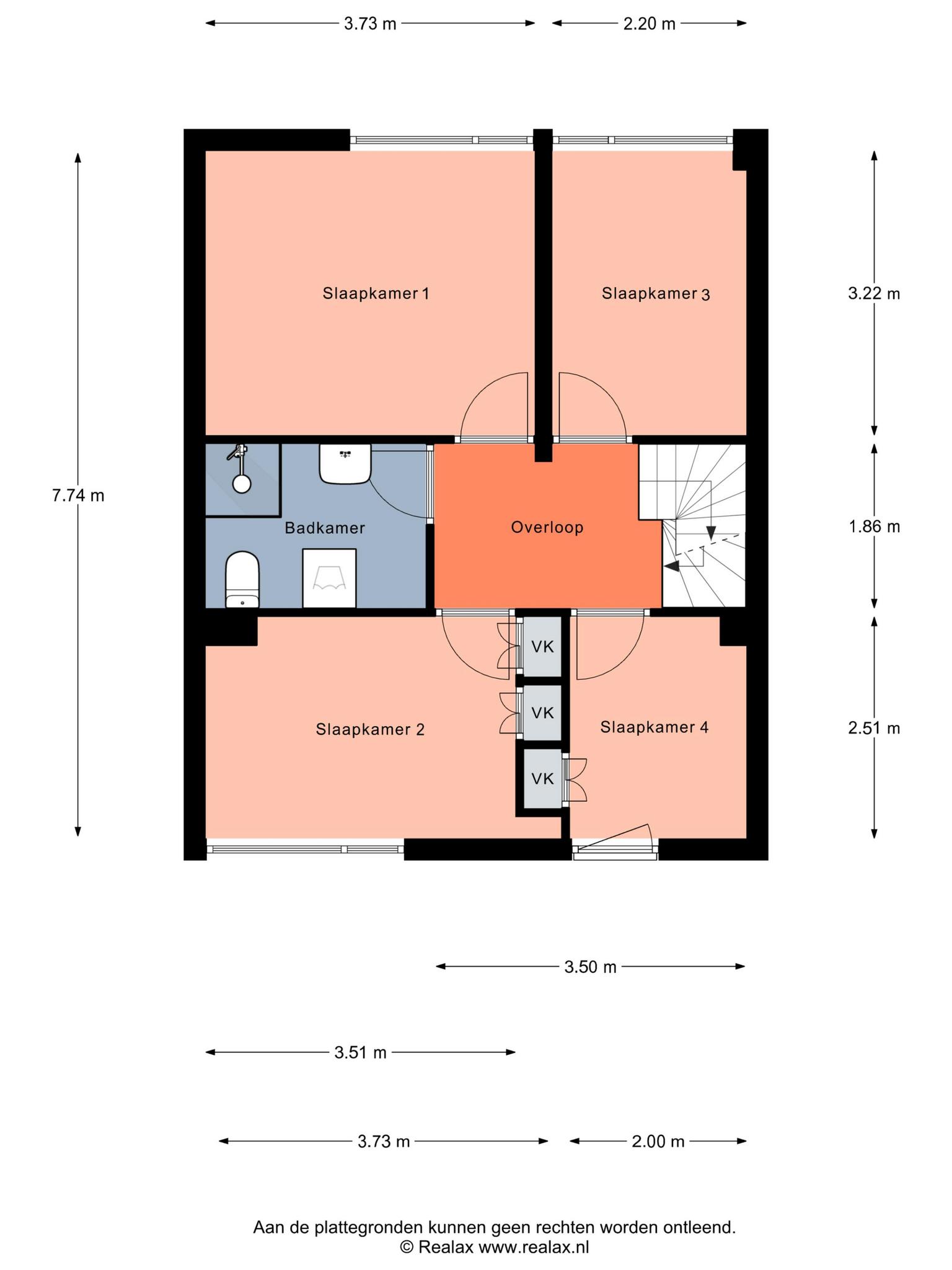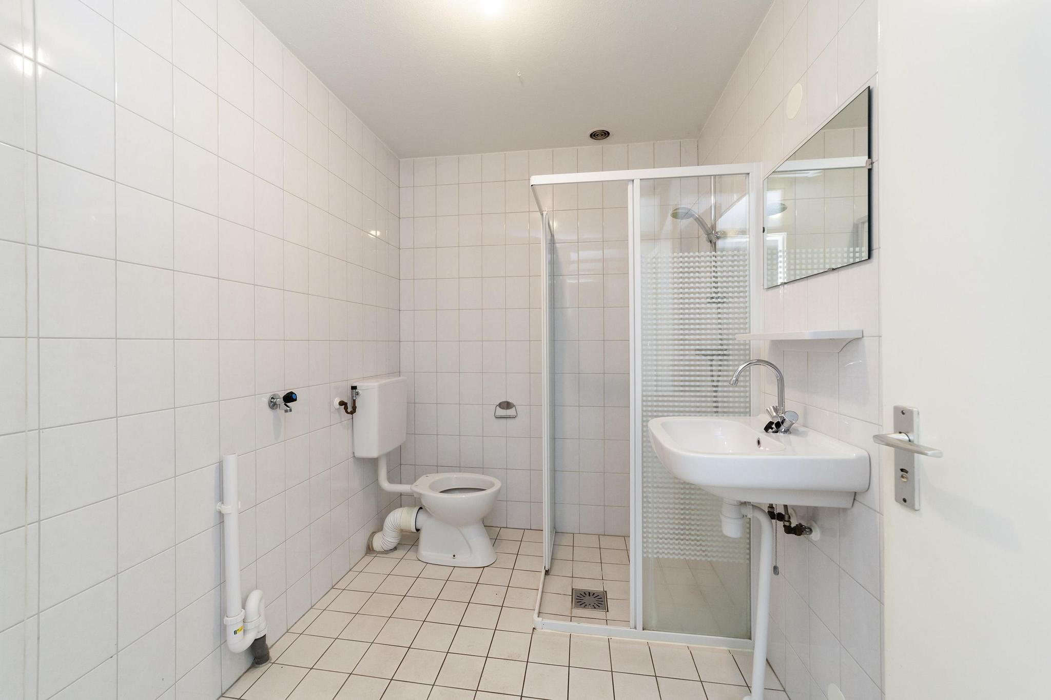 Overloop, 4 slaapkamers en badkamer met douche, wastafel en 2e toilet.