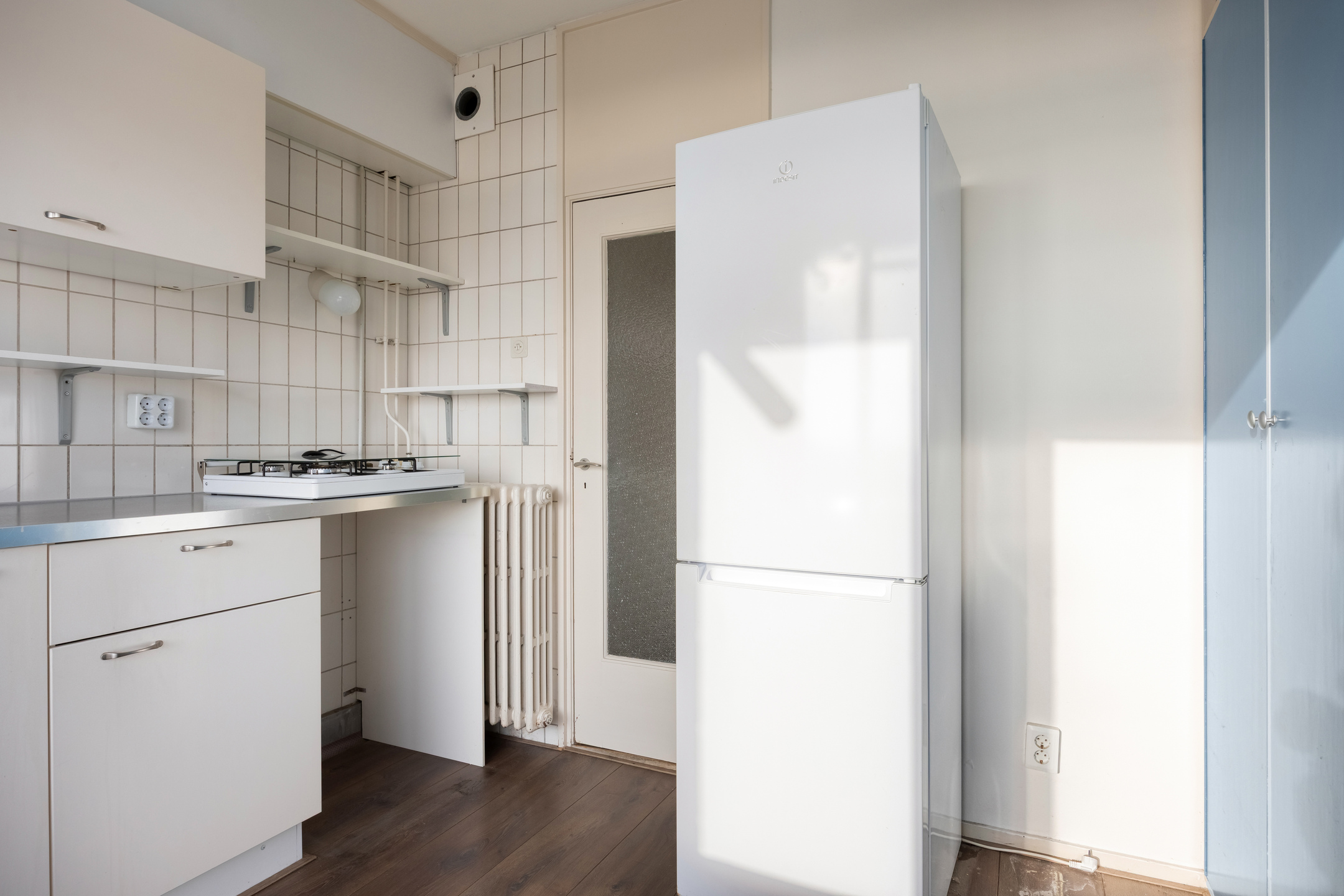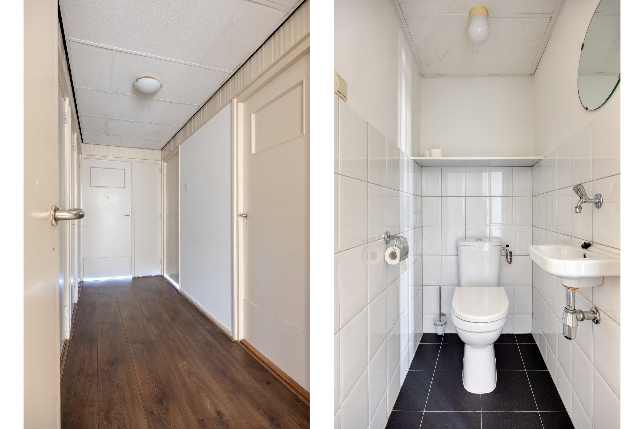 De ruime hal vormt het centrale punt van de woning en geeft toegang tot alle vertrekken. Aan de voorzijde bevindt zich de lichte woonkamer en dichte keuken. De keuken is uitgevoerd met een net keukenblok voorzien van een gaskookplaat en biedt toegang tot het inpandige balkon. De woonkamer is dankzij de grote raampartijen heerlijk licht en biedt, net als het balkon, een levendig uitzicht over het stadscentrum van Arnhem.