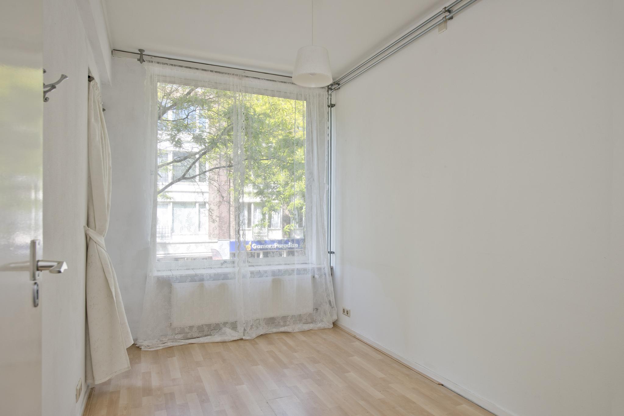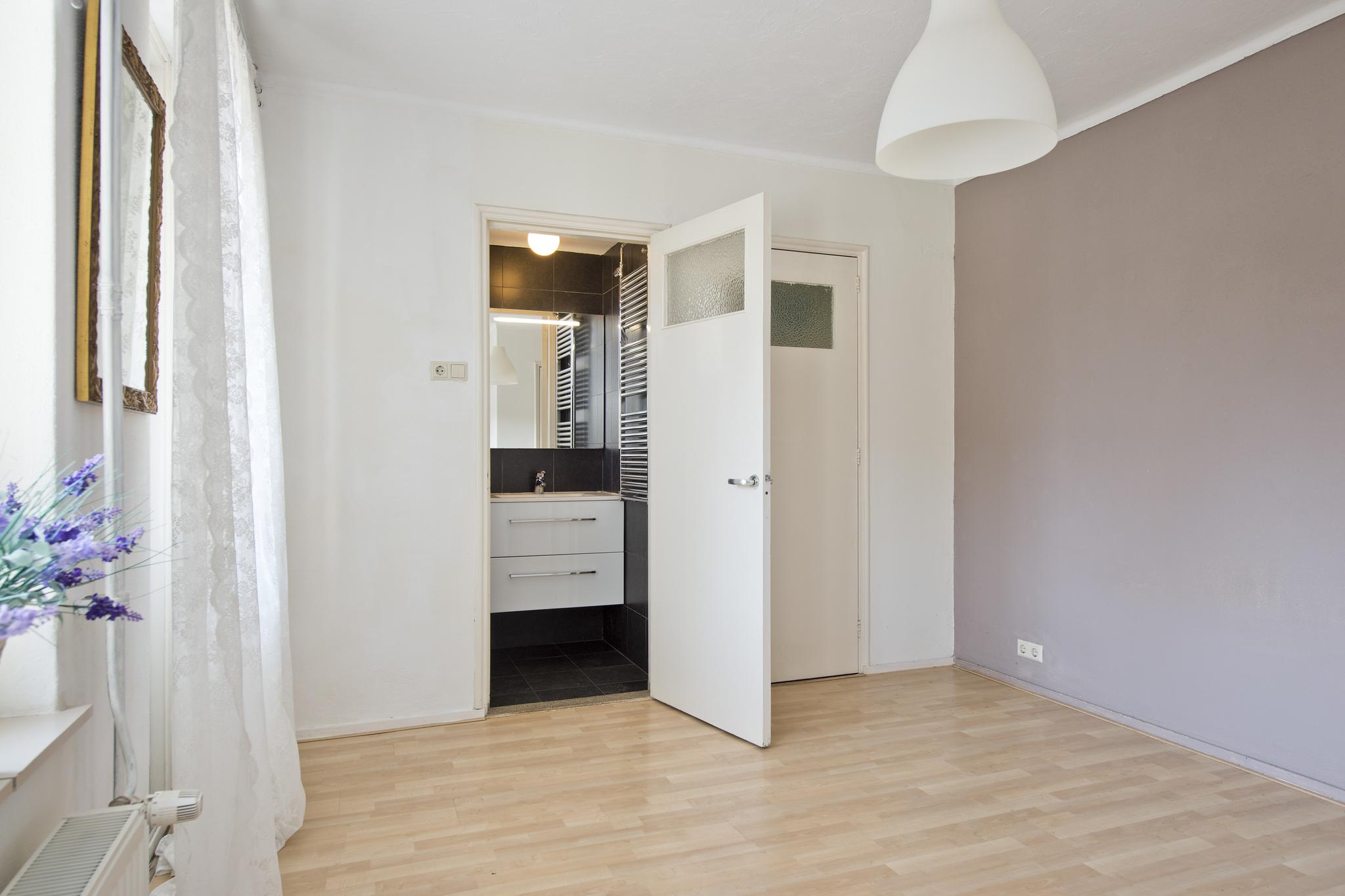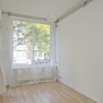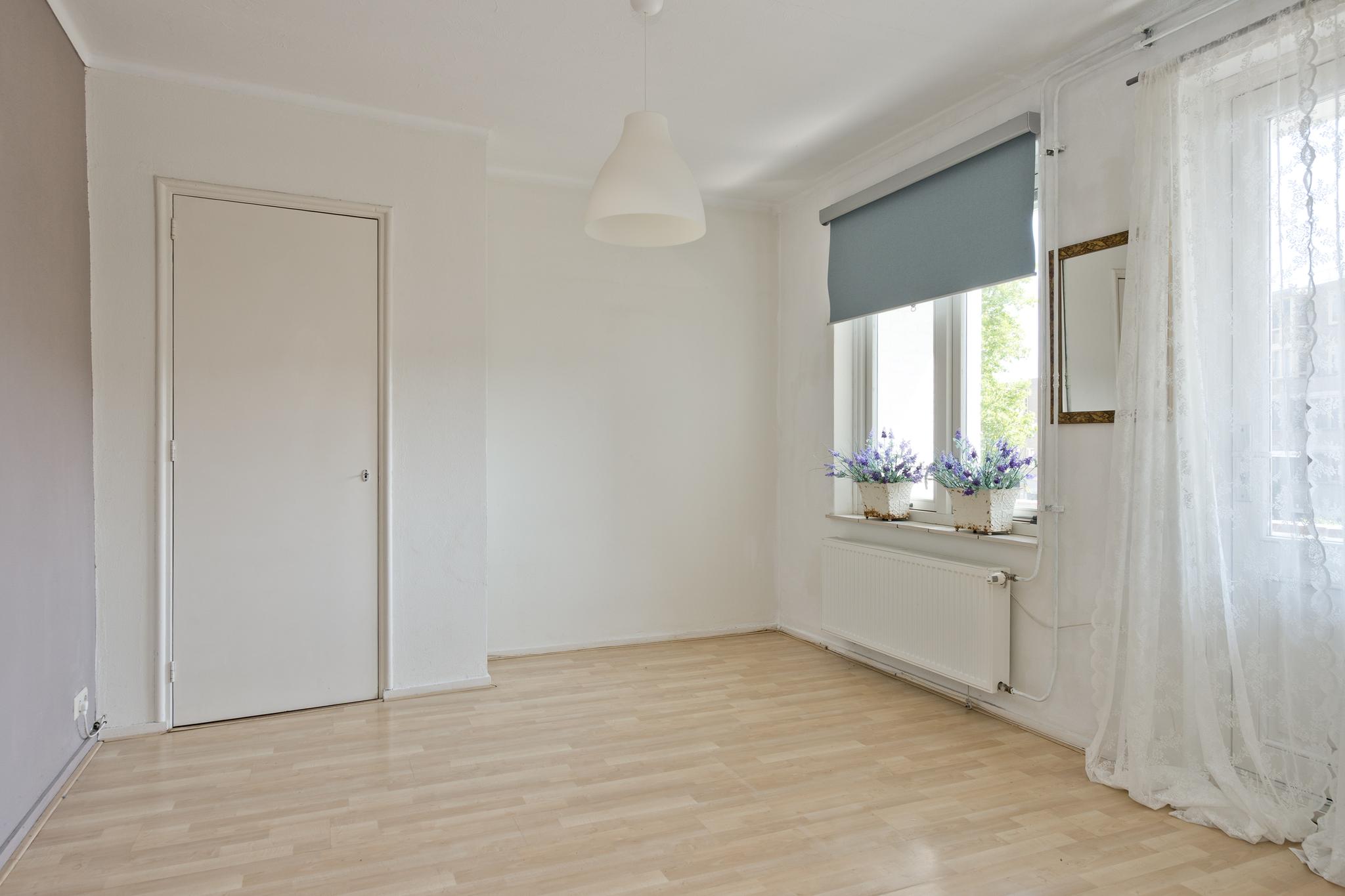 De woonkamer is super licht door de twee grote vierkante ramen, de lichte laminaatvloer en de witte muren en plafonds. De schouw geeft deze ruimte extra sfeer. Vanuit de woonkamer gaat u naar het balkon aan de voorzijde.