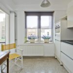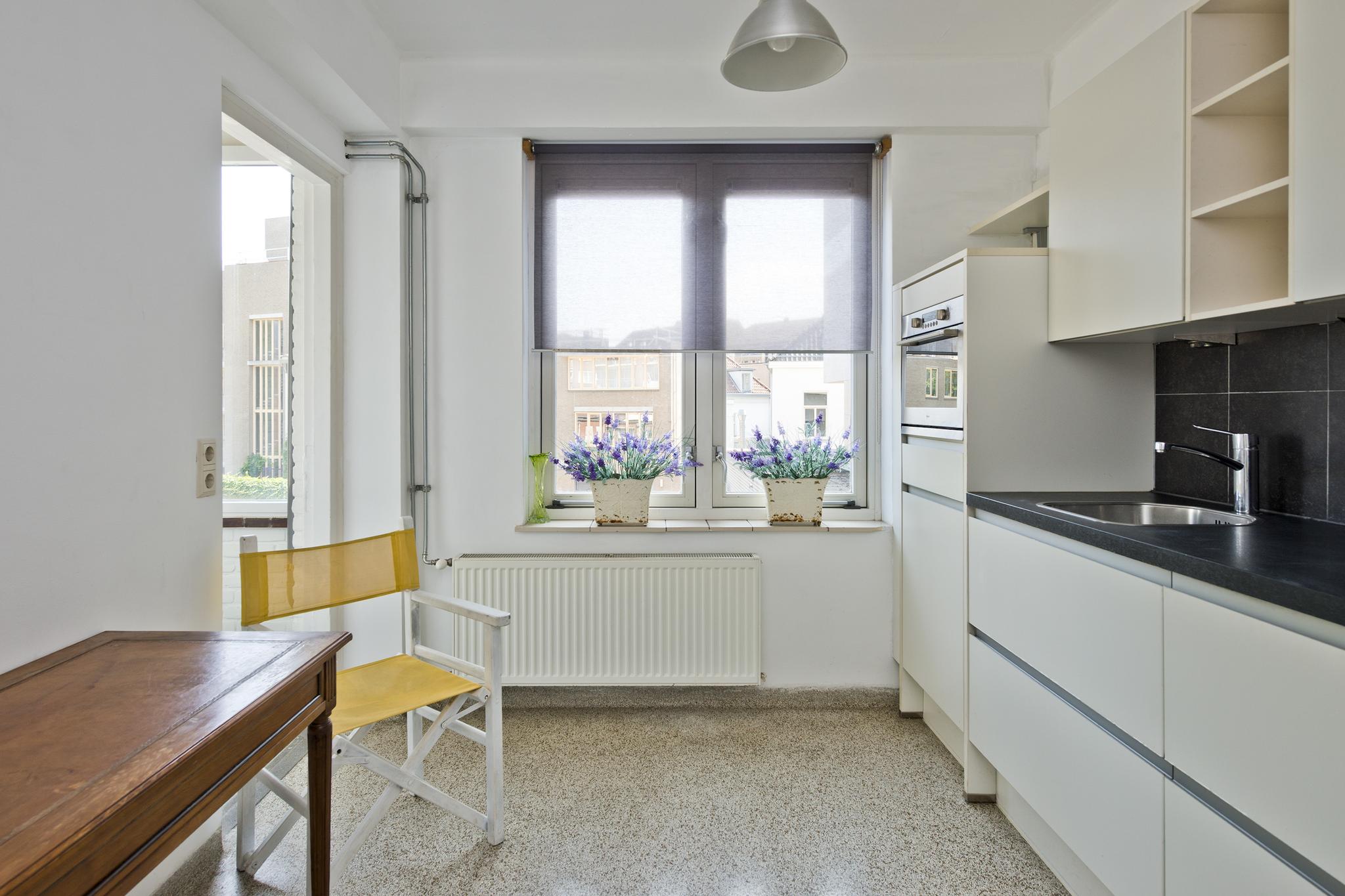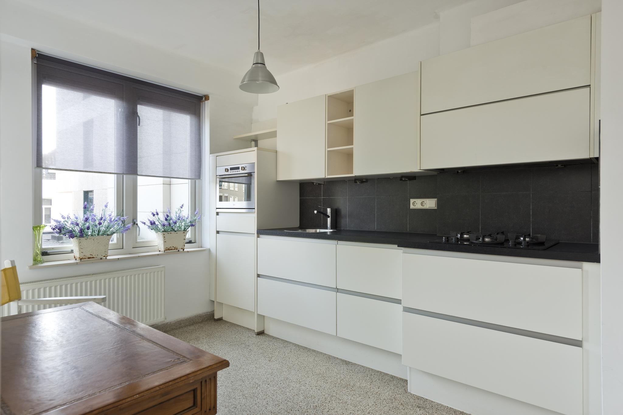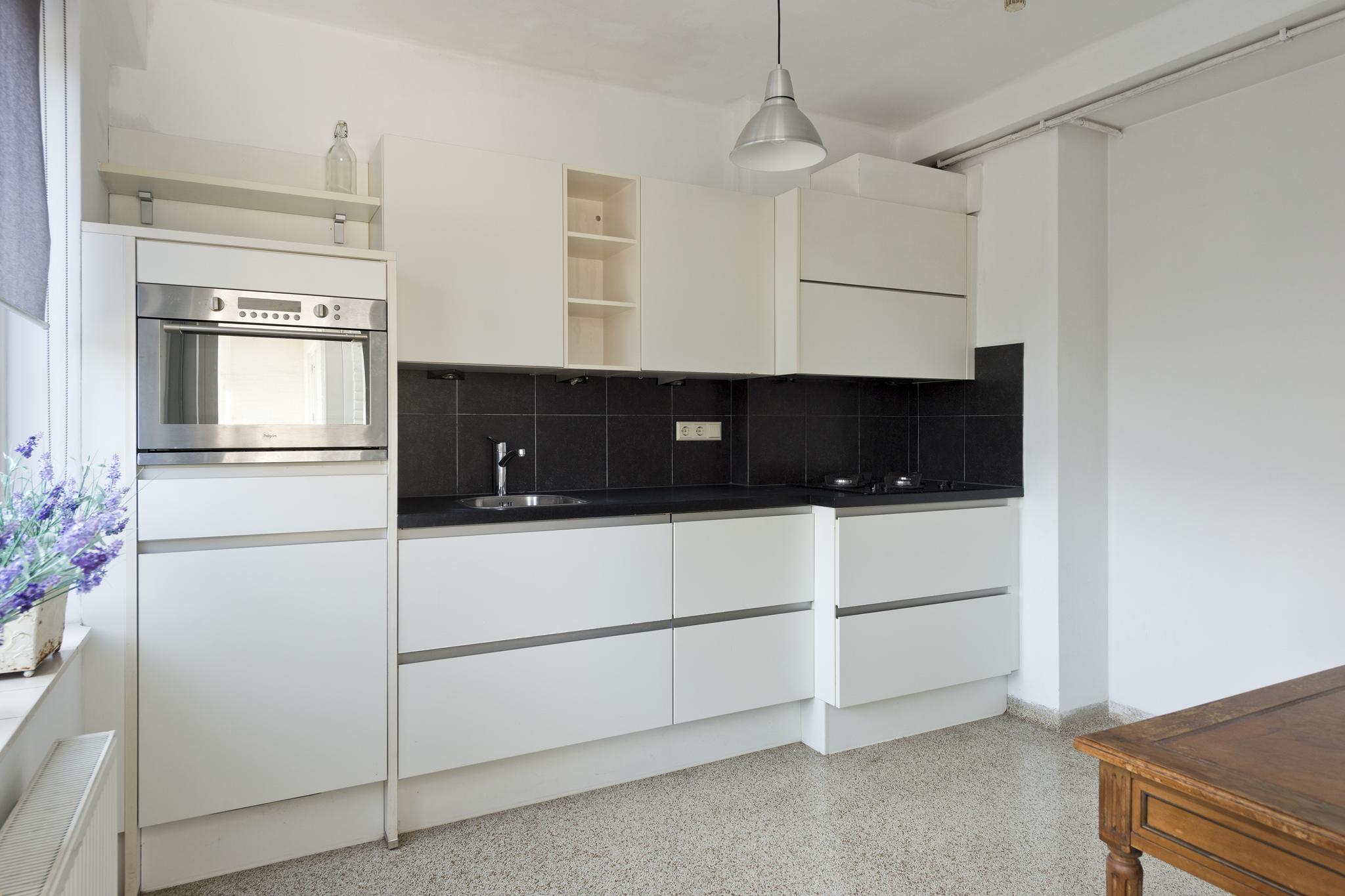 De keuken is modern en compleet ingericht met witte kasten, gaskookplaat, afzuigkap, vaatwasser, koelkast en oven. De sfeervolle terazzo vloer is kenmerkend voor de bouwtijd. Ook via de keuken loopt u naar het grootste balkon. Dat ligt op het zuiden