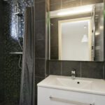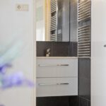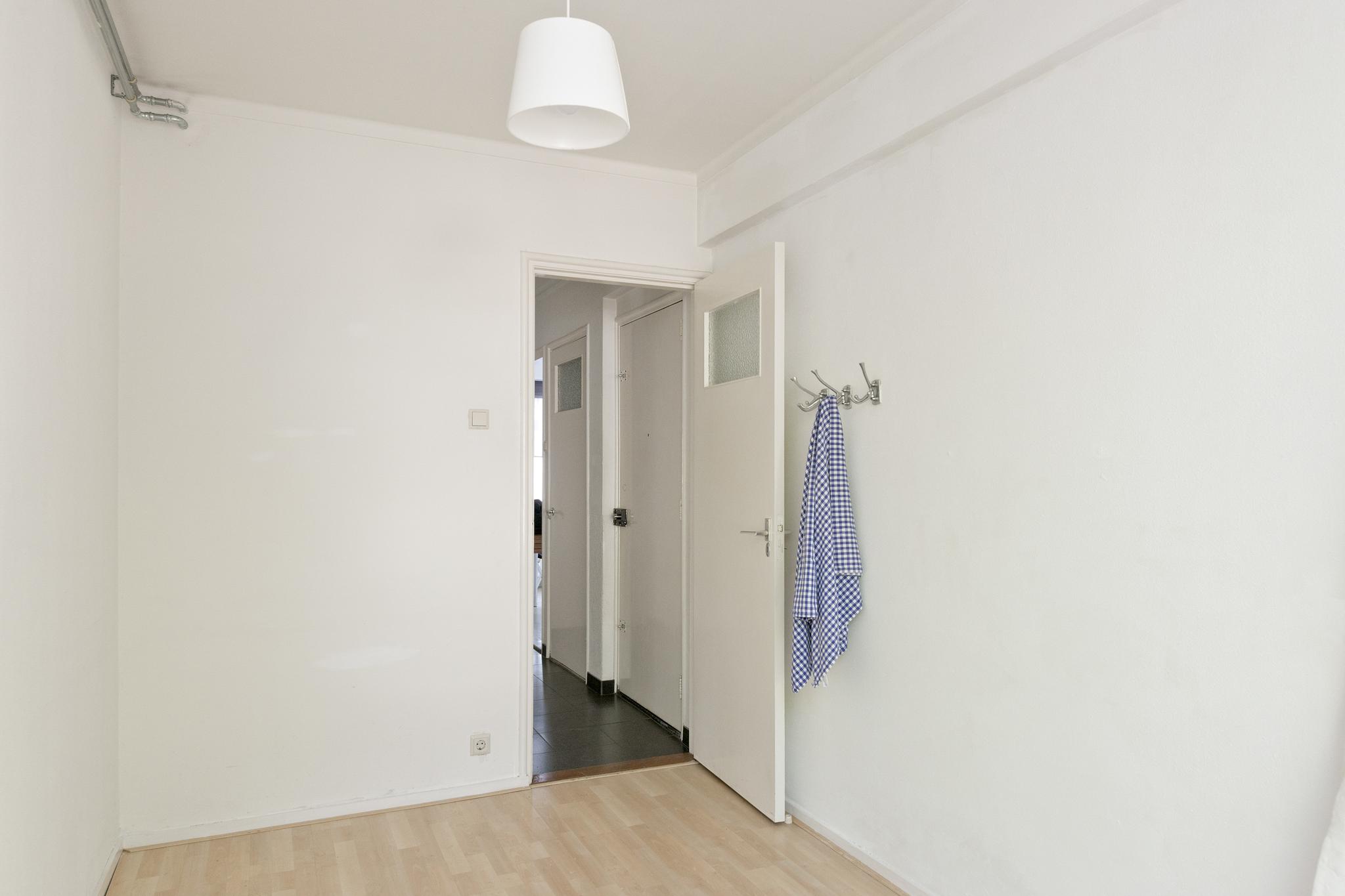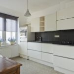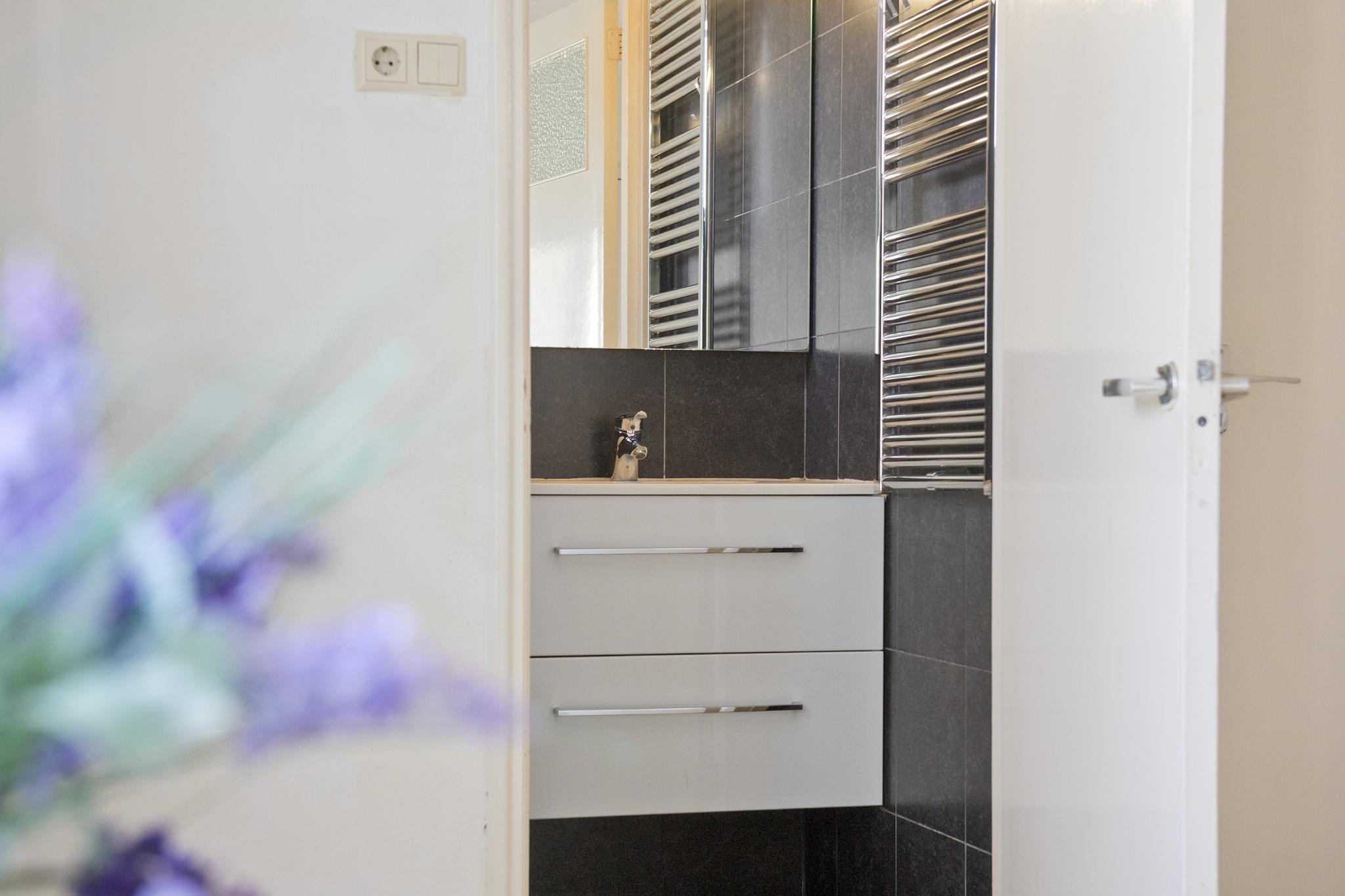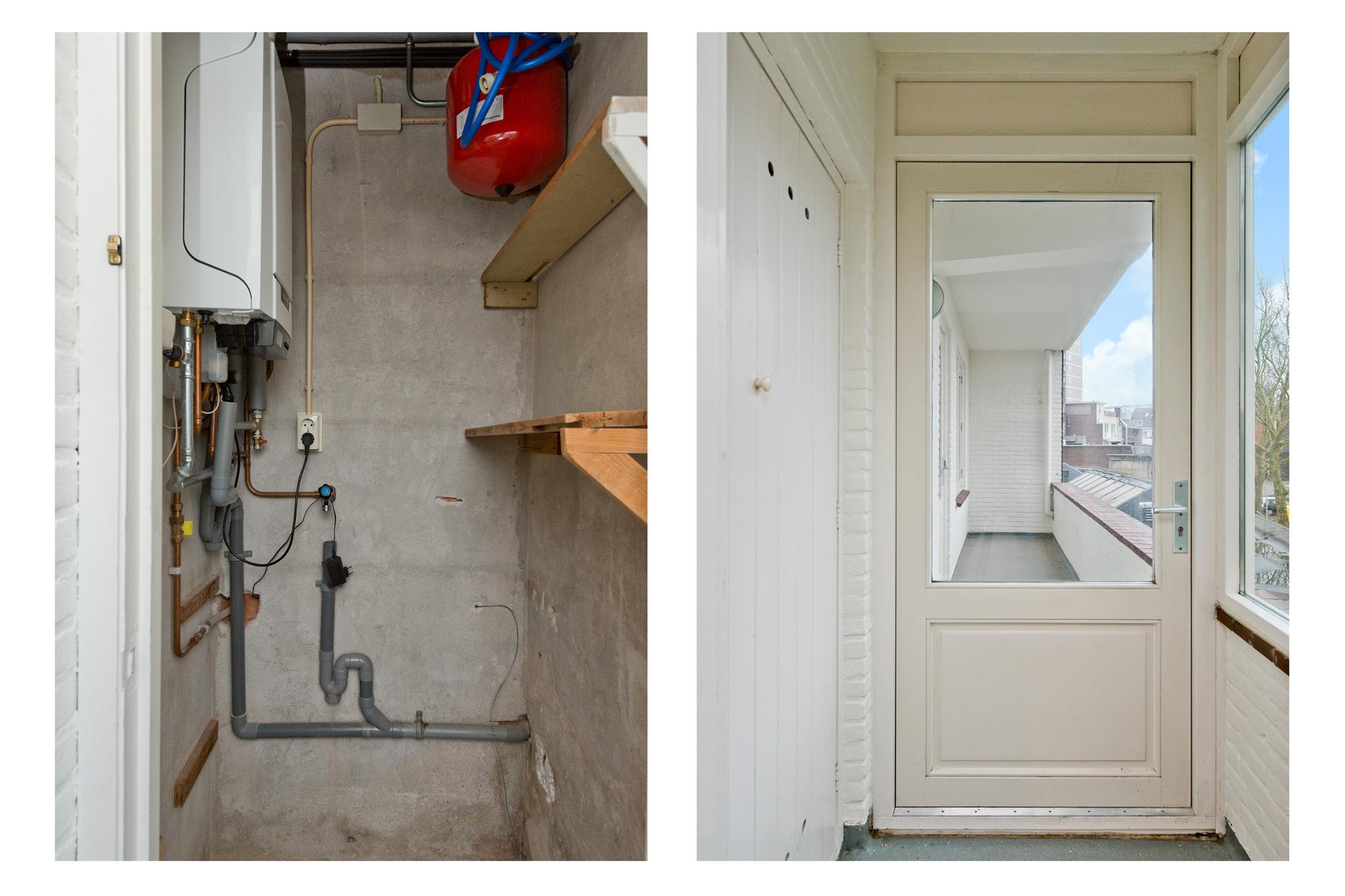 De keuken is modern en compleet ingericht met witte kasten, gaskookplaat, afzuigkap, vaatwasser, koelkast en oven. De sfeervolle terazzo vloer is kenmerkend voor de bouwtijd. Ook via de keuken loopt u naar het grootste balkon. Dat ligt op het zuiden