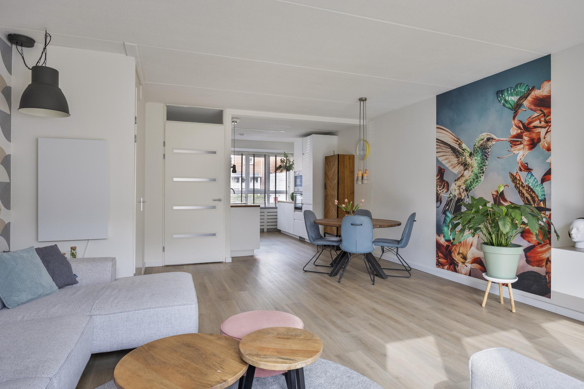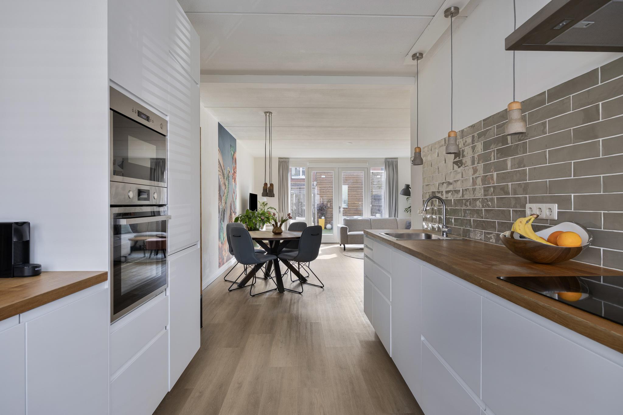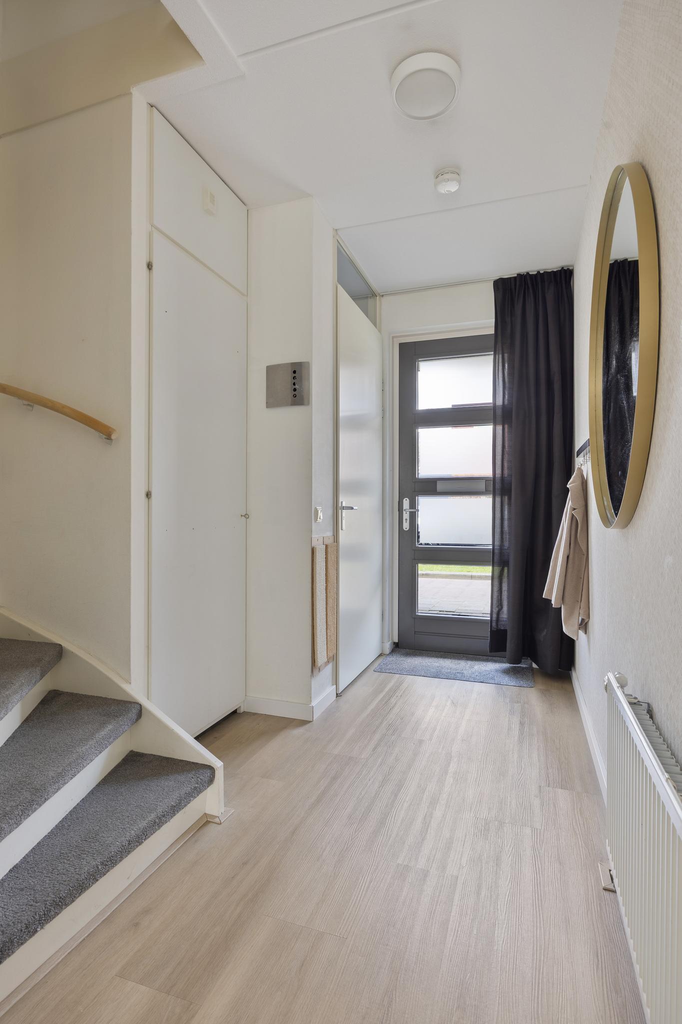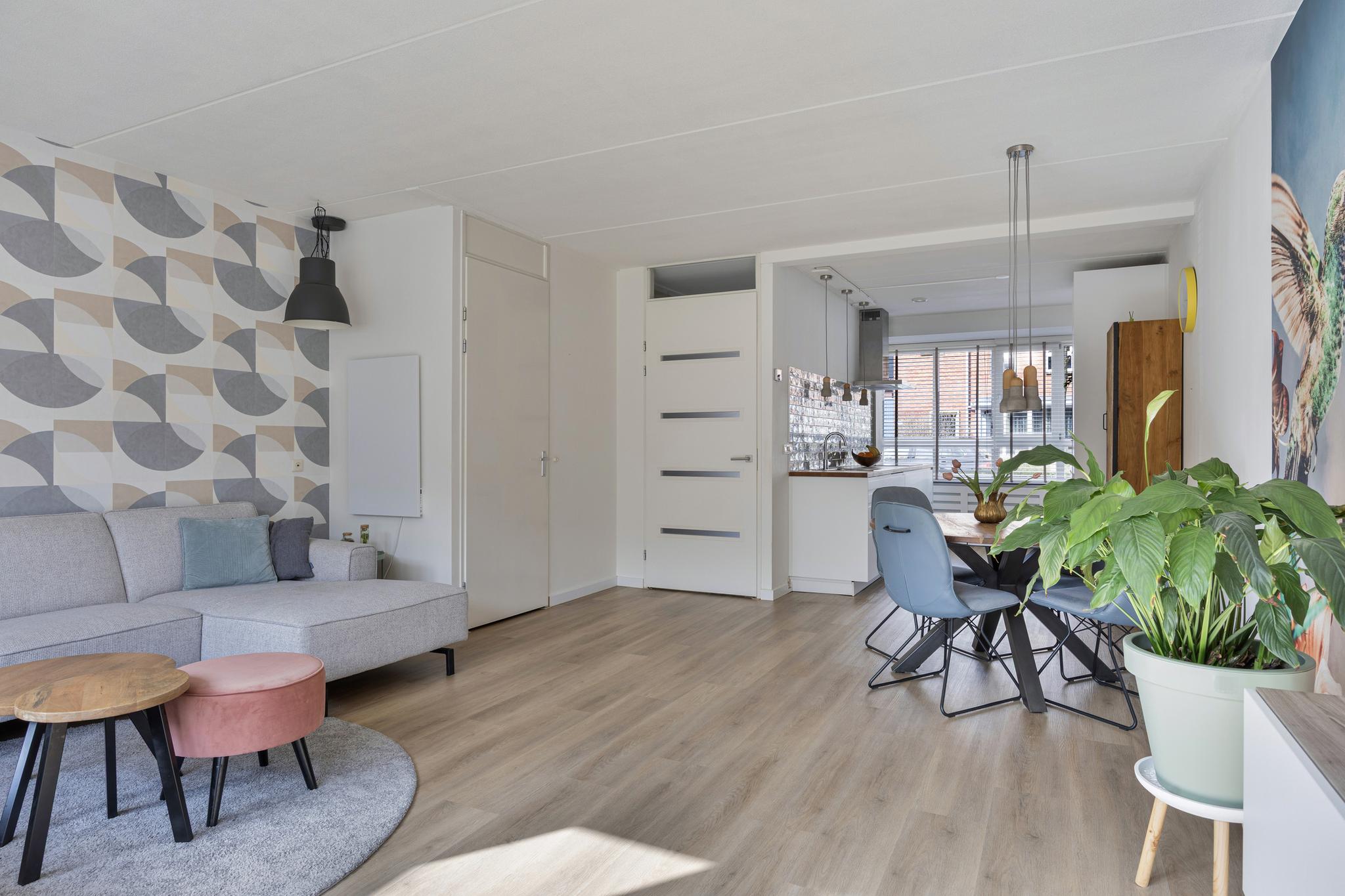 Begane grond: Entree, hal/gang, toilet met fonteintje, trapopgang met trapkast, een ruime woonkamer met moderne open keuken en openslaande deuren naar de tuin.