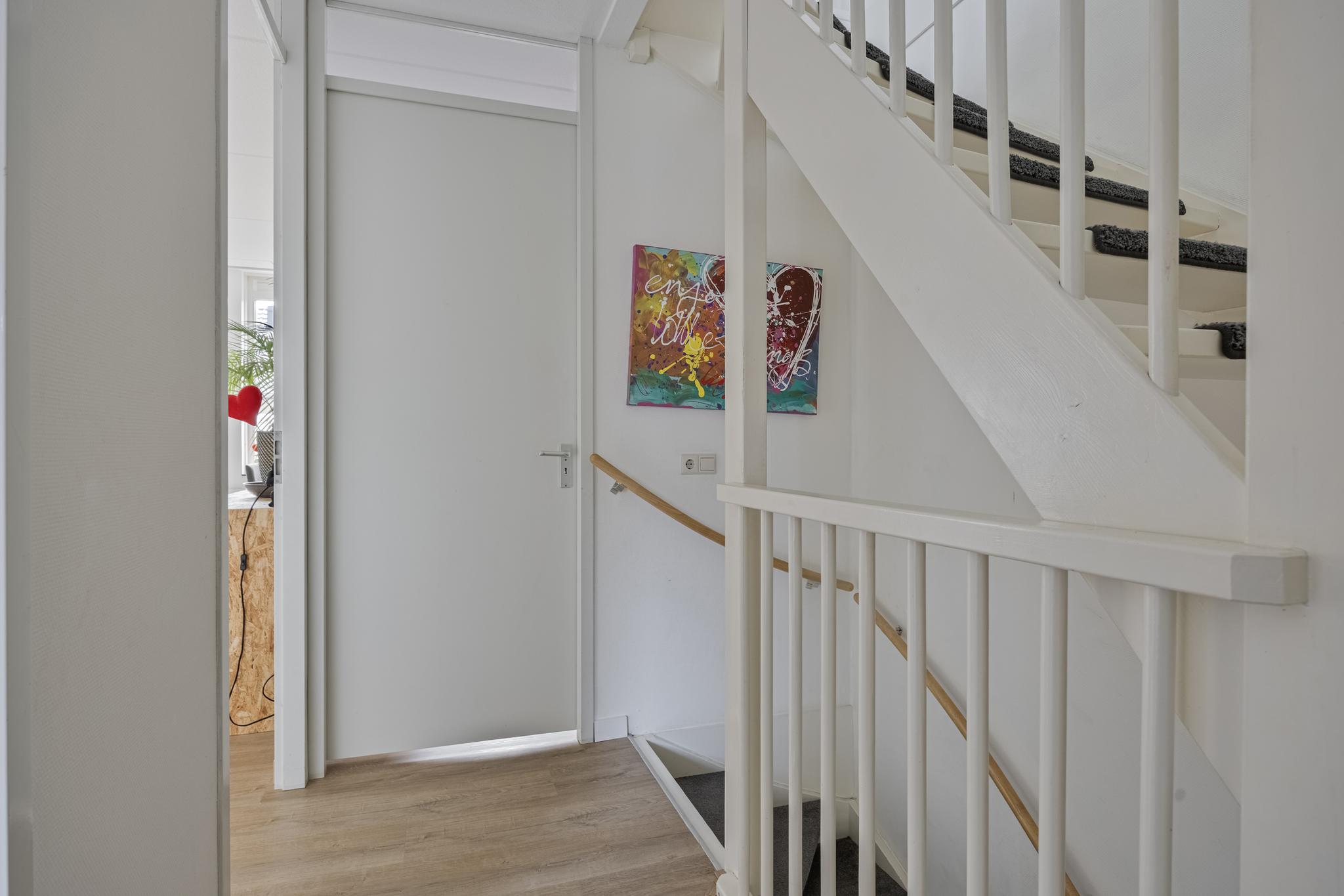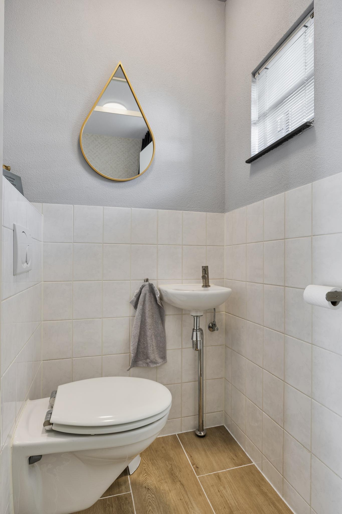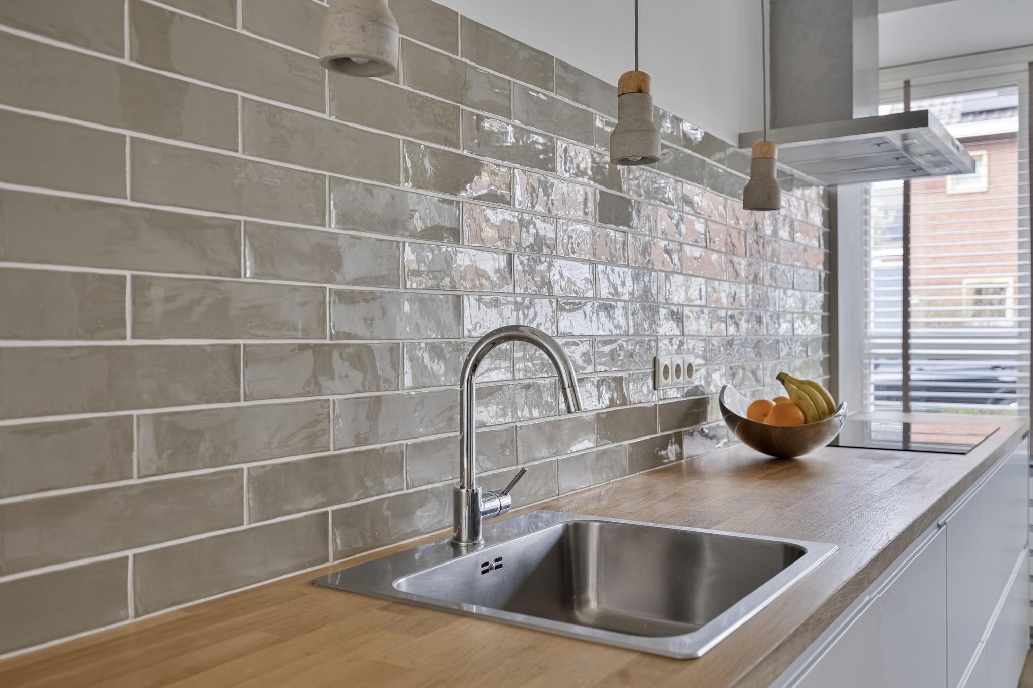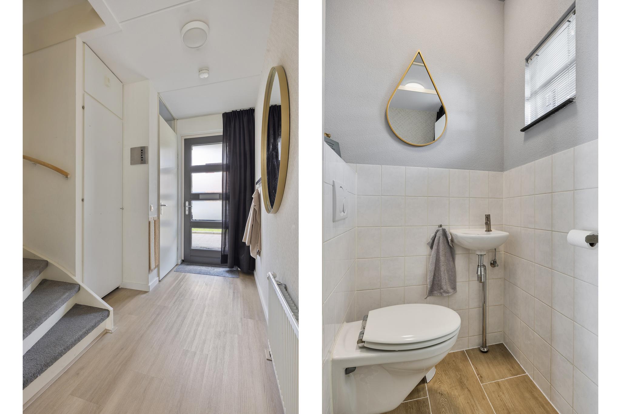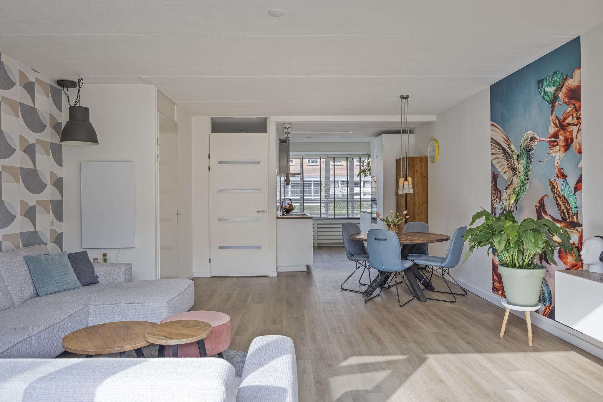 Begane grond: Entree, hal/gang, toilet met fonteintje, trapopgang met trapkast, een ruime woonkamer met moderne open keuken en openslaande deuren naar de tuin.