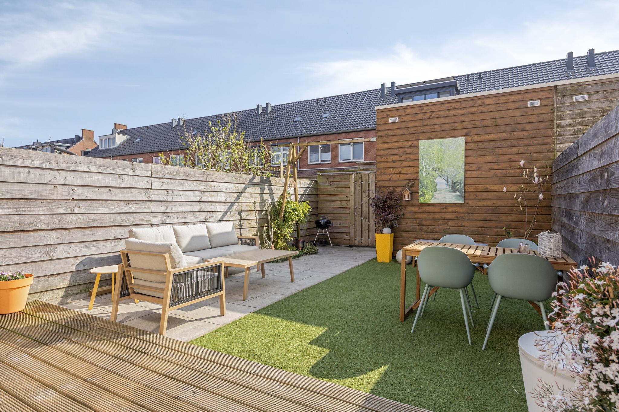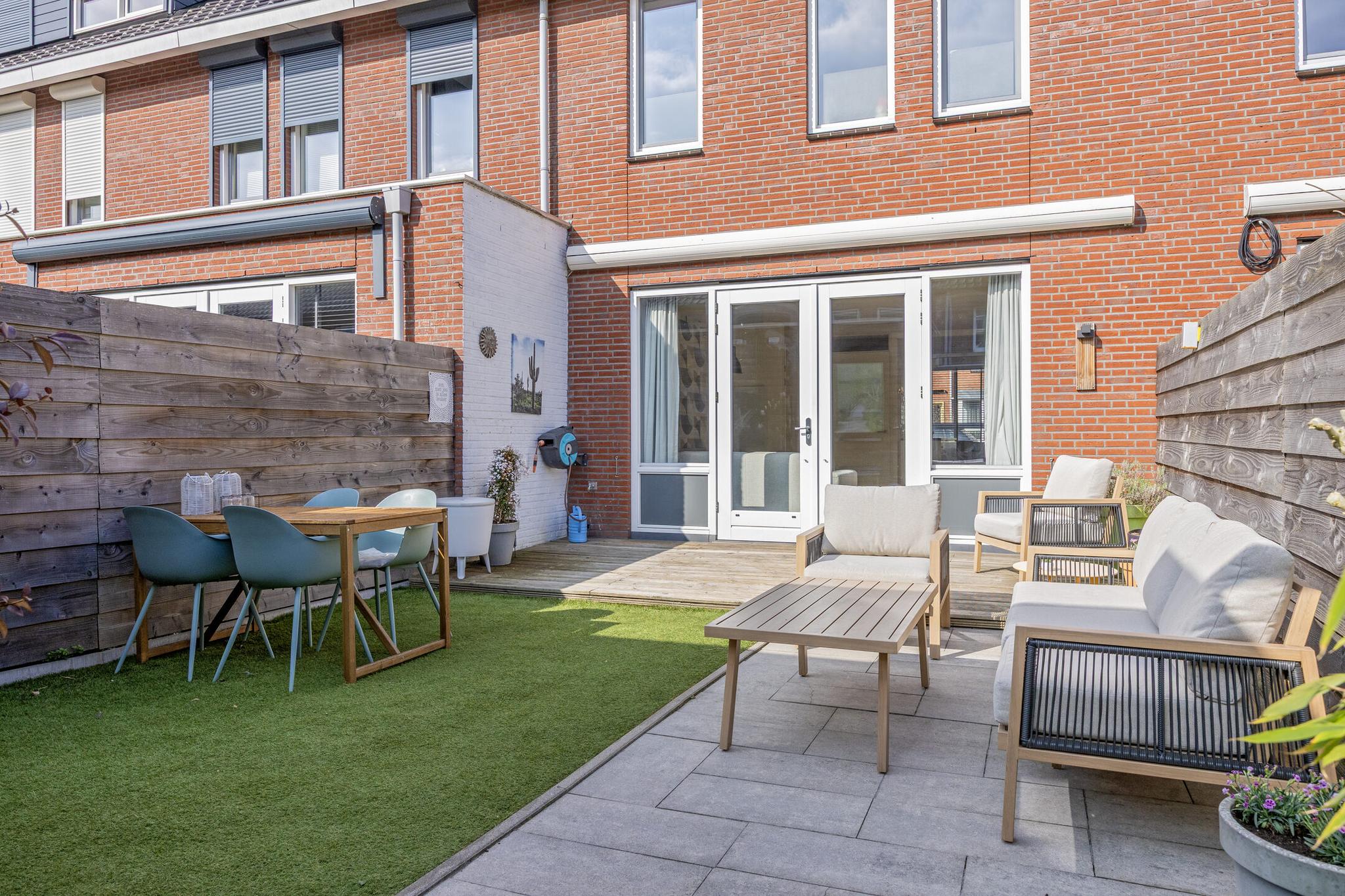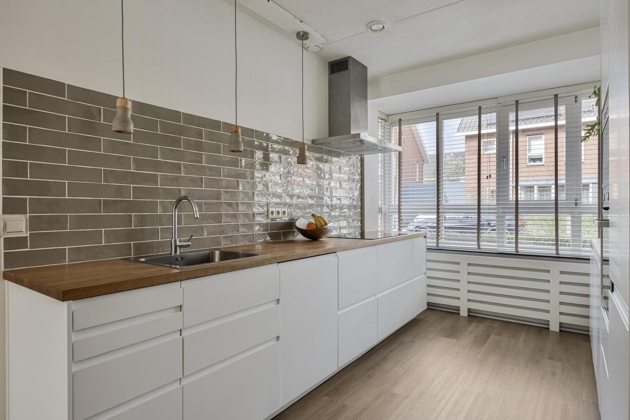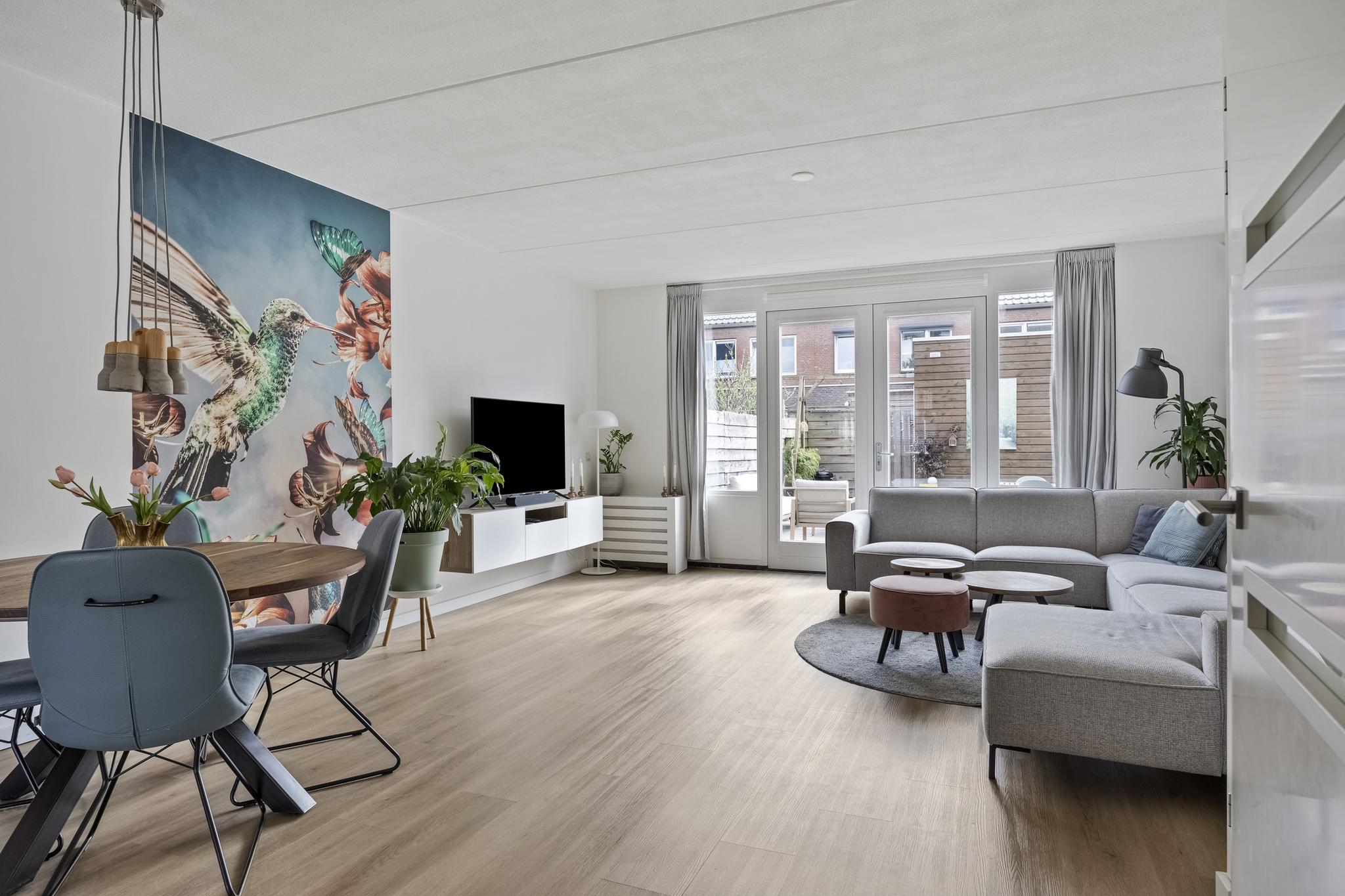 Begane grond: Entree, hal/gang, toilet met fonteintje, trapopgang met trapkast, een ruime woonkamer met moderne open keuken en openslaande deuren naar de tuin.