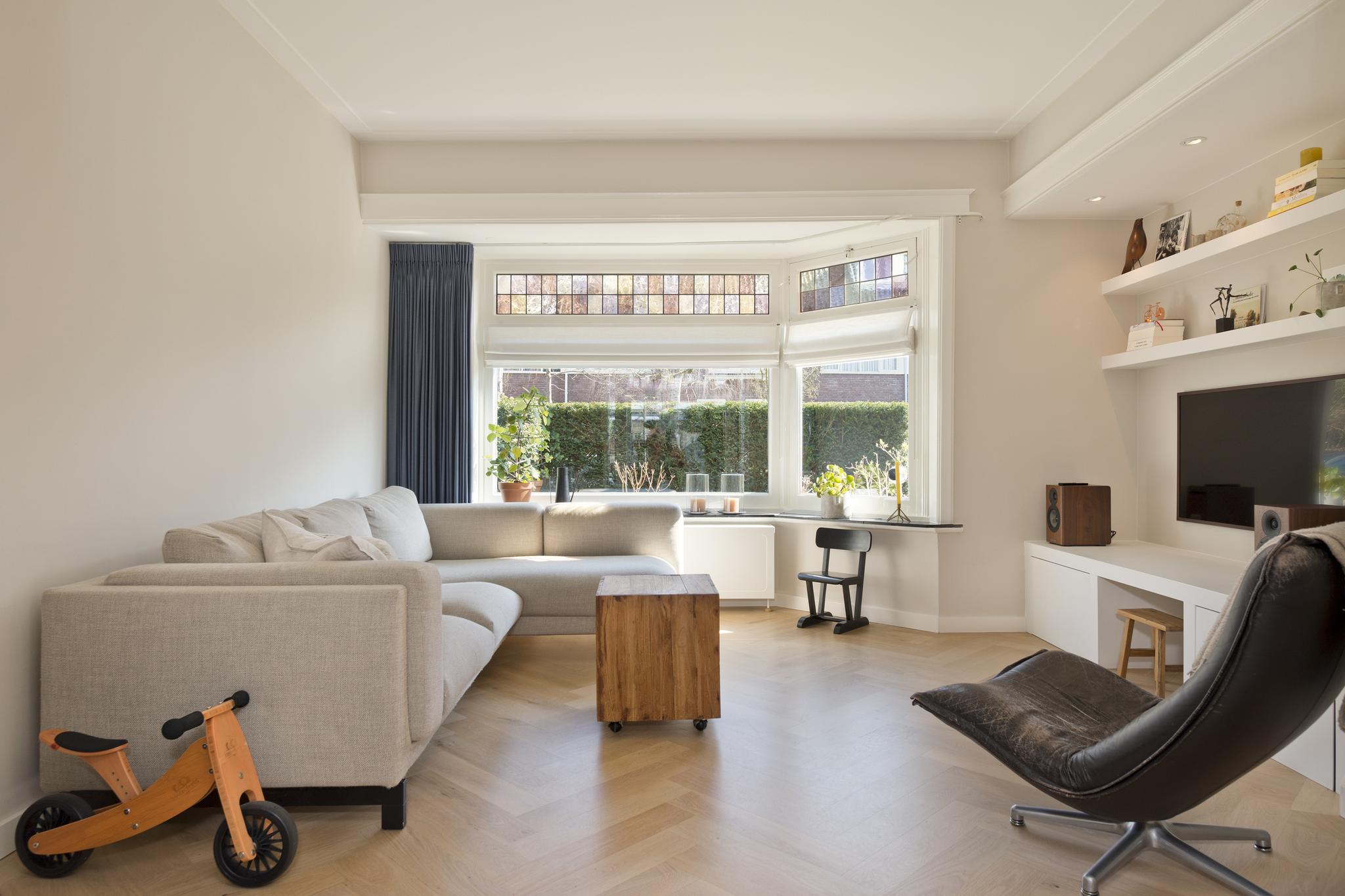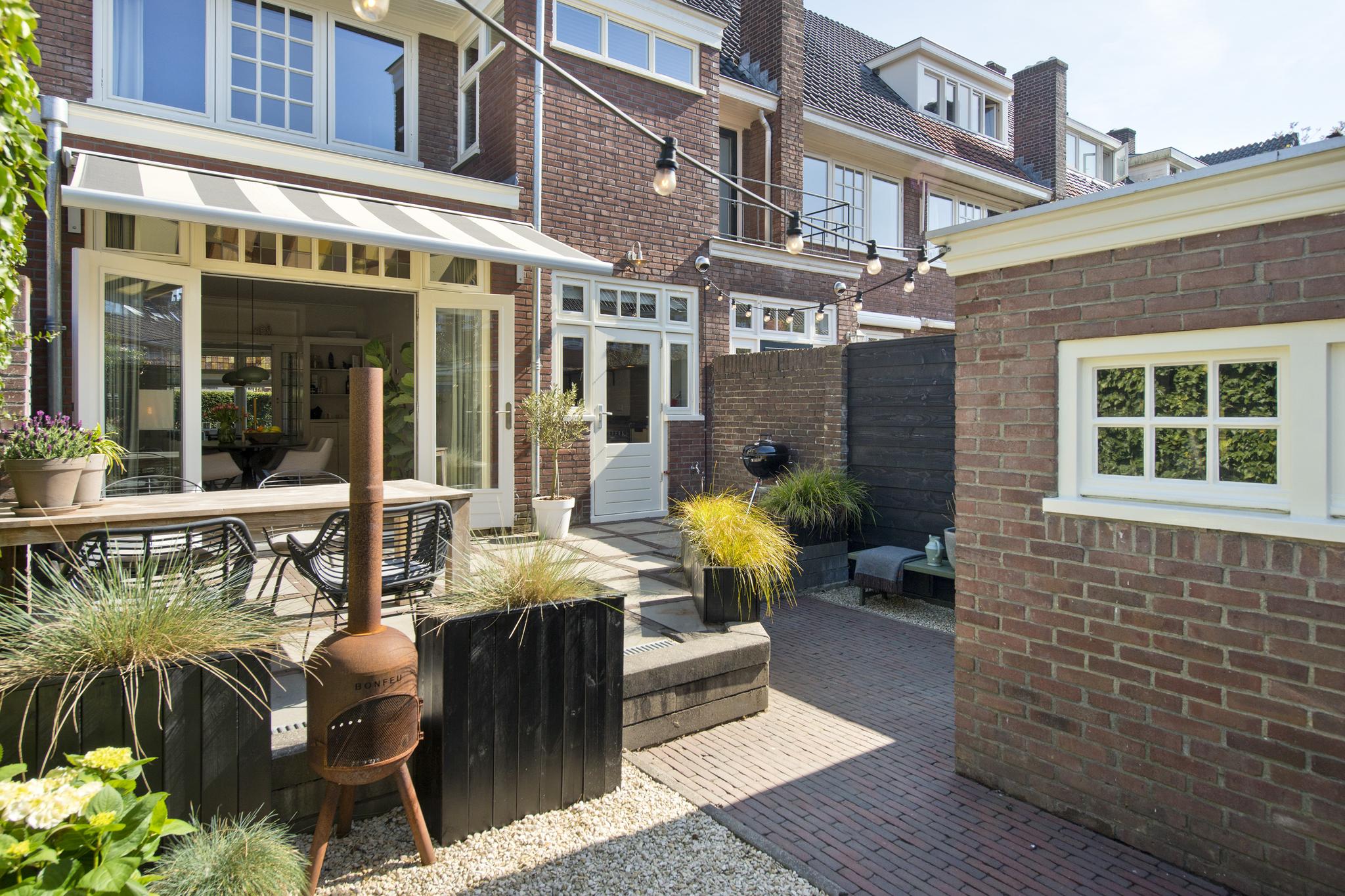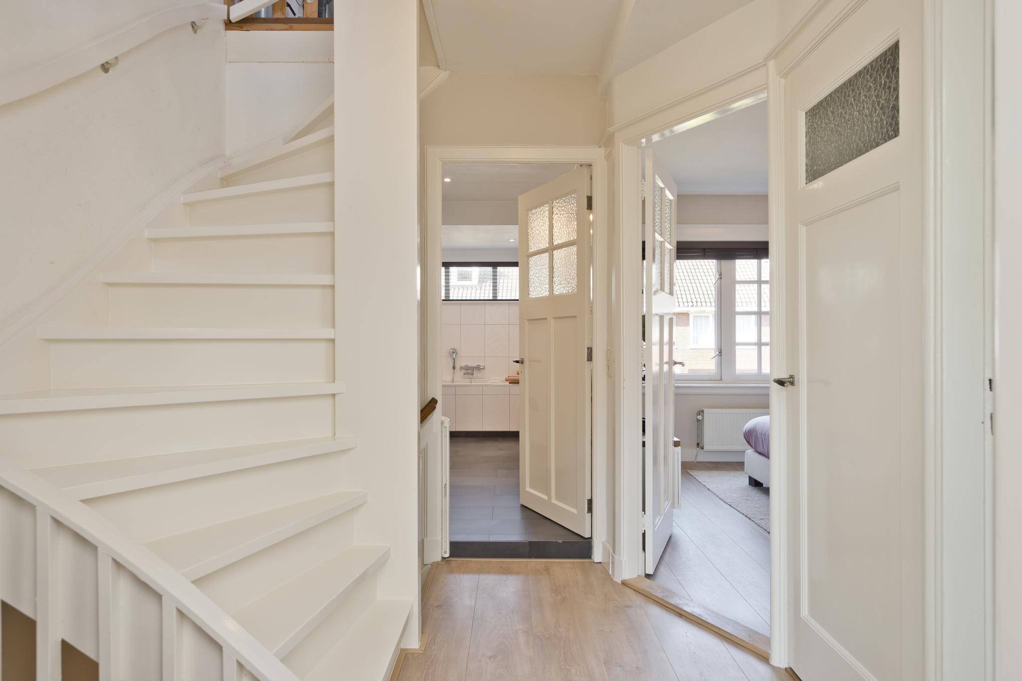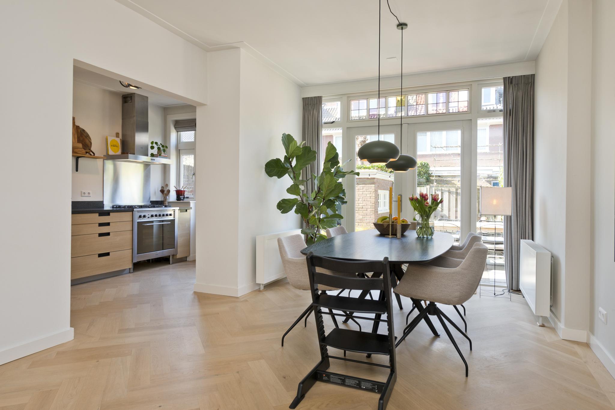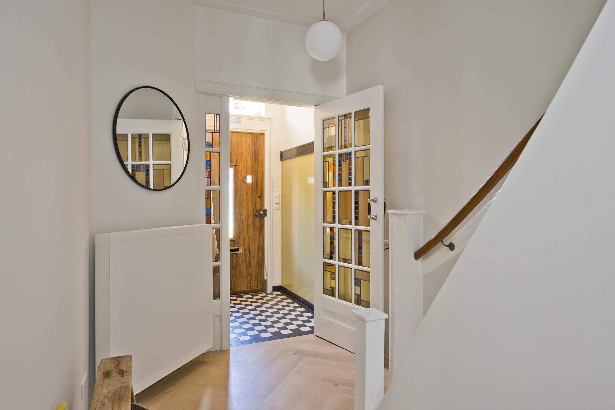 Indeling: binnenkomst via de vestibule met prachtige glas-in-lood-details, vervolgens bereik je een ruime hal met toilet en het trappenhuis. Deze hal leidt tevens naar de provisiekelder en de ruime eetkamer en woonkamer met gashaard, voorzien van een fraaie visgraat parketvloer. De eetkamer, die aan de achterzijde is uitgebouwd, gaat over in de gezellige halfopen keuken, voorzien van moderne inbouwapparatuur en een 5-pits fornuis. De openslaande deuren geven toegang tot een aangename, goed ingedeelde en zonnige tuin gelegen op het westen met een stenen berging. De tuin is ook achterom bereikbaar.