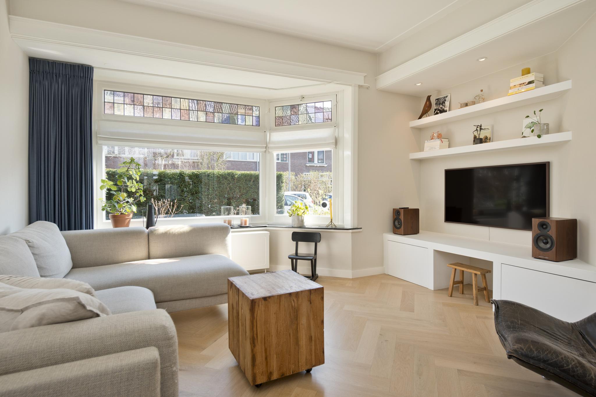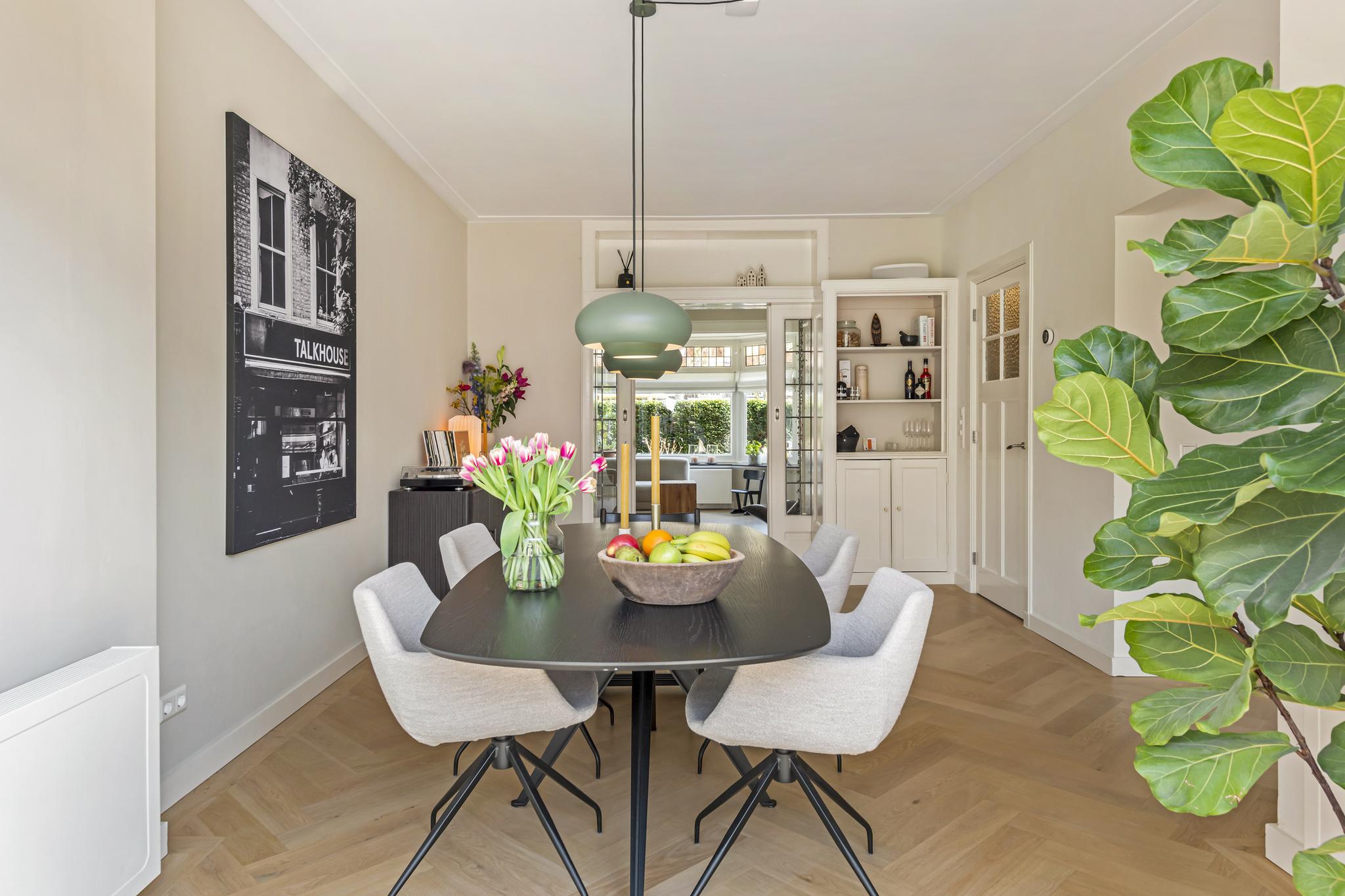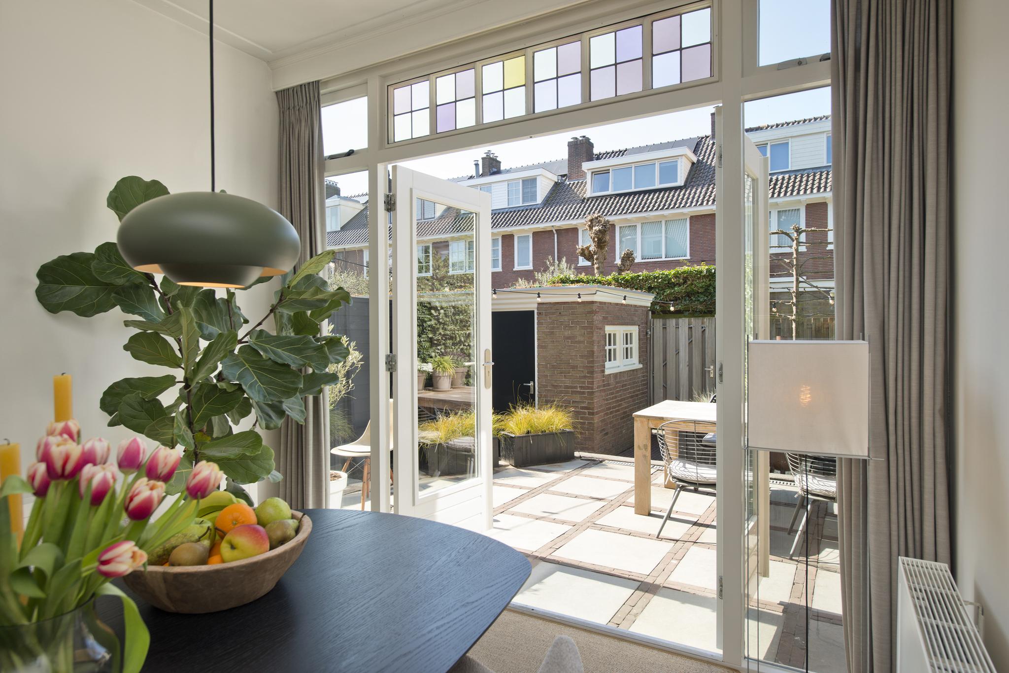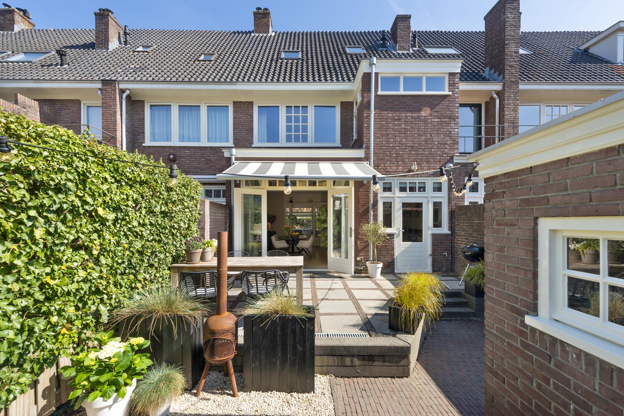 Indeling: binnenkomst via de vestibule met prachtige glas-in-lood-details, vervolgens bereik je een ruime hal met toilet en het trappenhuis. Deze hal leidt tevens naar de provisiekelder en de ruime eetkamer en woonkamer met gashaard, voorzien van een fraaie visgraat parketvloer. De eetkamer, die aan de achterzijde is uitgebouwd, gaat over in de gezellige halfopen keuken, voorzien van moderne inbouwapparatuur en een 5-pits fornuis. De openslaande deuren geven toegang tot een aangename, goed ingedeelde en zonnige tuin gelegen op het westen met een stenen berging. De tuin is ook achterom bereikbaar.