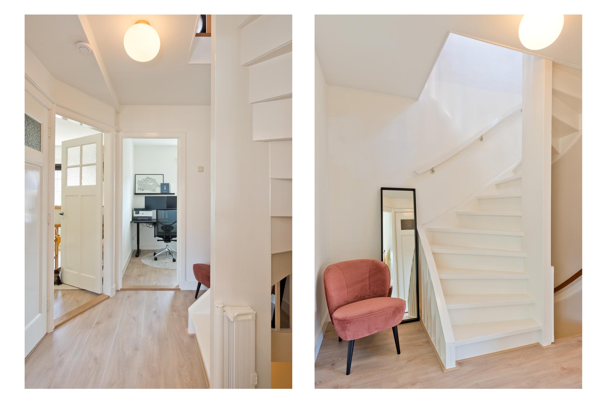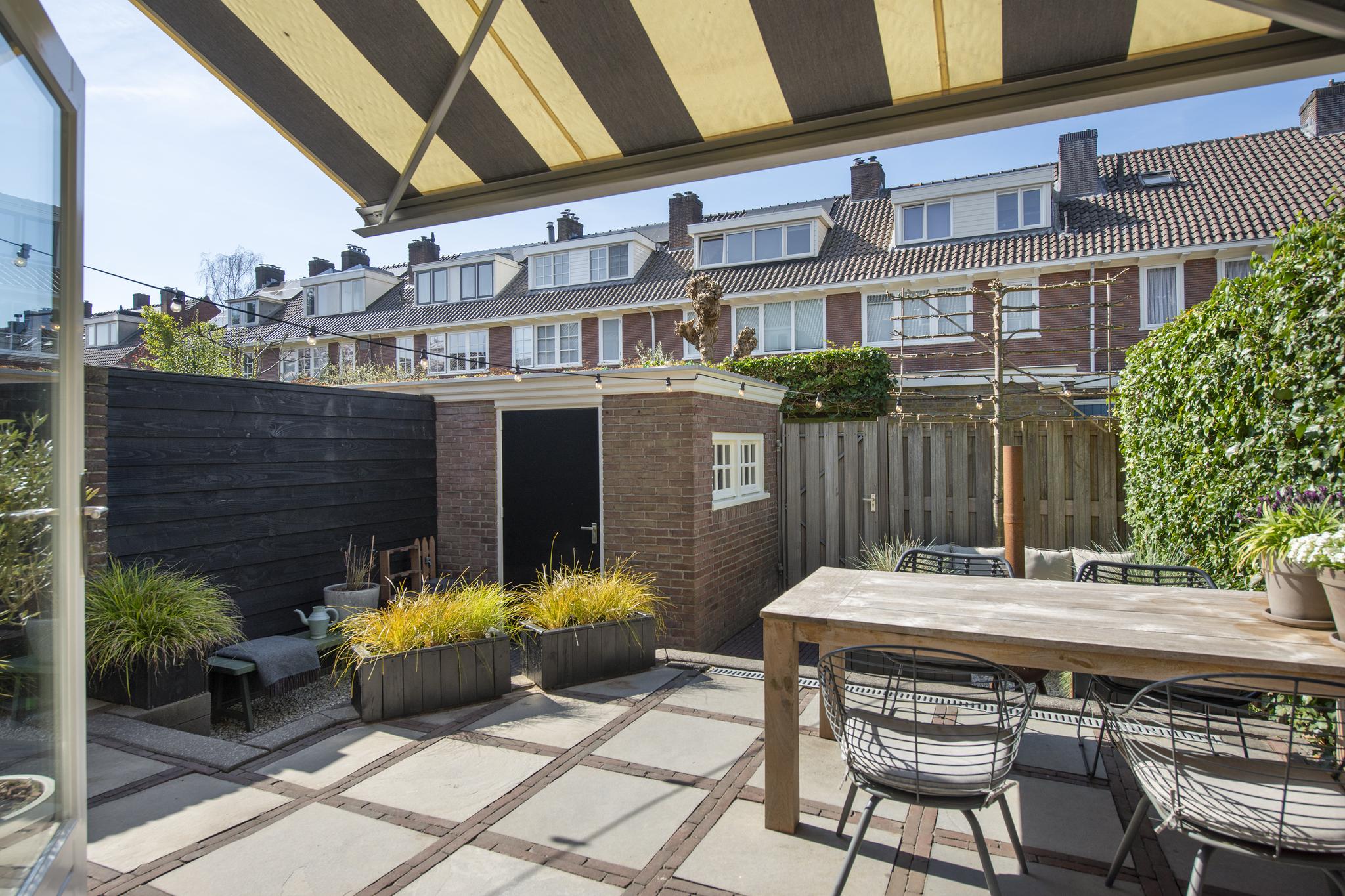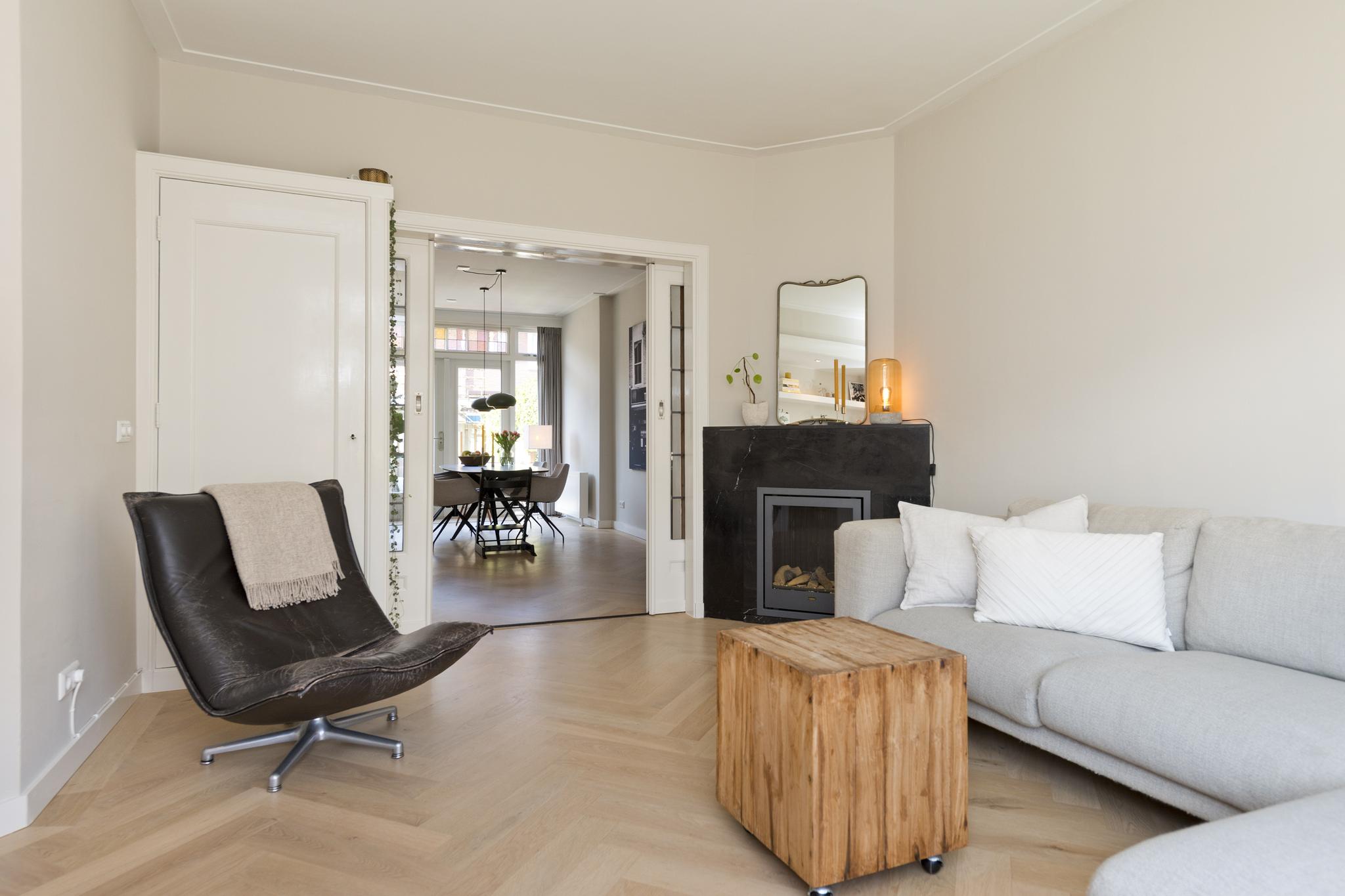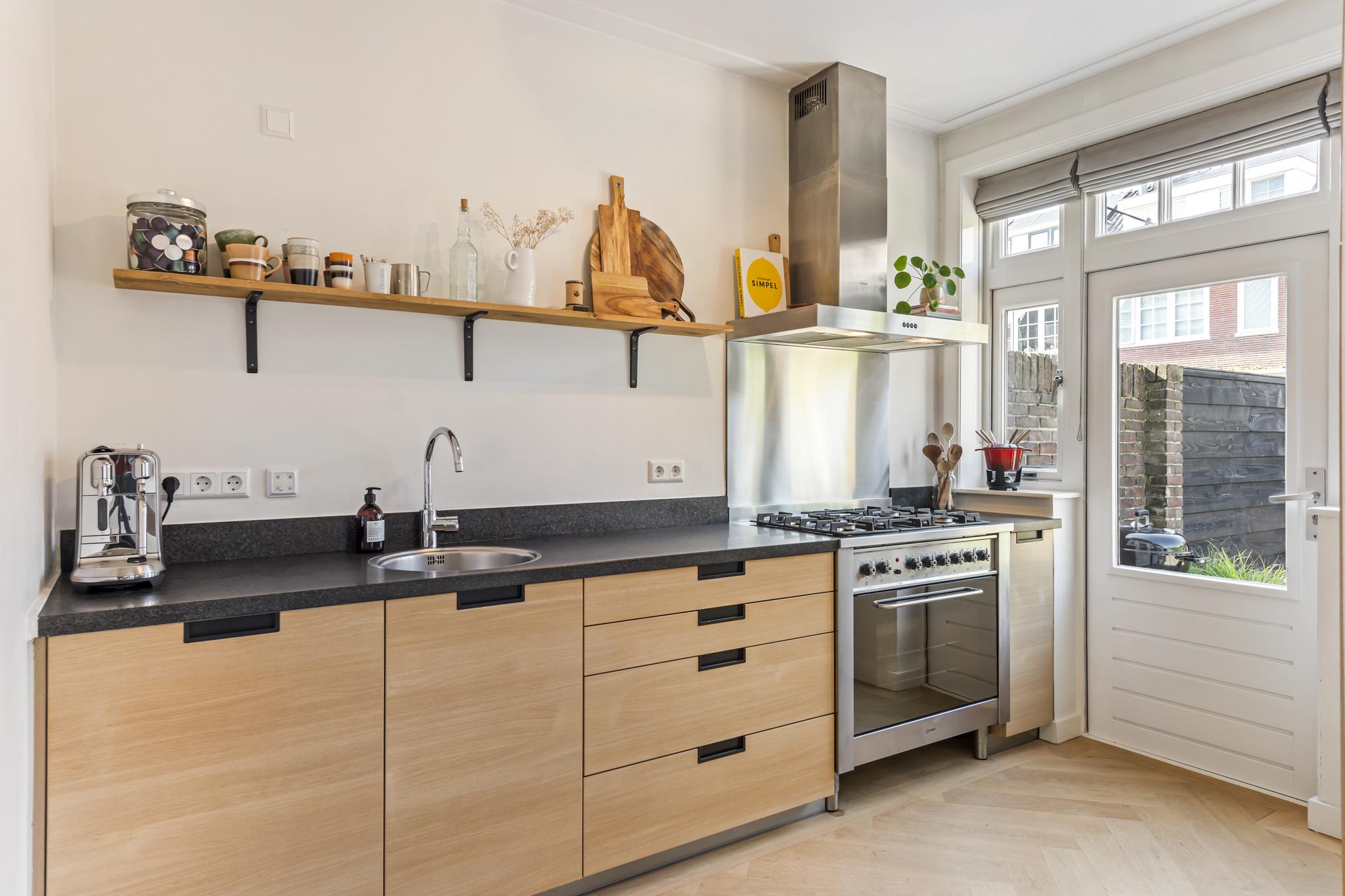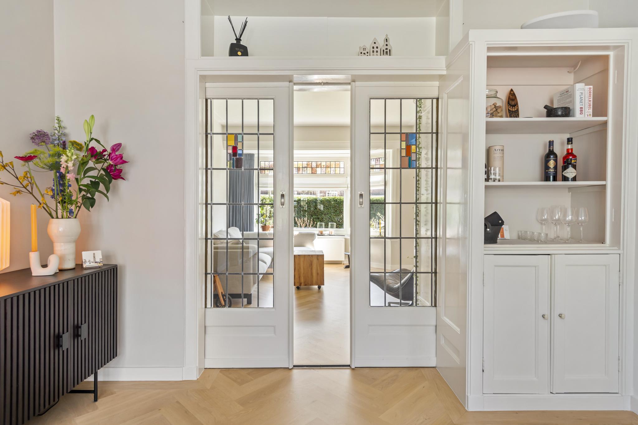 Indeling: binnenkomst via de vestibule met prachtige glas-in-lood-details, vervolgens bereik je een ruime hal met toilet en het trappenhuis. Deze hal leidt tevens naar de provisiekelder en de ruime eetkamer en woonkamer met gashaard, voorzien van een fraaie visgraat parketvloer. De eetkamer, die aan de achterzijde is uitgebouwd, gaat over in de gezellige halfopen keuken, voorzien van moderne inbouwapparatuur en een 5-pits fornuis. De openslaande deuren geven toegang tot een aangename, goed ingedeelde en zonnige tuin gelegen op het westen met een stenen berging. De tuin is ook achterom bereikbaar.