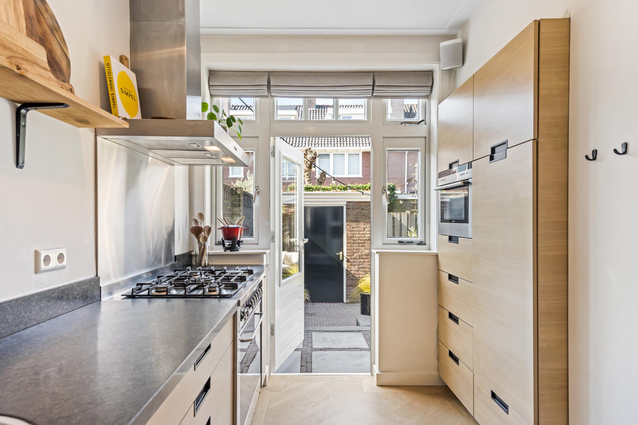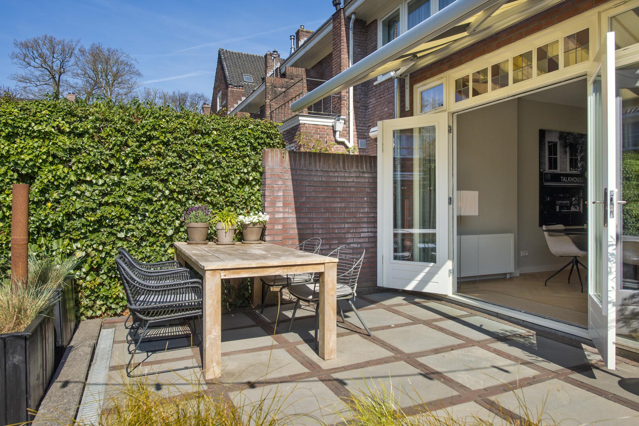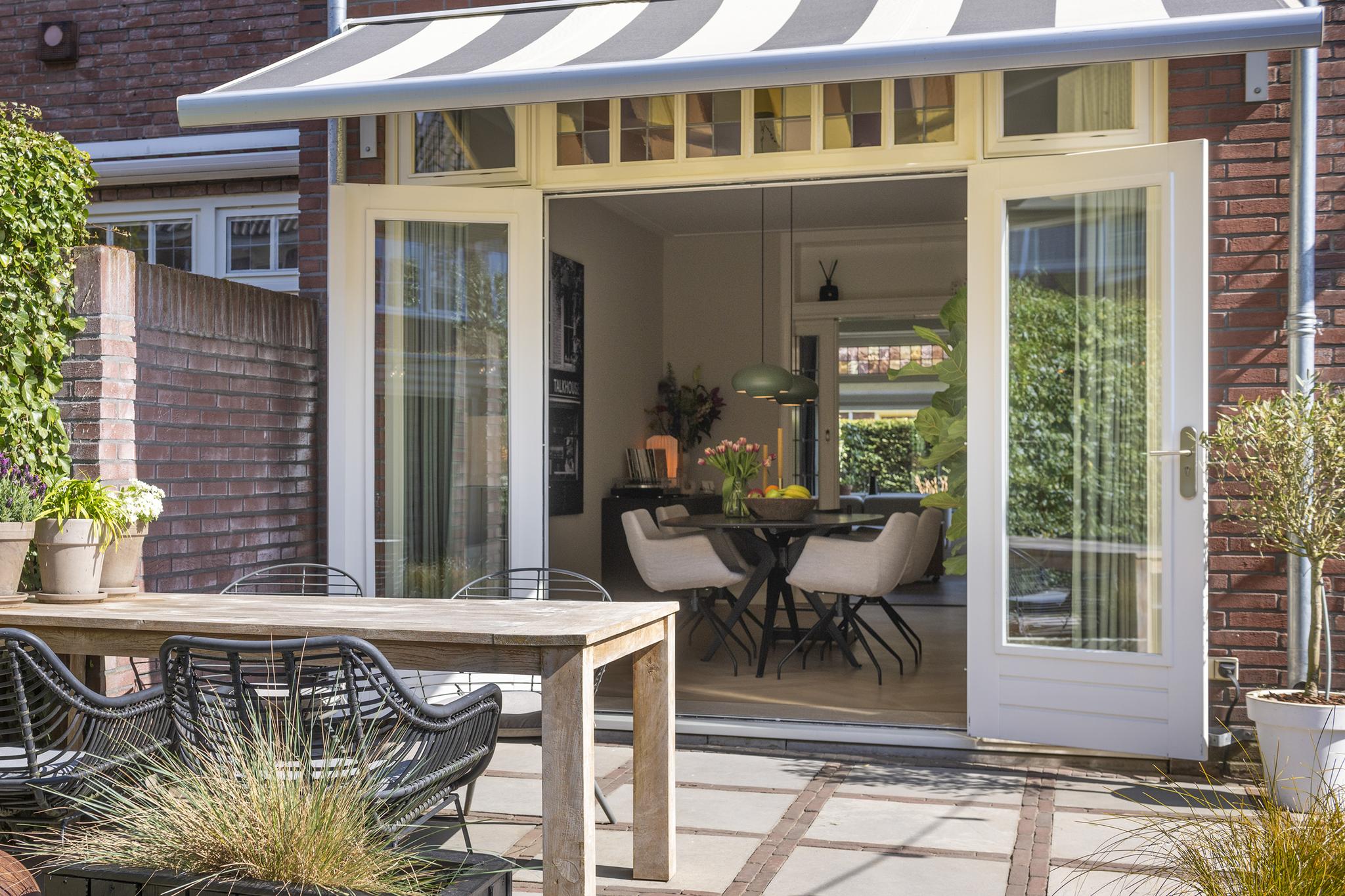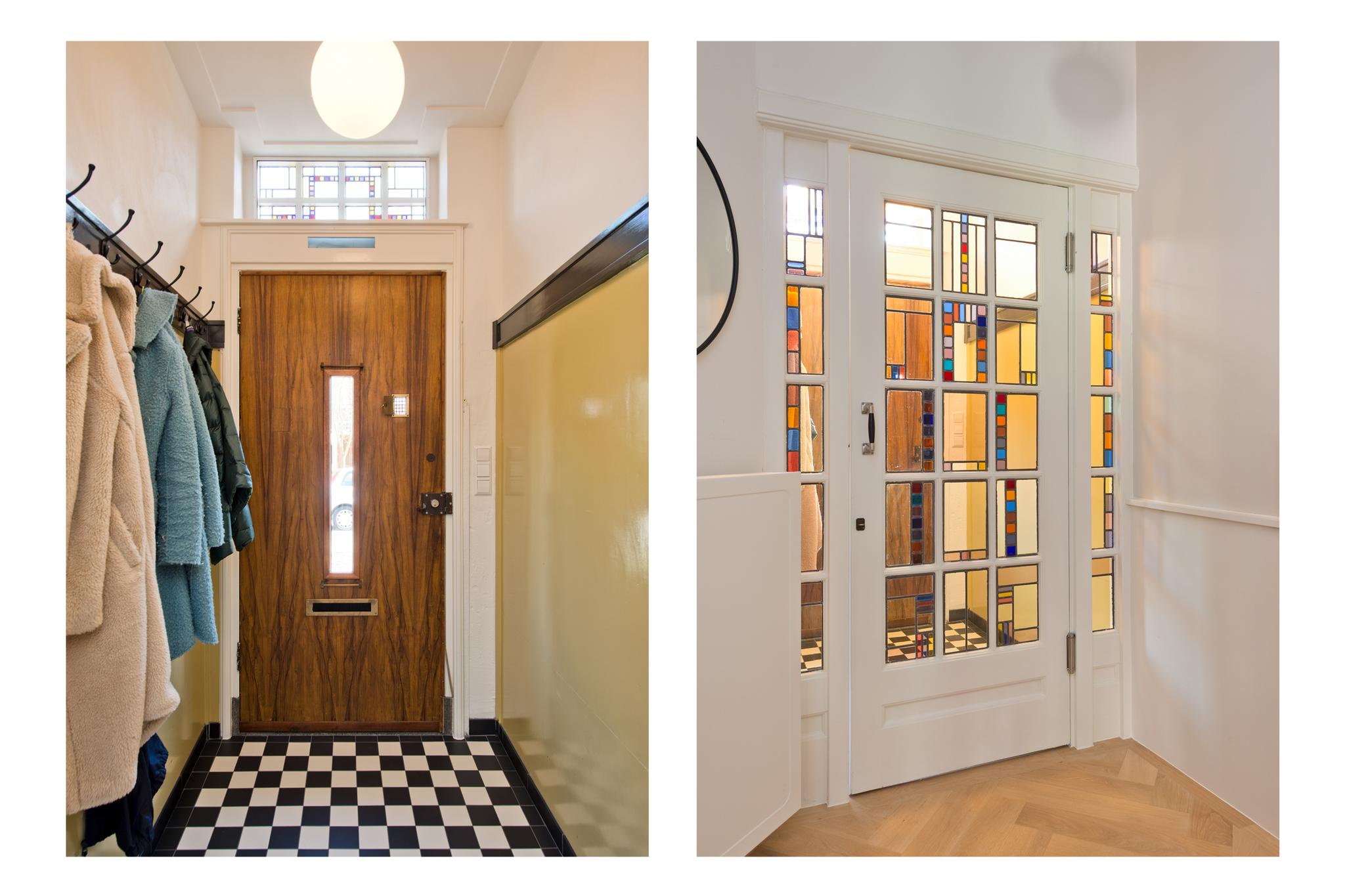 Indeling: binnenkomst via de vestibule met prachtige glas-in-lood-details, vervolgens bereik je een ruime hal met toilet en het trappenhuis. Deze hal leidt tevens naar de provisiekelder en de ruime eetkamer en woonkamer met gashaard, voorzien van een fraaie visgraat parketvloer. De eetkamer, die aan de achterzijde is uitgebouwd, gaat over in de gezellige halfopen keuken, voorzien van moderne inbouwapparatuur en een 5-pits fornuis. De openslaande deuren geven toegang tot een aangename, goed ingedeelde en zonnige tuin gelegen op het westen met een stenen berging. De tuin is ook achterom bereikbaar.