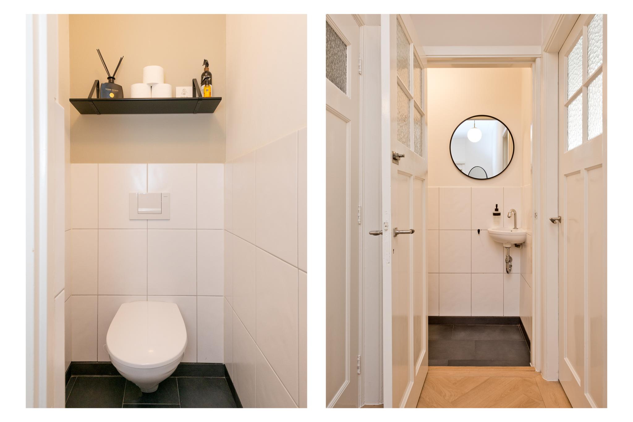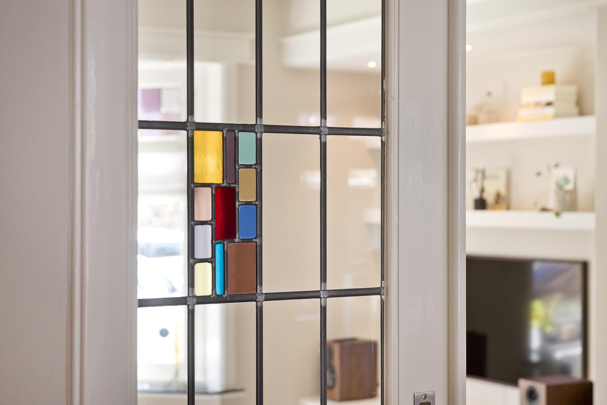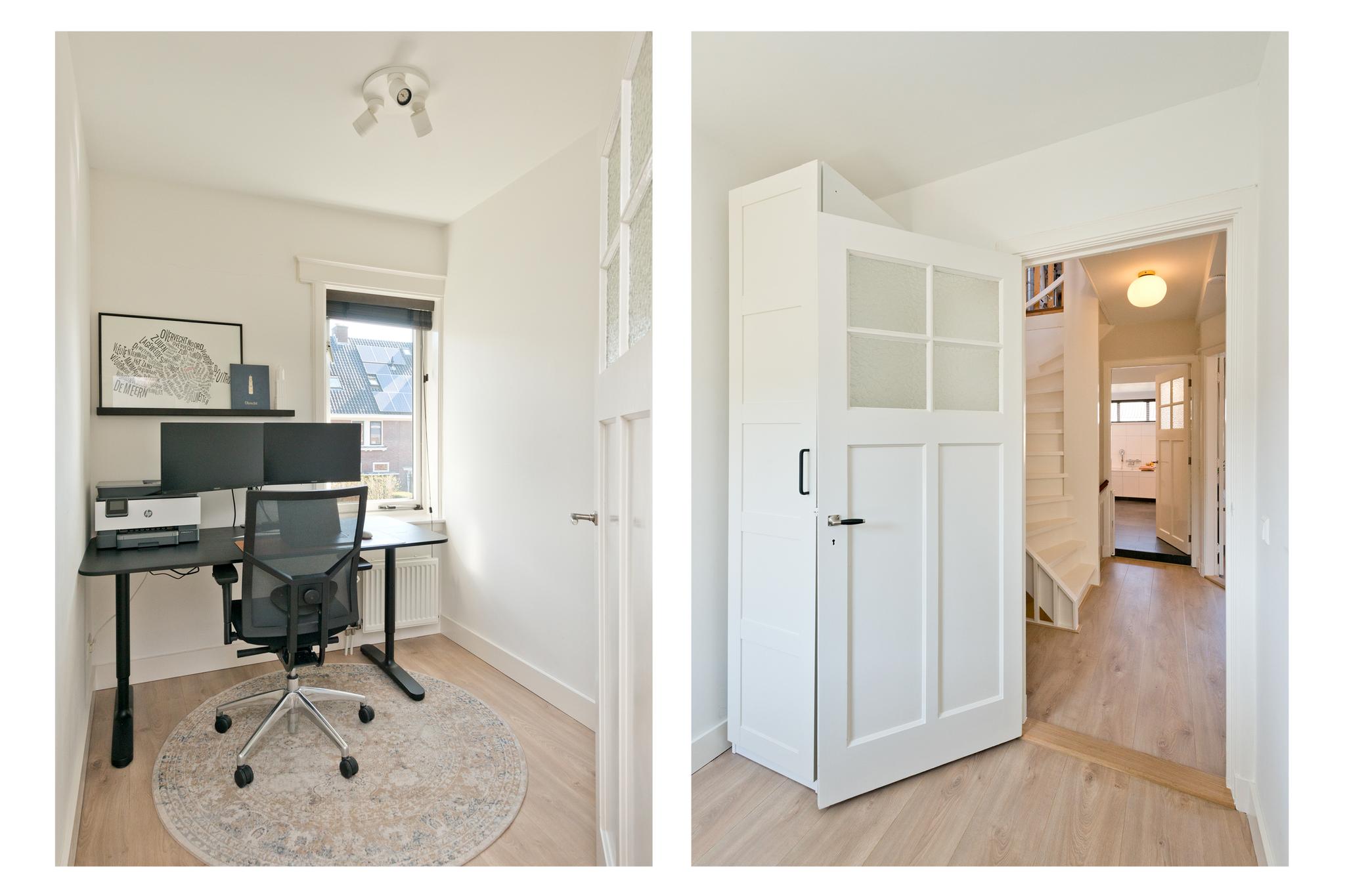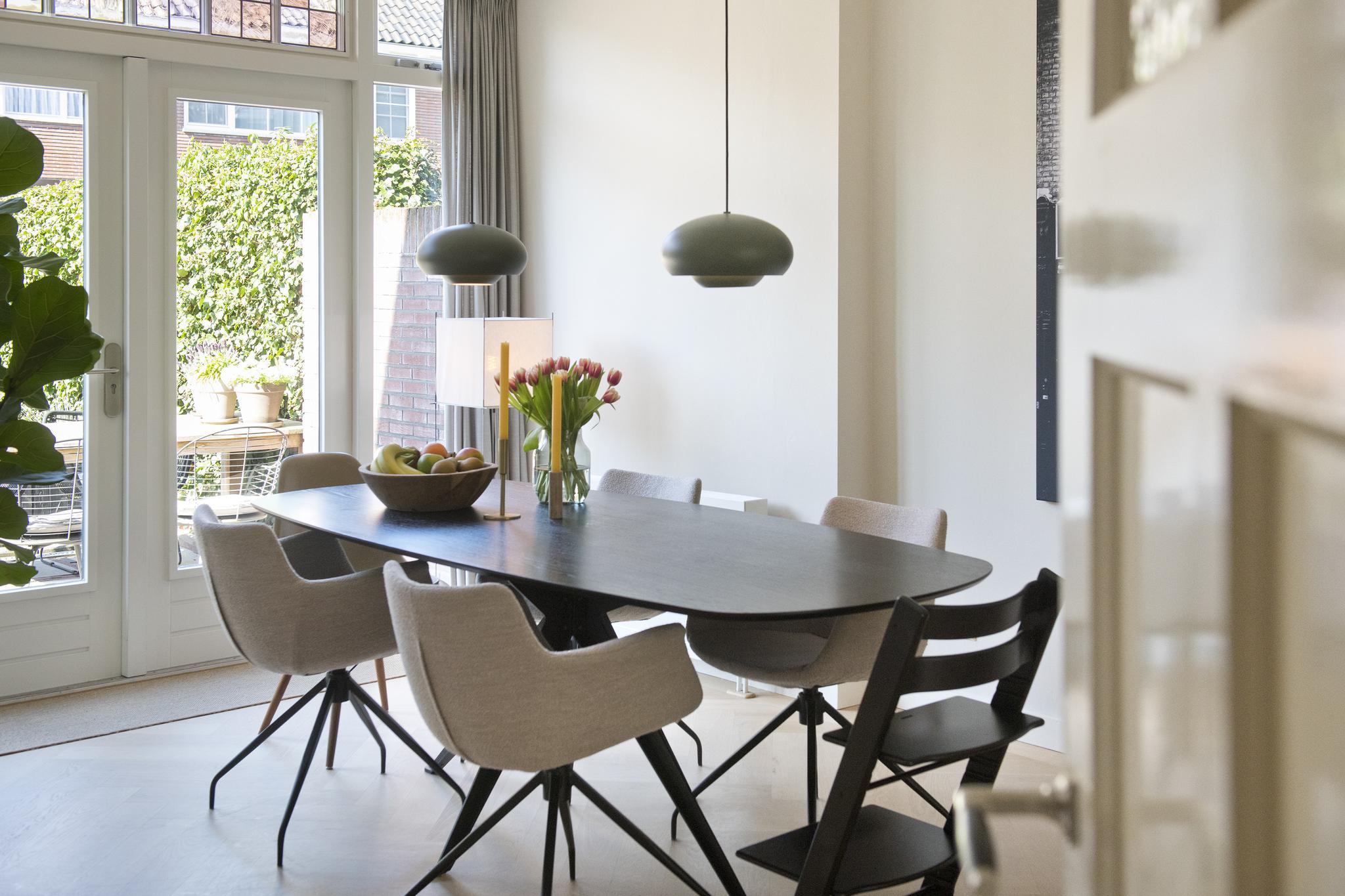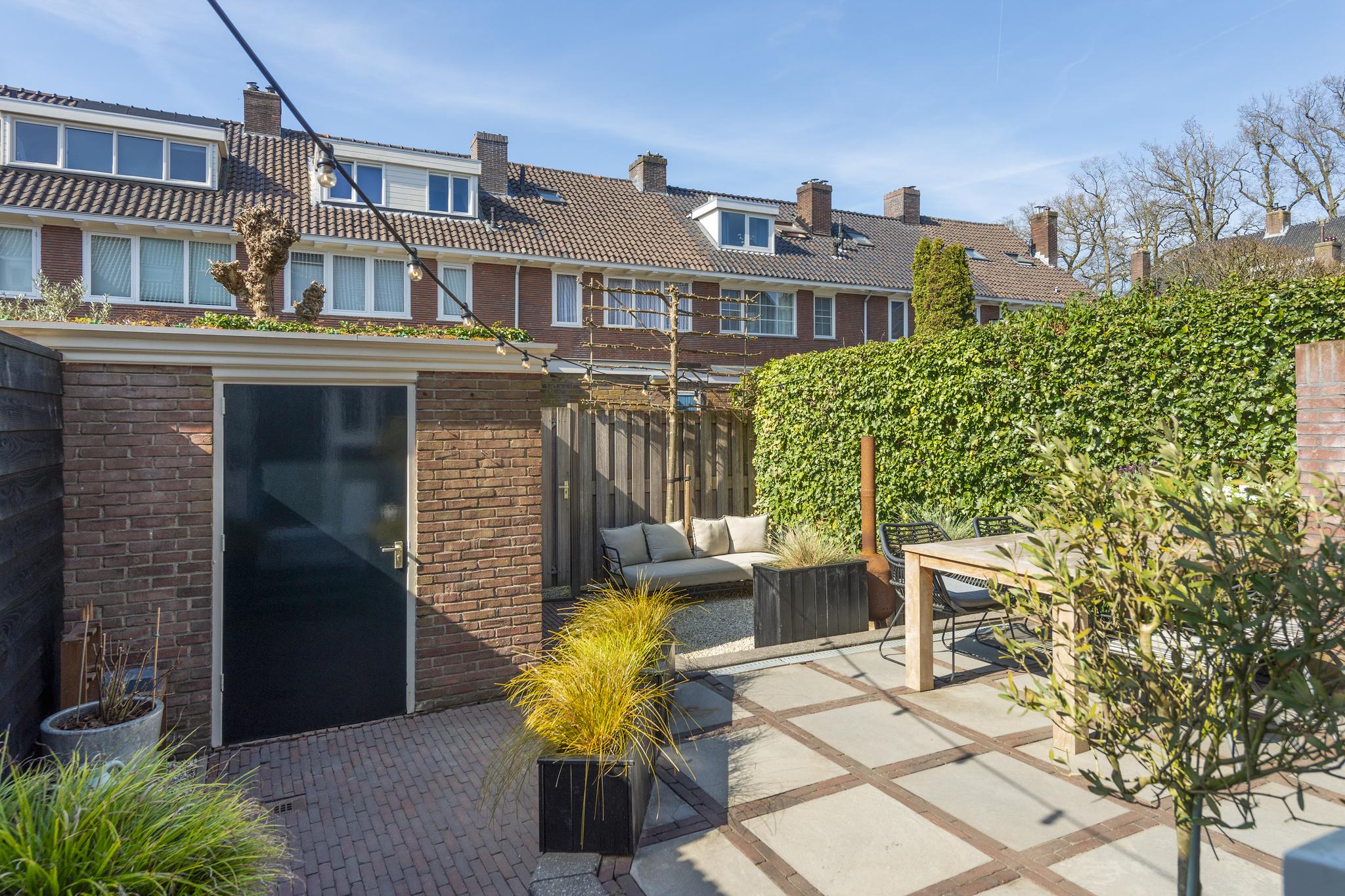 Indeling: binnenkomst via de vestibule met prachtige glas-in-lood-details, vervolgens bereik je een ruime hal met toilet en het trappenhuis. Deze hal leidt tevens naar de provisiekelder en de ruime eetkamer en woonkamer met gashaard, voorzien van een fraaie visgraat parketvloer. De eetkamer, die aan de achterzijde is uitgebouwd, gaat over in de gezellige halfopen keuken, voorzien van moderne inbouwapparatuur en een 5-pits fornuis. De openslaande deuren geven toegang tot een aangename, goed ingedeelde en zonnige tuin gelegen op het westen met een stenen berging. De tuin is ook achterom bereikbaar.