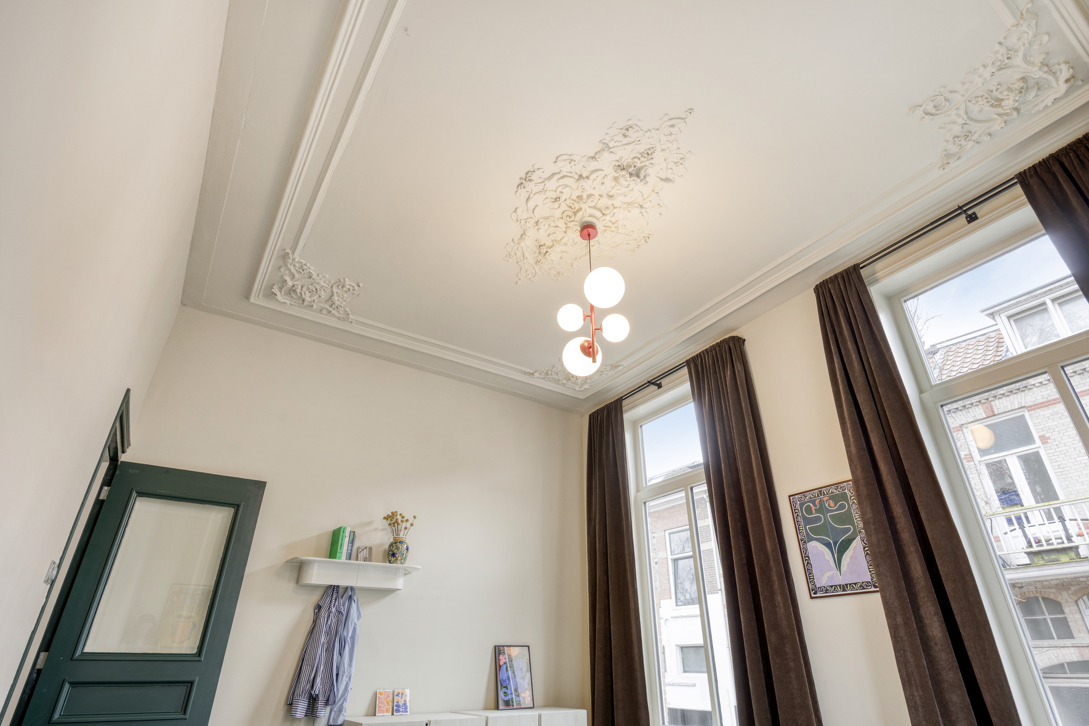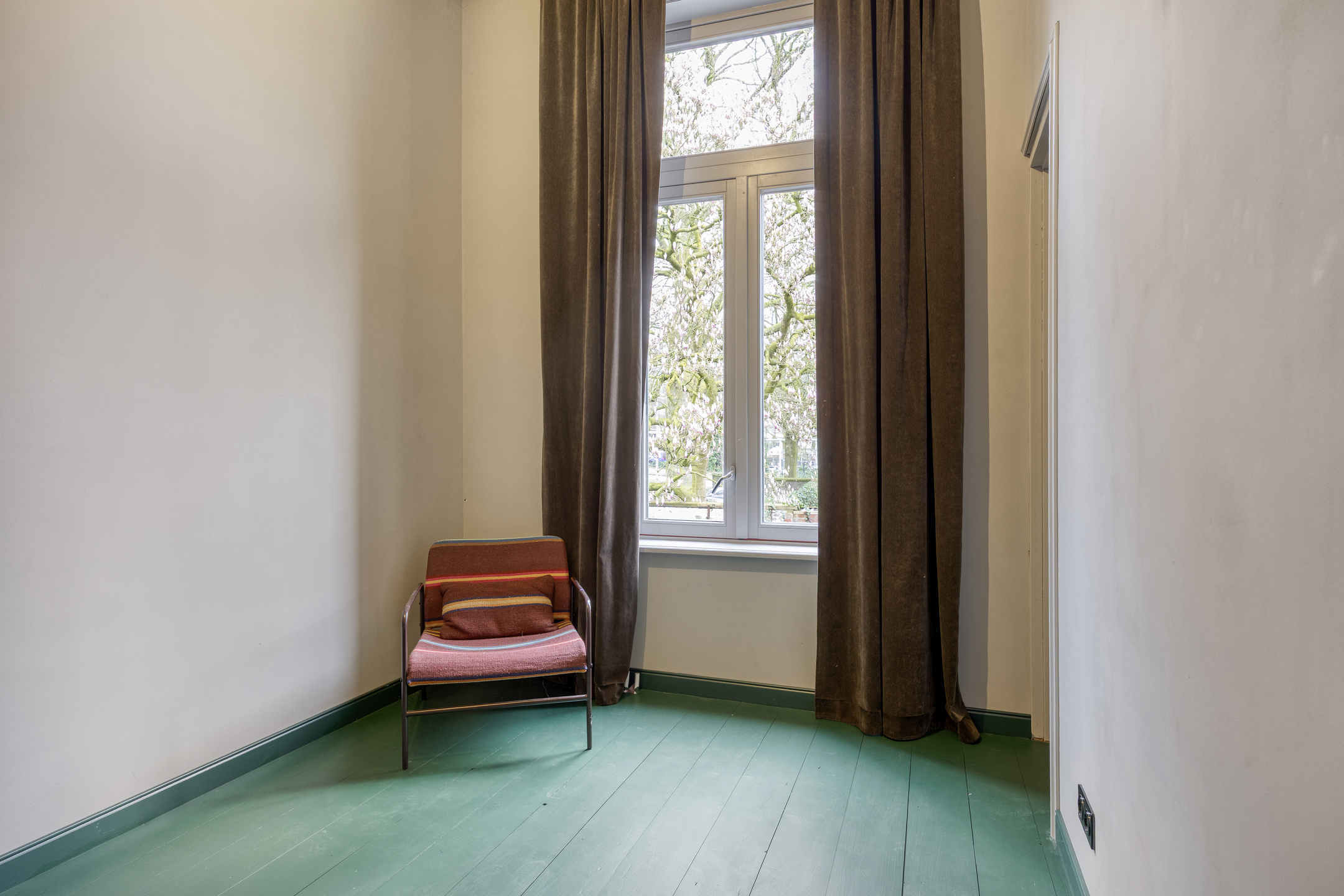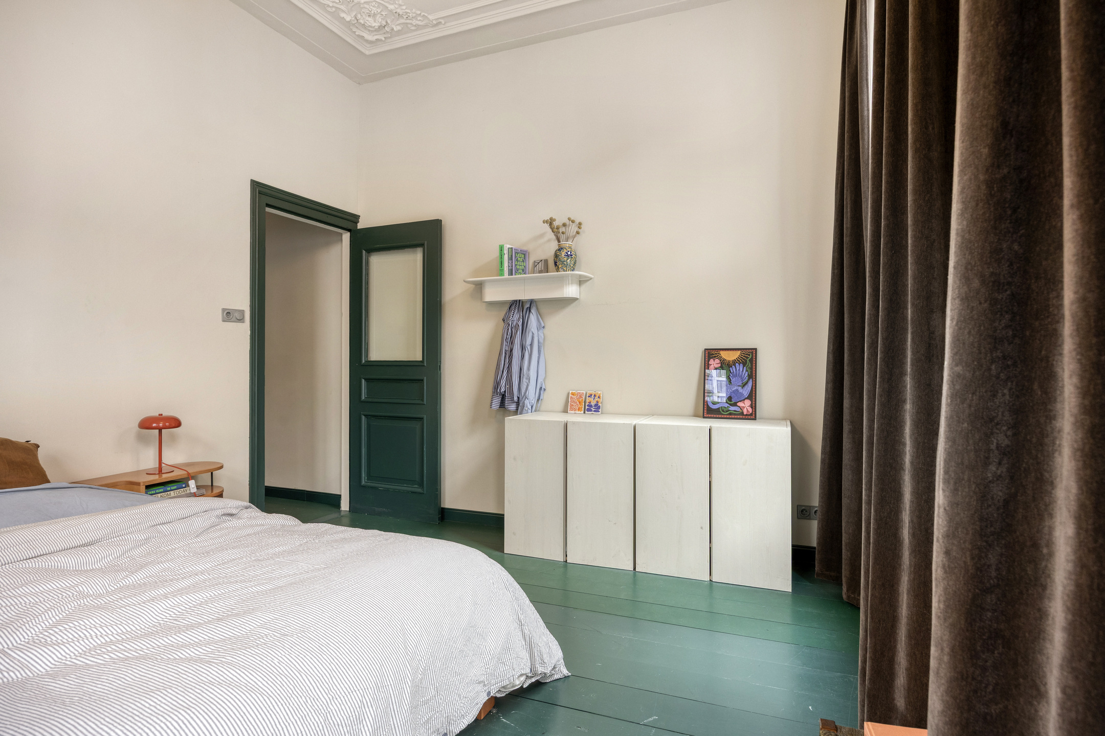 De master-bedroom aan de voorzijde is een absolute blikvanger. Deze kamer straalt karakter en sfeer uit dankzij het prachtige originele plafond, wat een uniek en authentiek element toevoegt aan het geheel.