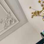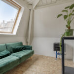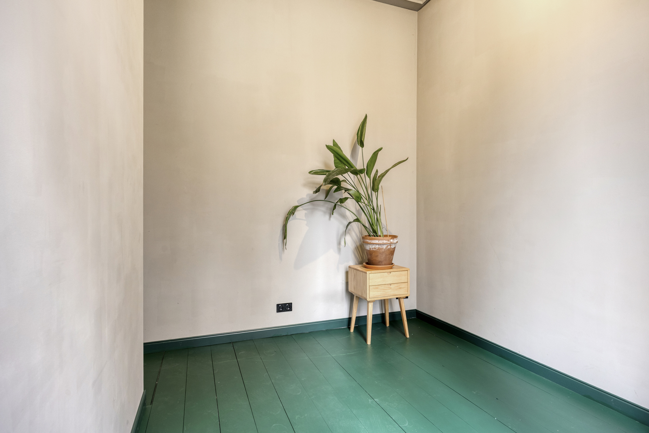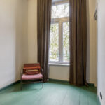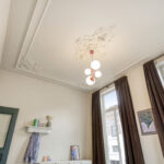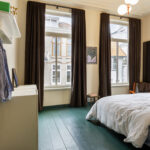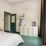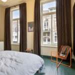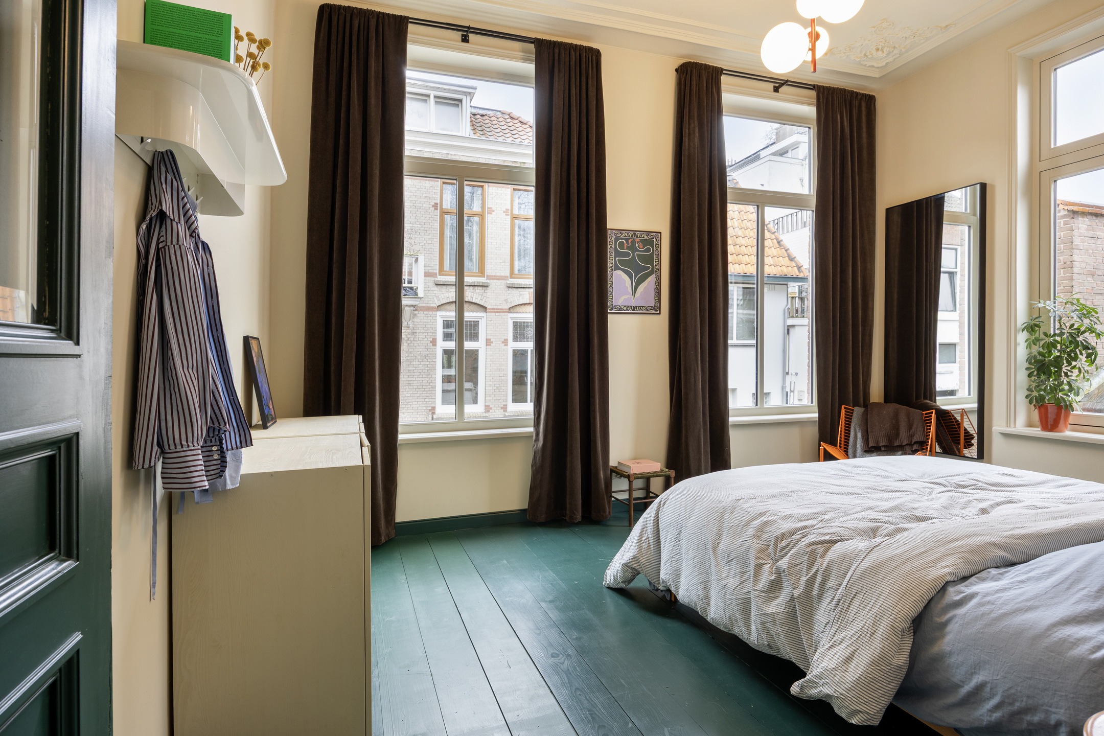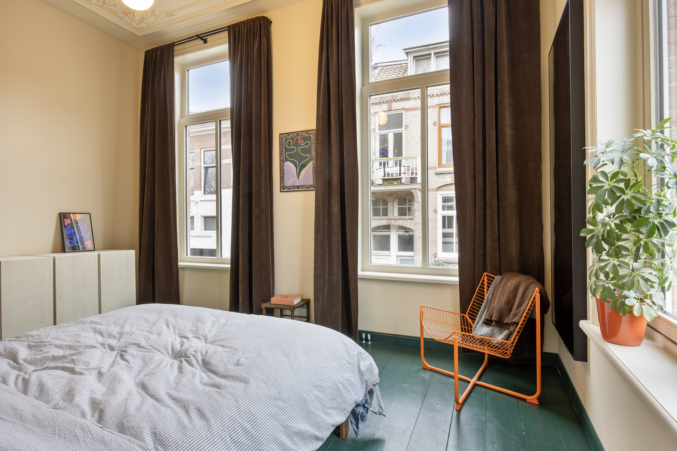 De master-bedroom aan de voorzijde is een absolute blikvanger. Deze kamer straalt karakter en sfeer uit dankzij het prachtige originele plafond, wat een uniek en authentiek element toevoegt aan het geheel.