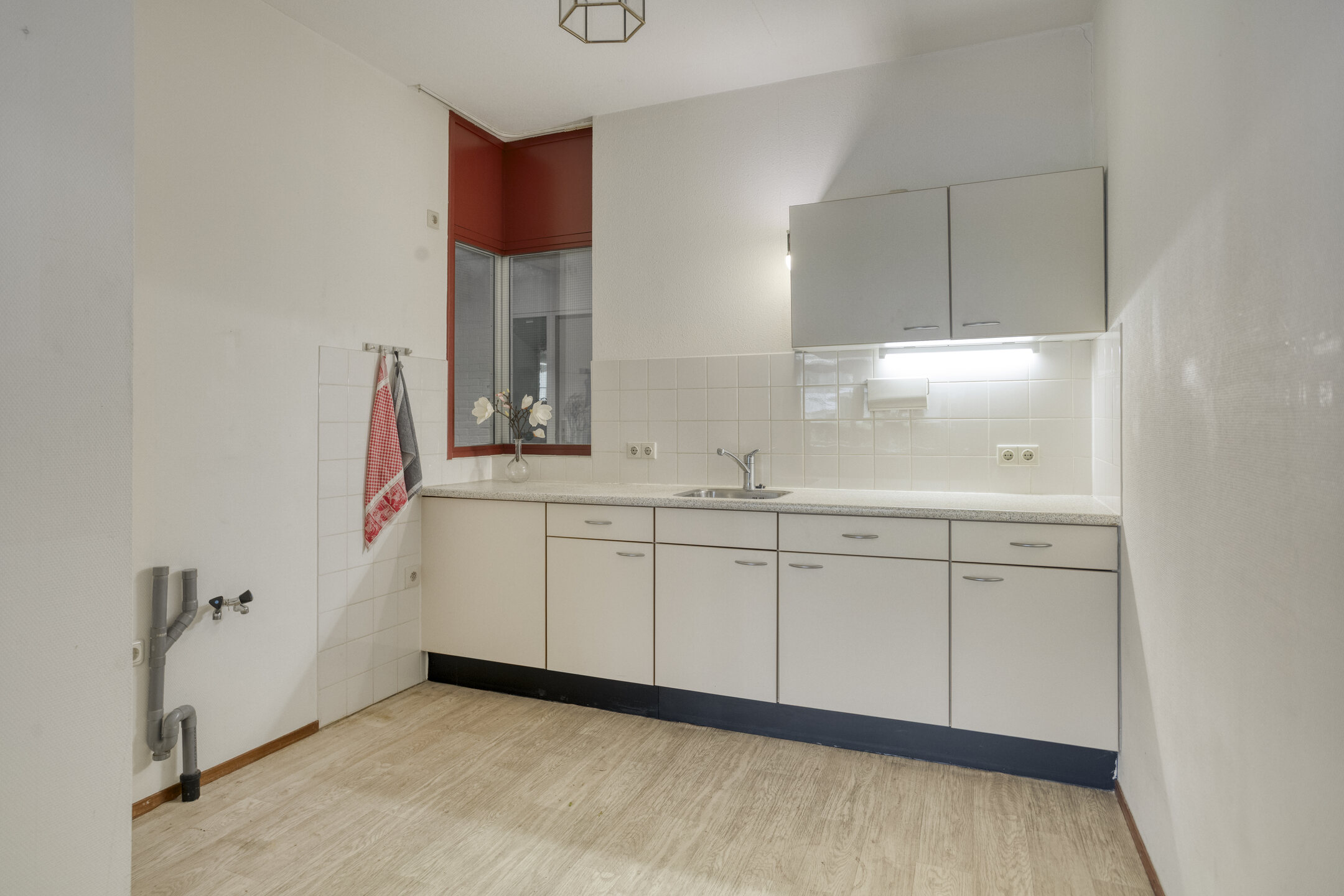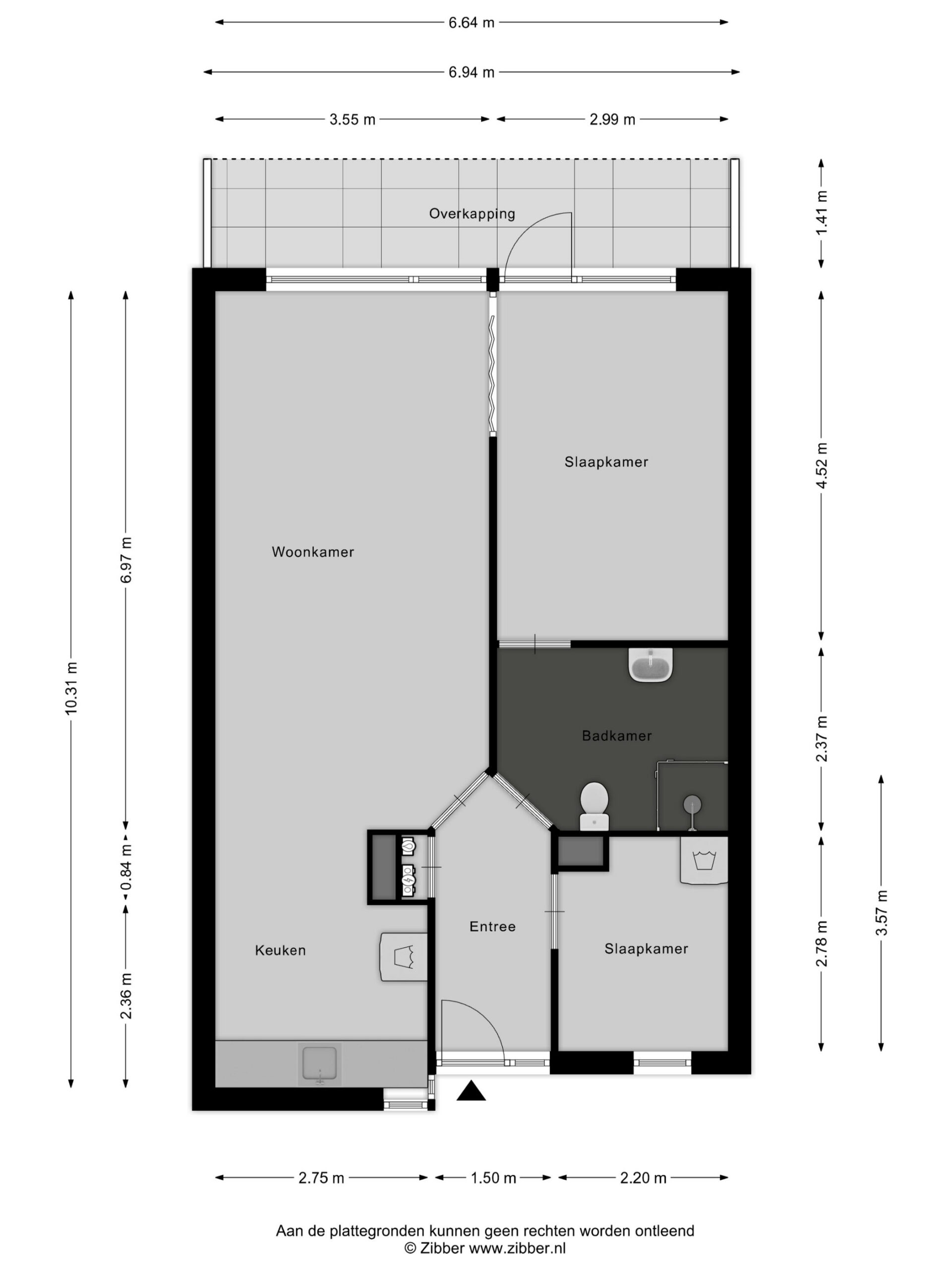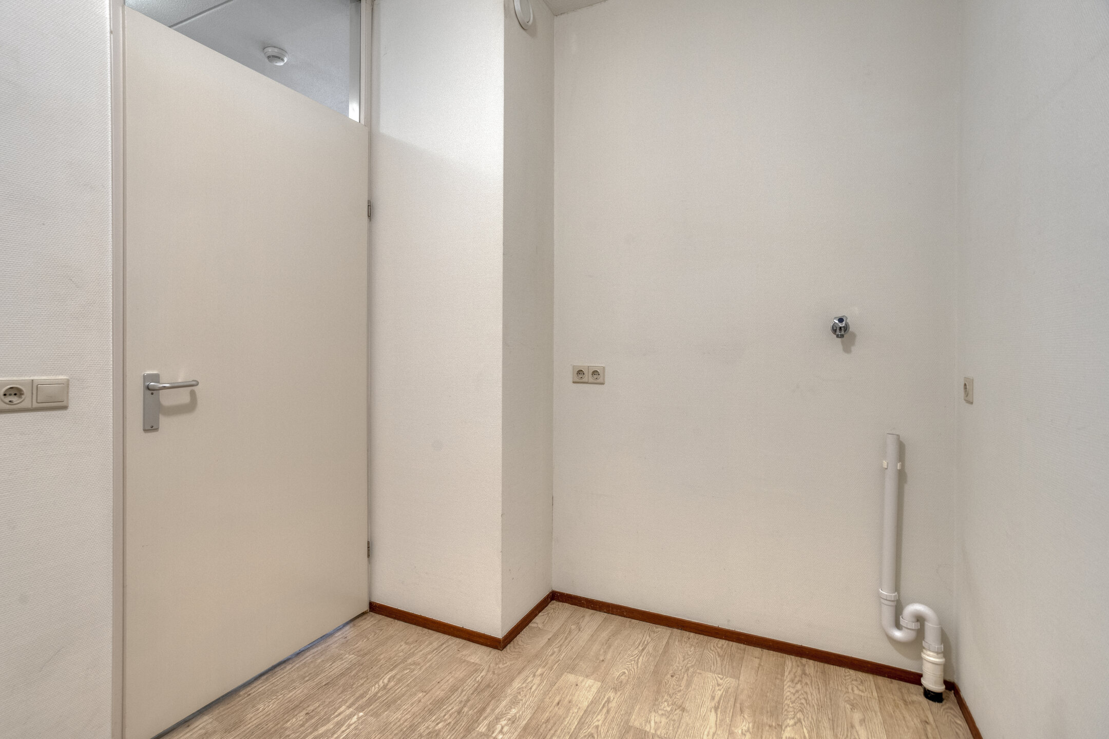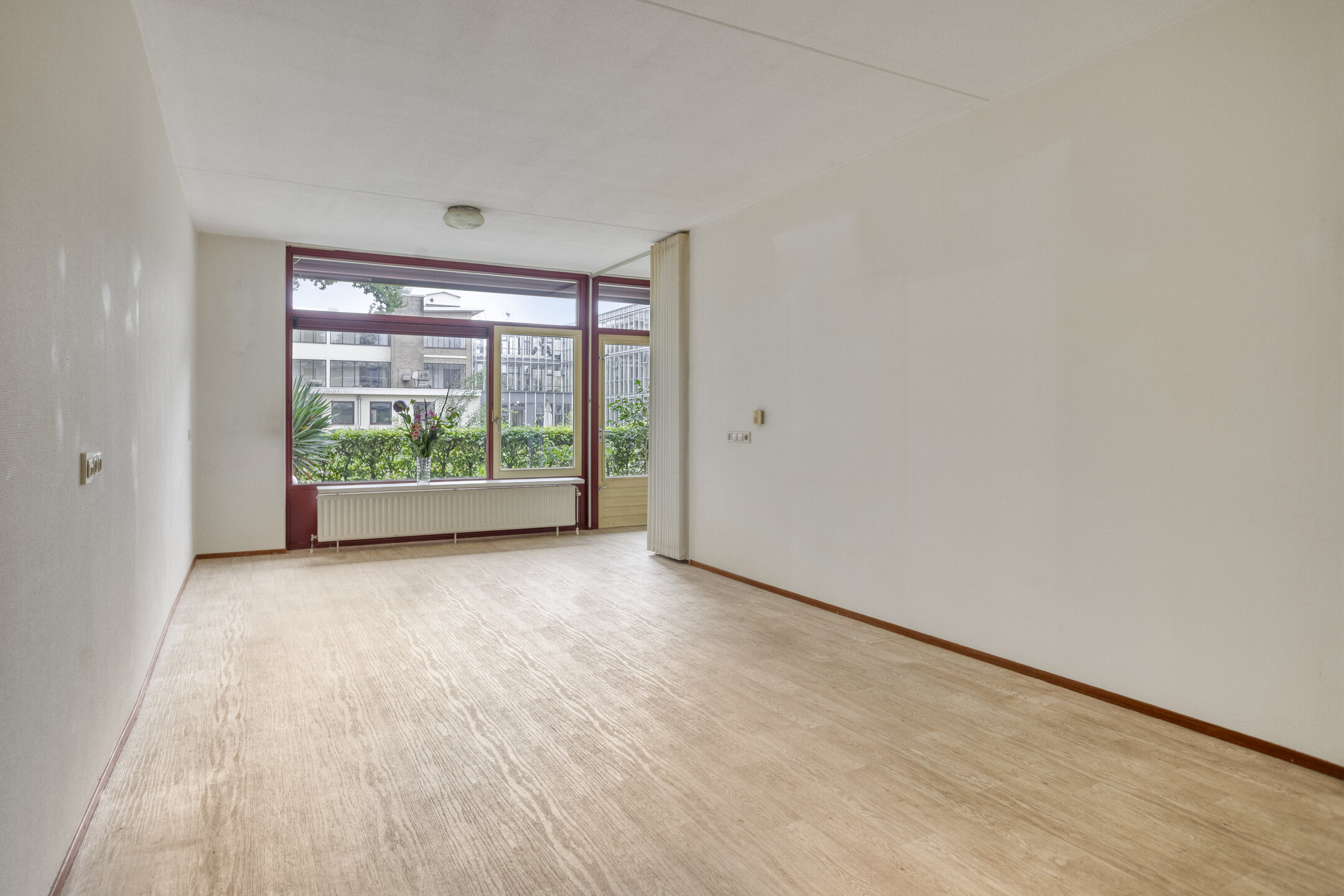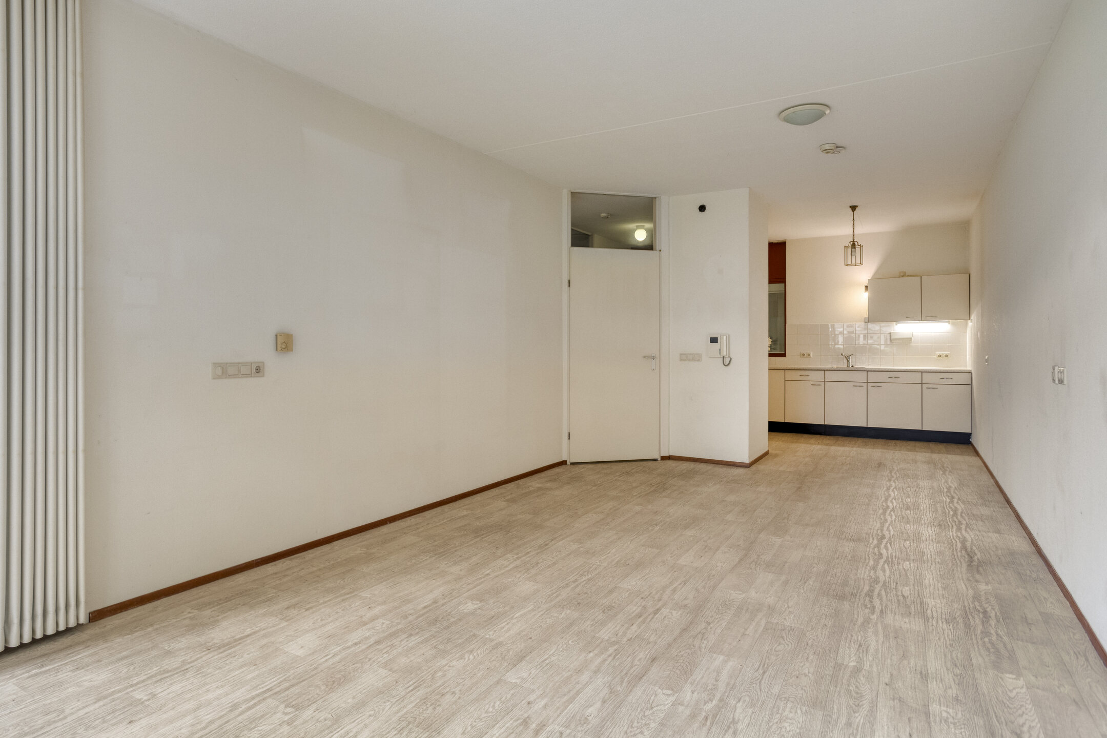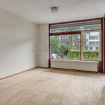 Entree, hal, meterkast, toilet, 1e slaapkamer en toegang tot de ruime en lichte woonkamer. Vanuit de woonkamer is de open keuken en de 2e slaapkamer te bereiken. De woonkamer geeft tevens toegang tot de gerieflijke buitenruimte met bescheiden tuin.