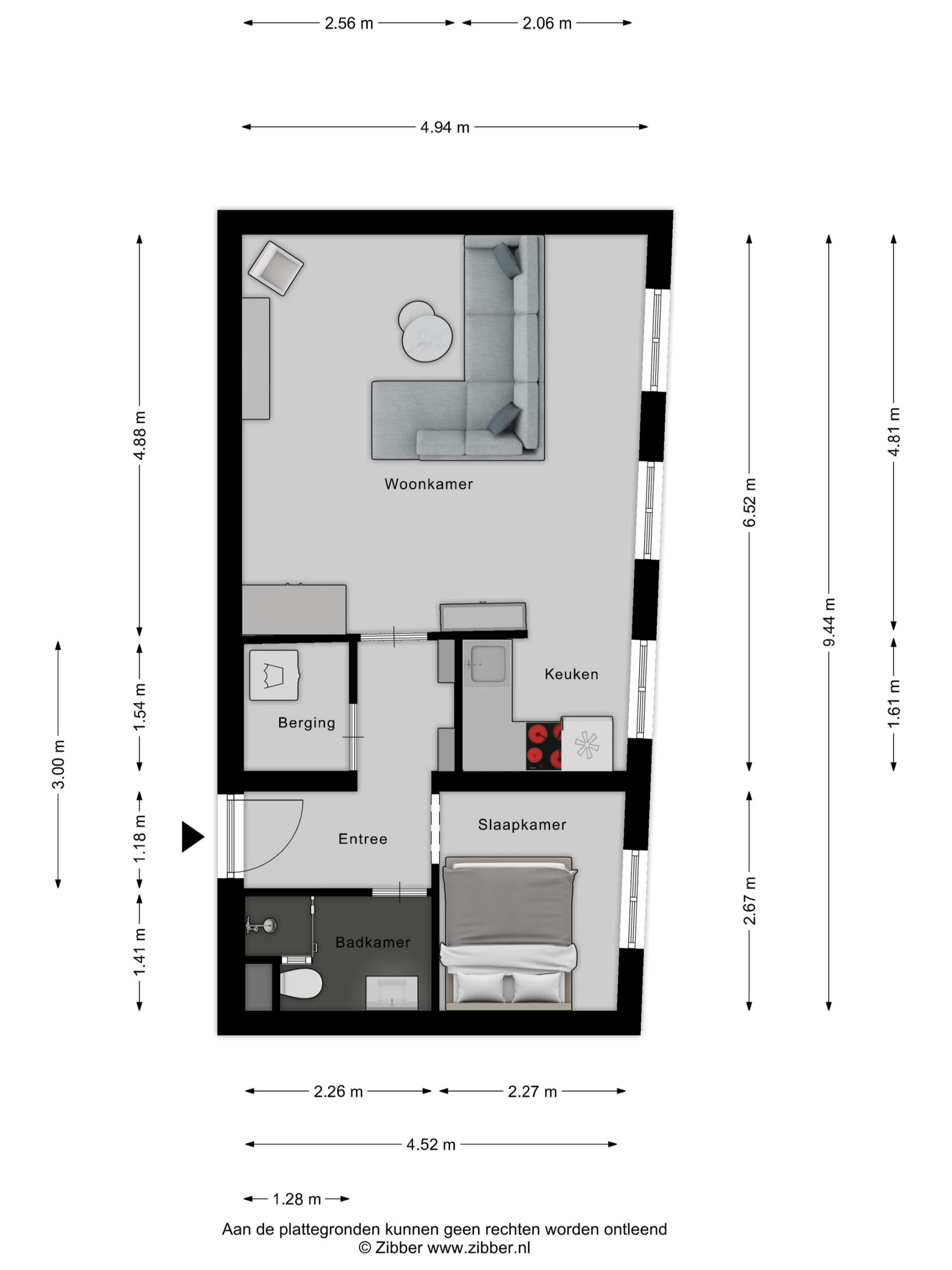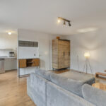 Entree/hal met intercom, berging/wasruimte, functionele badkamer met douchecabine, toilet en wastafelmeubel, ruime lichte woonkamer met veel raampartijen, half open keuken met inbouwapparatuur, slaapkamer.
