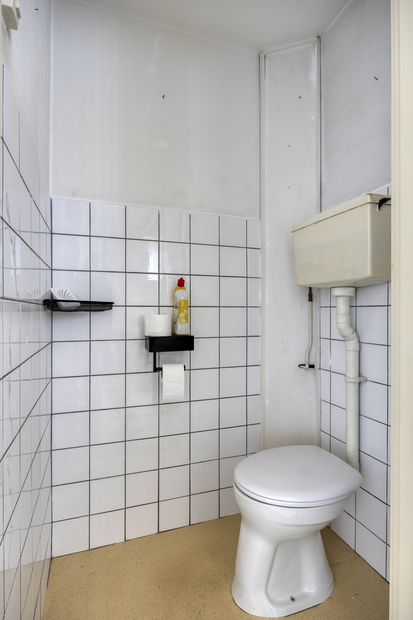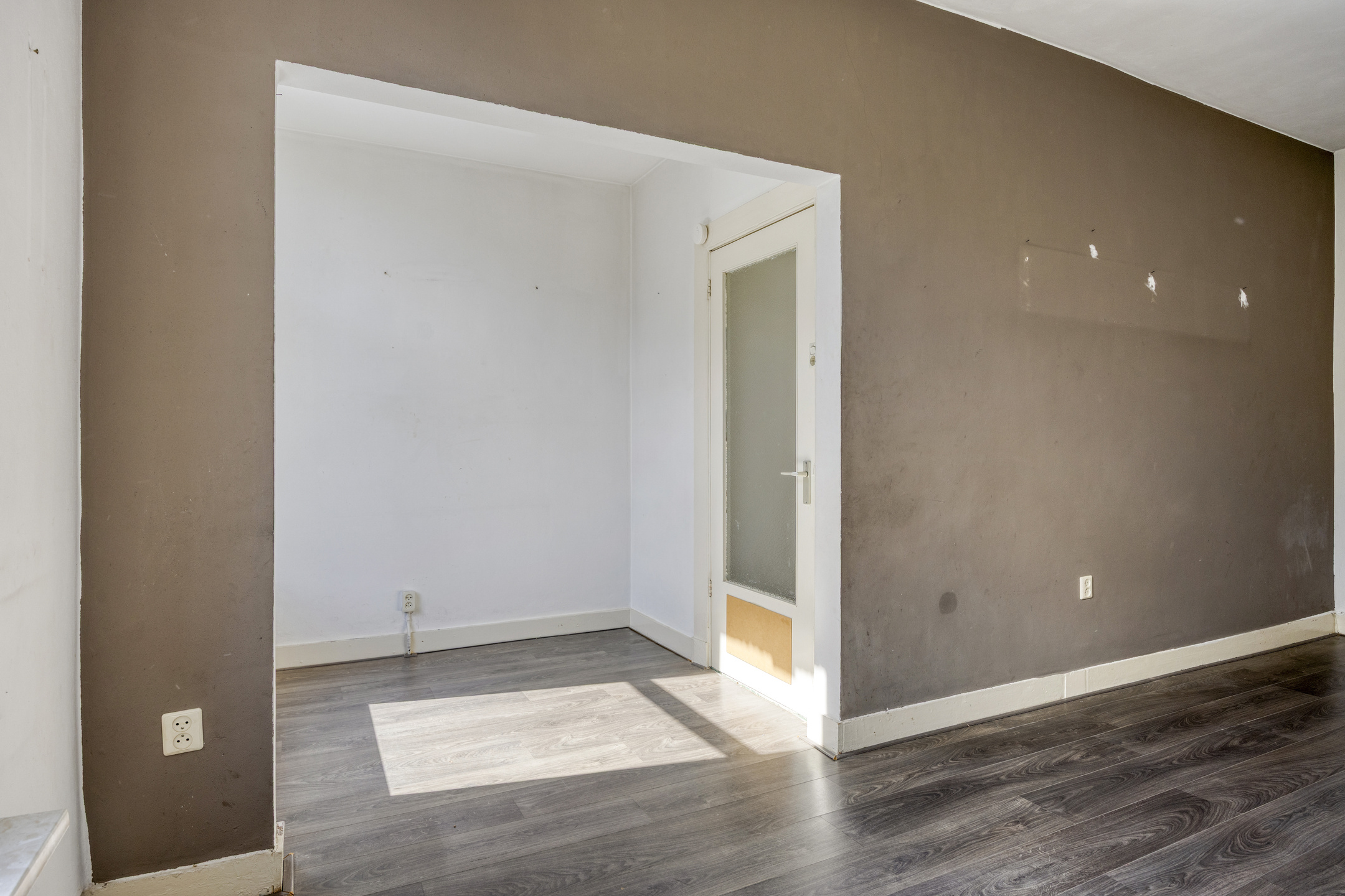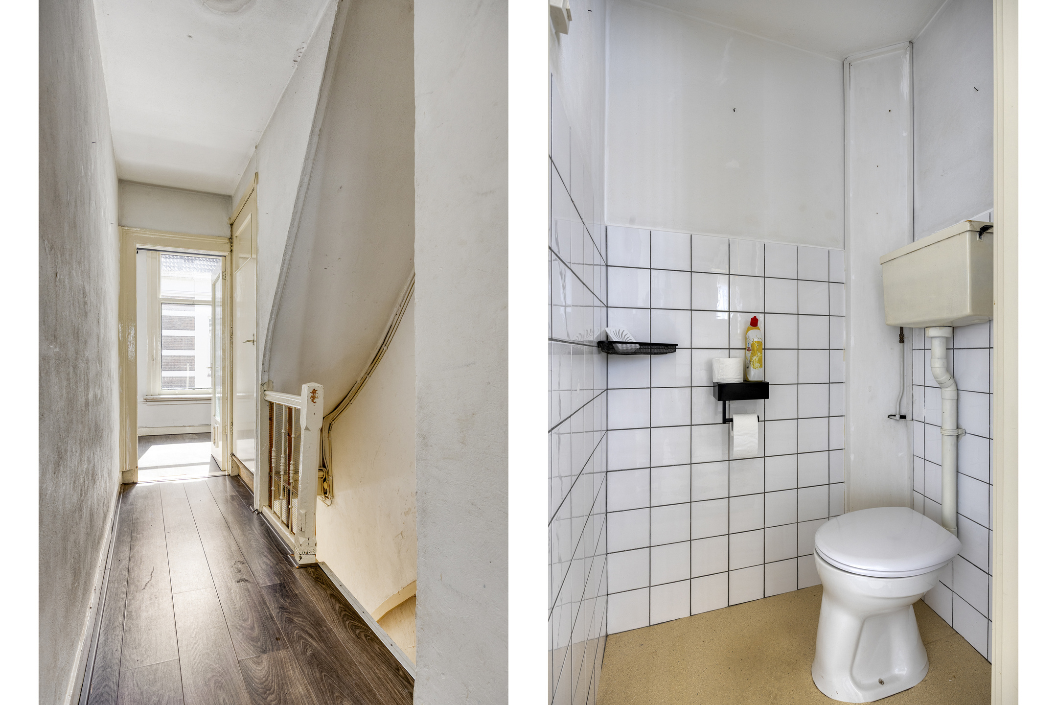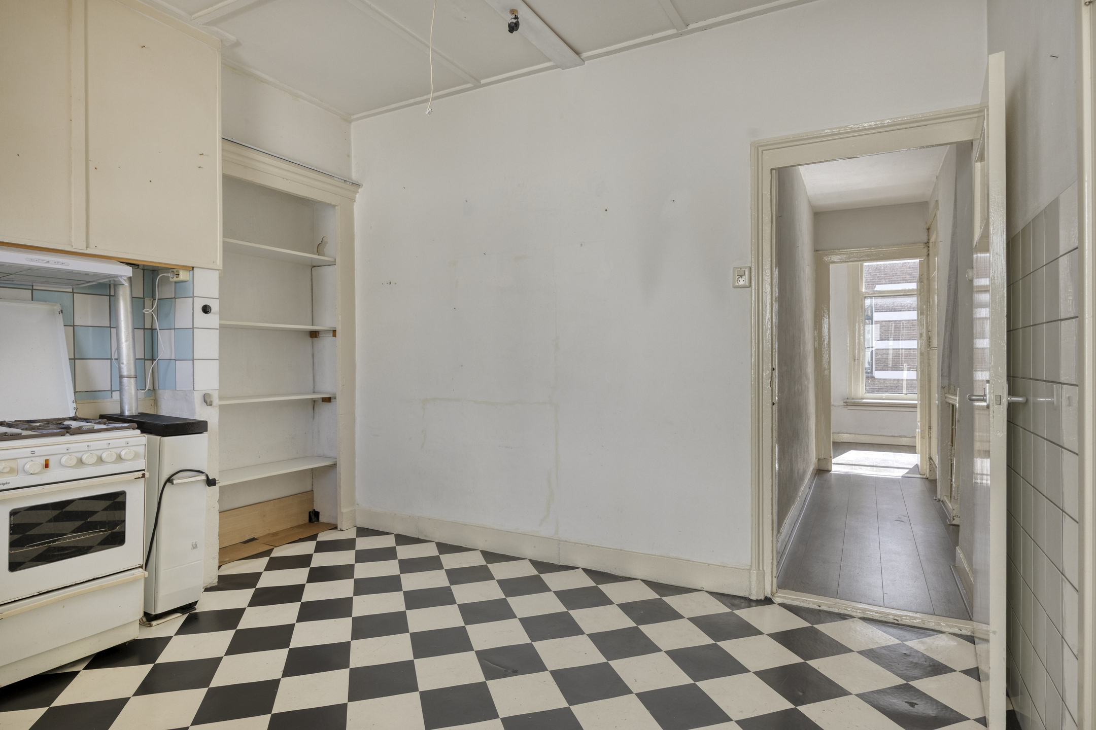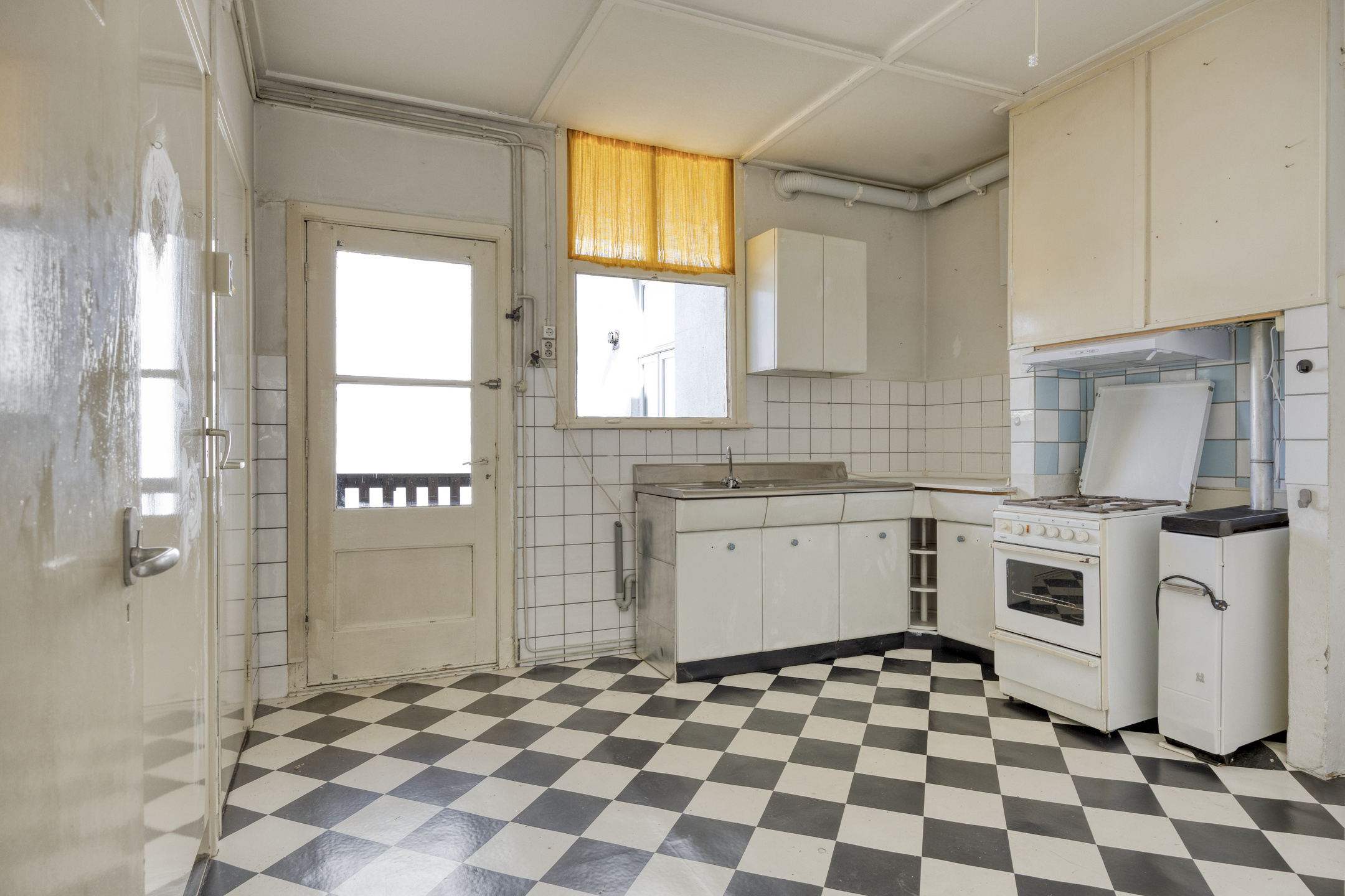 Op de overloop kom je uit bij de afzonderlijke keuken, gelegen aan de achterzijde van de woning. Vanuit de keuken heb je toegang tot het balkon, perfect voor een ochtendkoffie of een rustig moment in de buitenlucht. Direct naast de keuken bevinden zich het toilet en de doucheruimte. Aan de voorzijde van deze verdieping vind je de woonkamer; een fijne, lichte ruimte die net als de rest van de woning baat heeft bij een moderniseringsslag, maar veel potentie biedt om er iets moois van te maken.