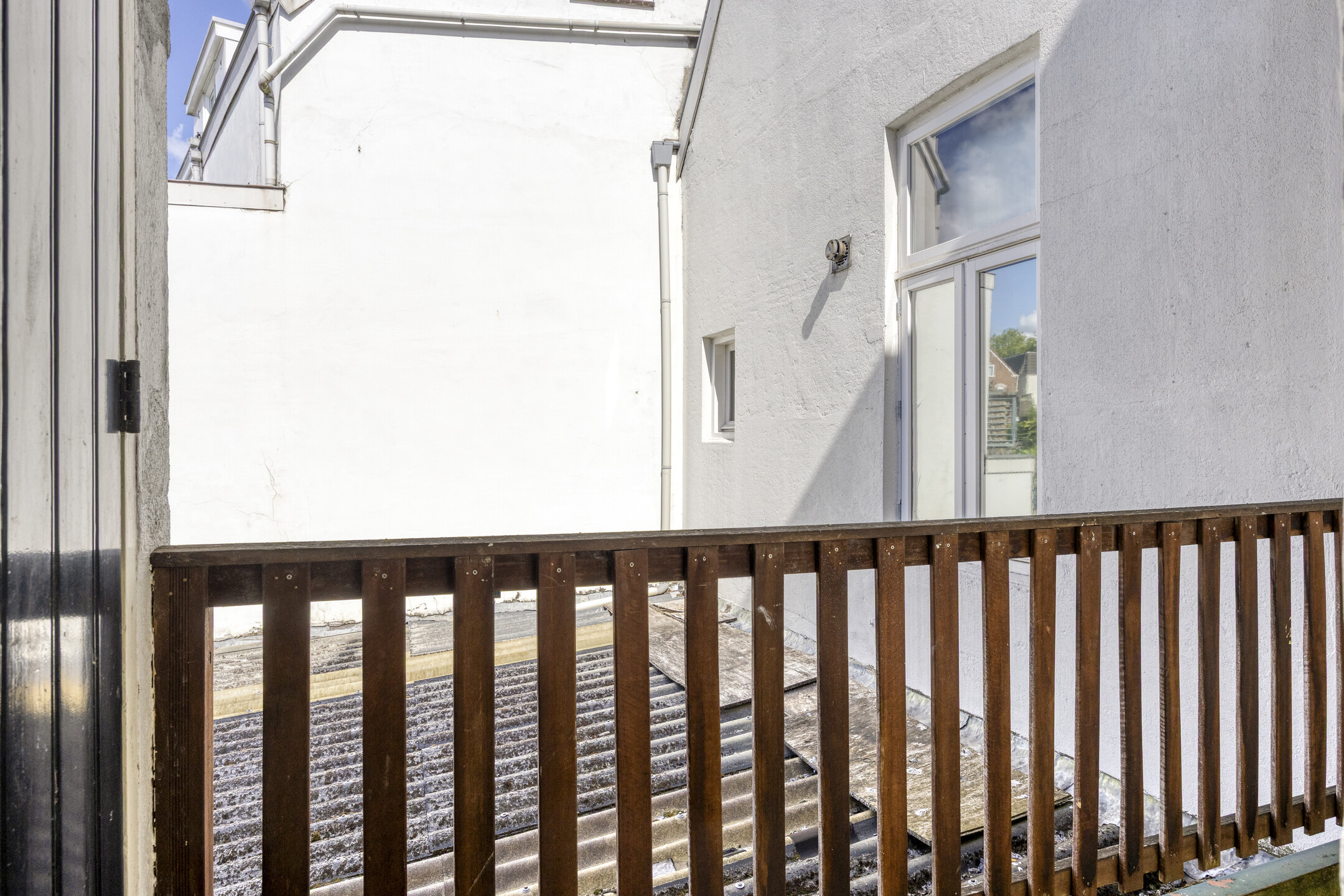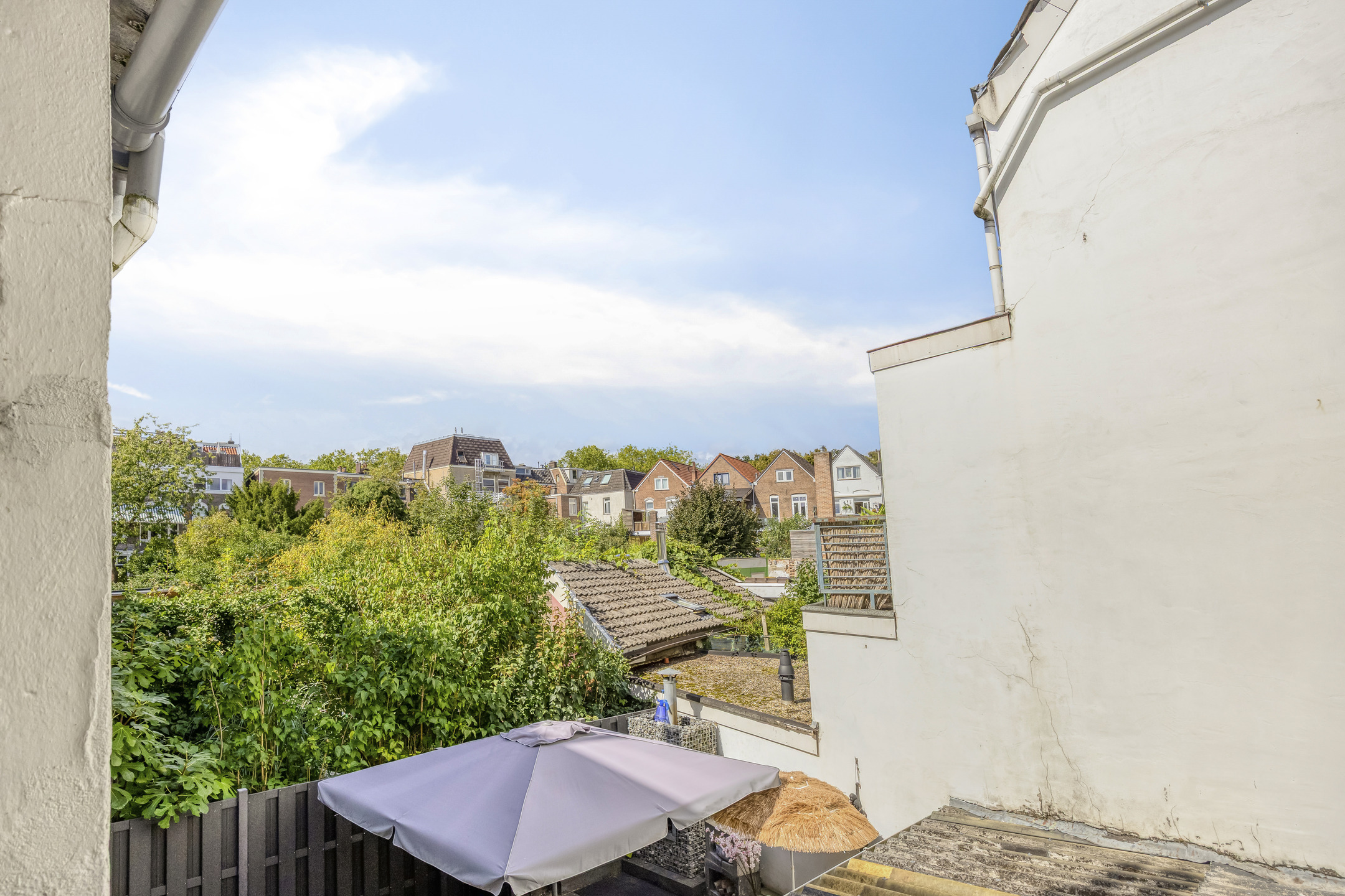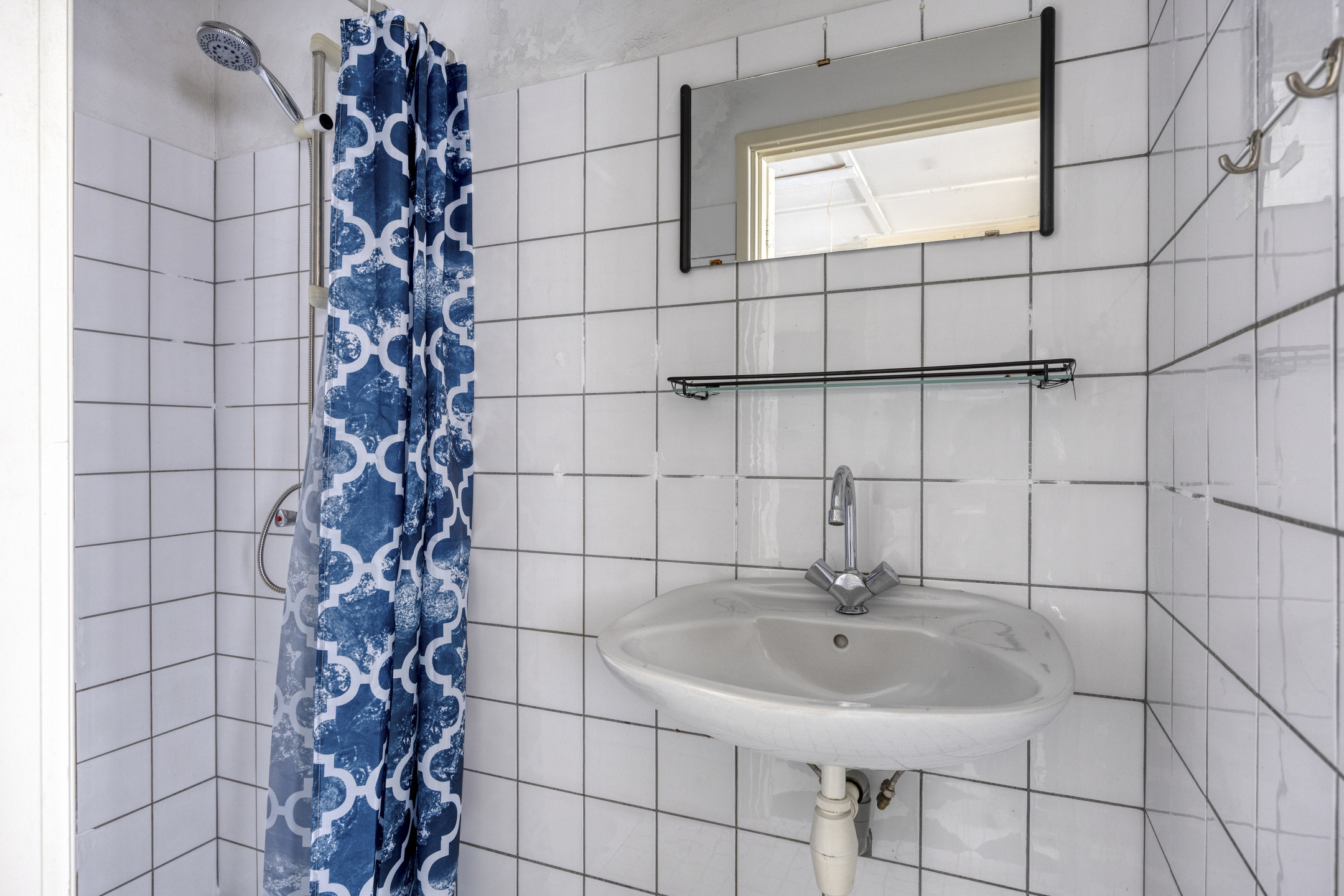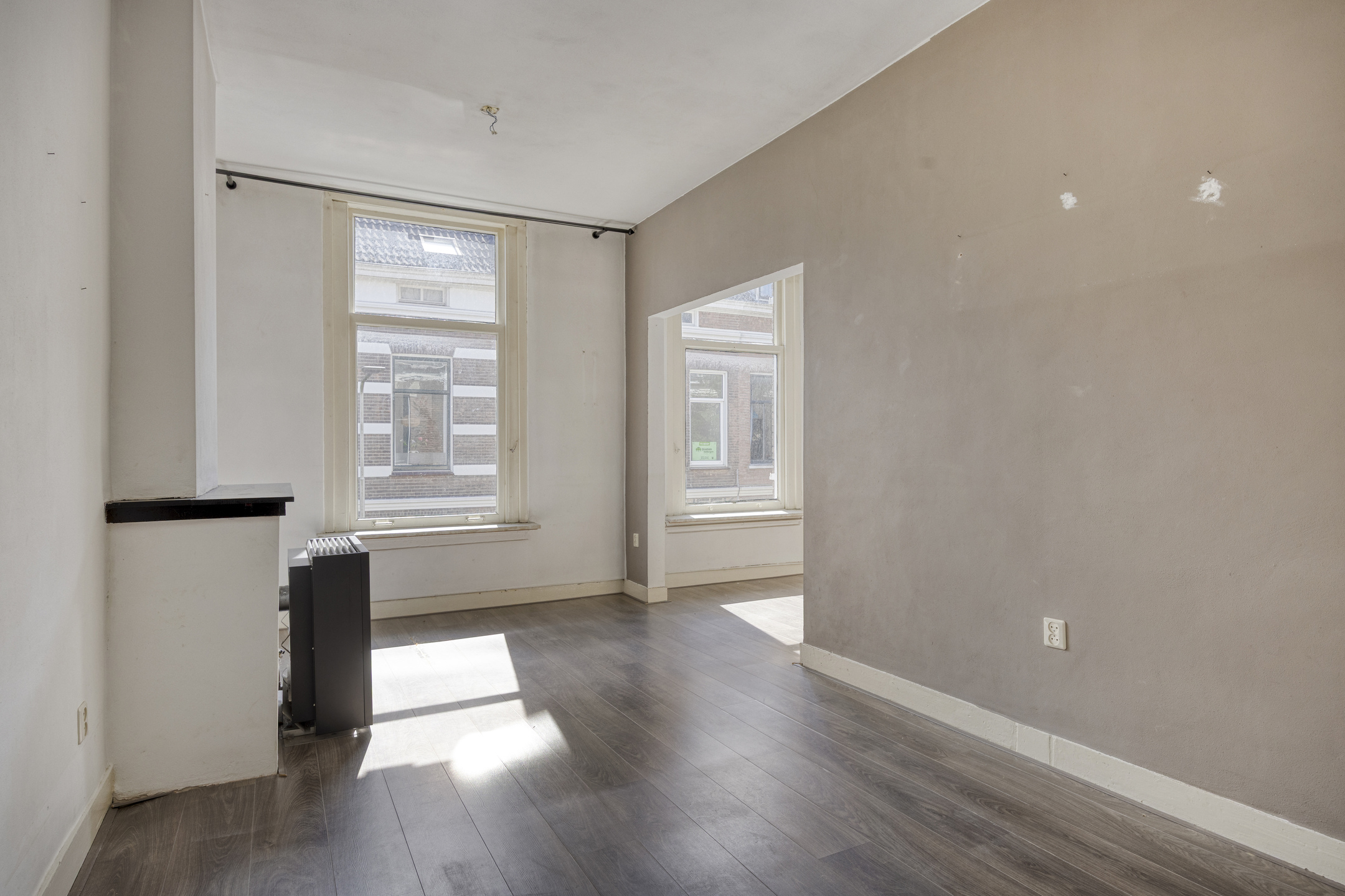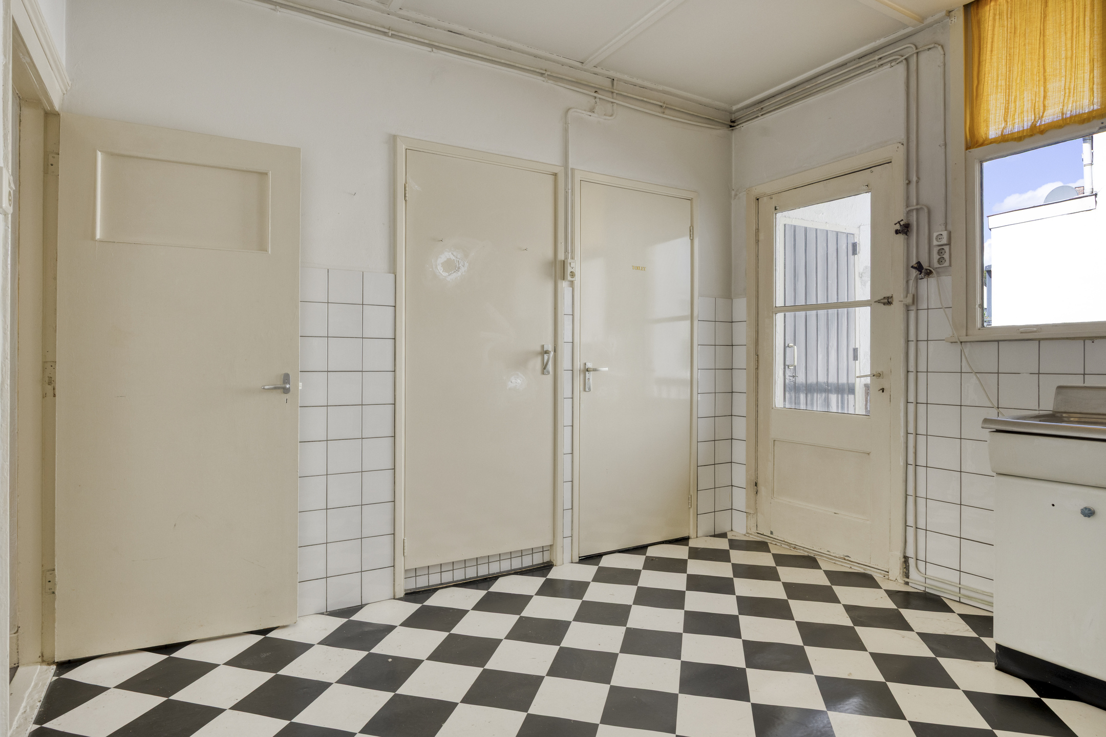 Op de overloop kom je uit bij de afzonderlijke keuken, gelegen aan de achterzijde van de woning. Vanuit de keuken heb je toegang tot het balkon, perfect voor een ochtendkoffie of een rustig moment in de buitenlucht. Direct naast de keuken bevinden zich het toilet en de doucheruimte. Aan de voorzijde van deze verdieping vind je de woonkamer; een fijne, lichte ruimte die net als de rest van de woning baat heeft bij een moderniseringsslag, maar veel potentie biedt om er iets moois van te maken.