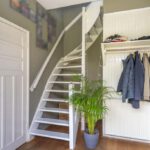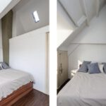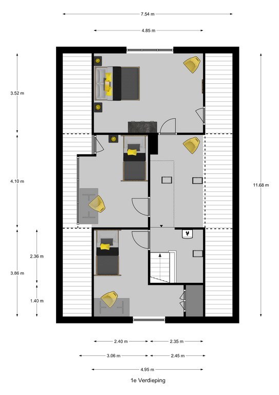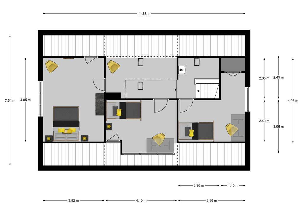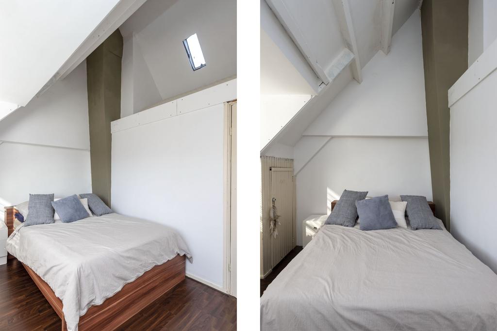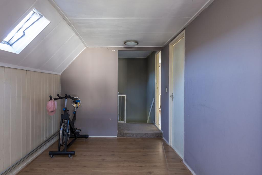 Overloop met opstelling van de cv-ketel en toegang naar de drie slaapkamers. Twee slaapkamers beschikken over een vliering en één slaapkamer heeft een hoogte tot aan de nok.