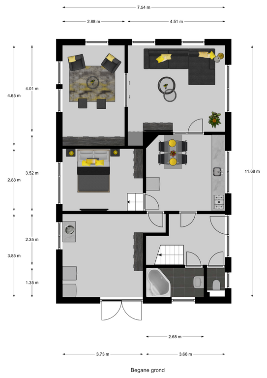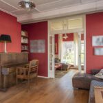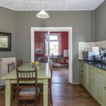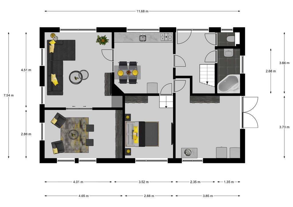 In de woonkeuken beschikt u over een lang keukenblad en heeft u ruimte genoeg voor het plaatsen van een grote eettafel. De slaapkamer is te bereiken vanuit de woonkeuken en ligt drie treden hoger dan de begane grond. Onder deze slaapkamer vindt u een ruime kelder voor de extra opslag. De speels ingerichte woonkamer, welke op te delen is in twee kamers middels en-suite deren, is gelegen aan de voorzijde.
