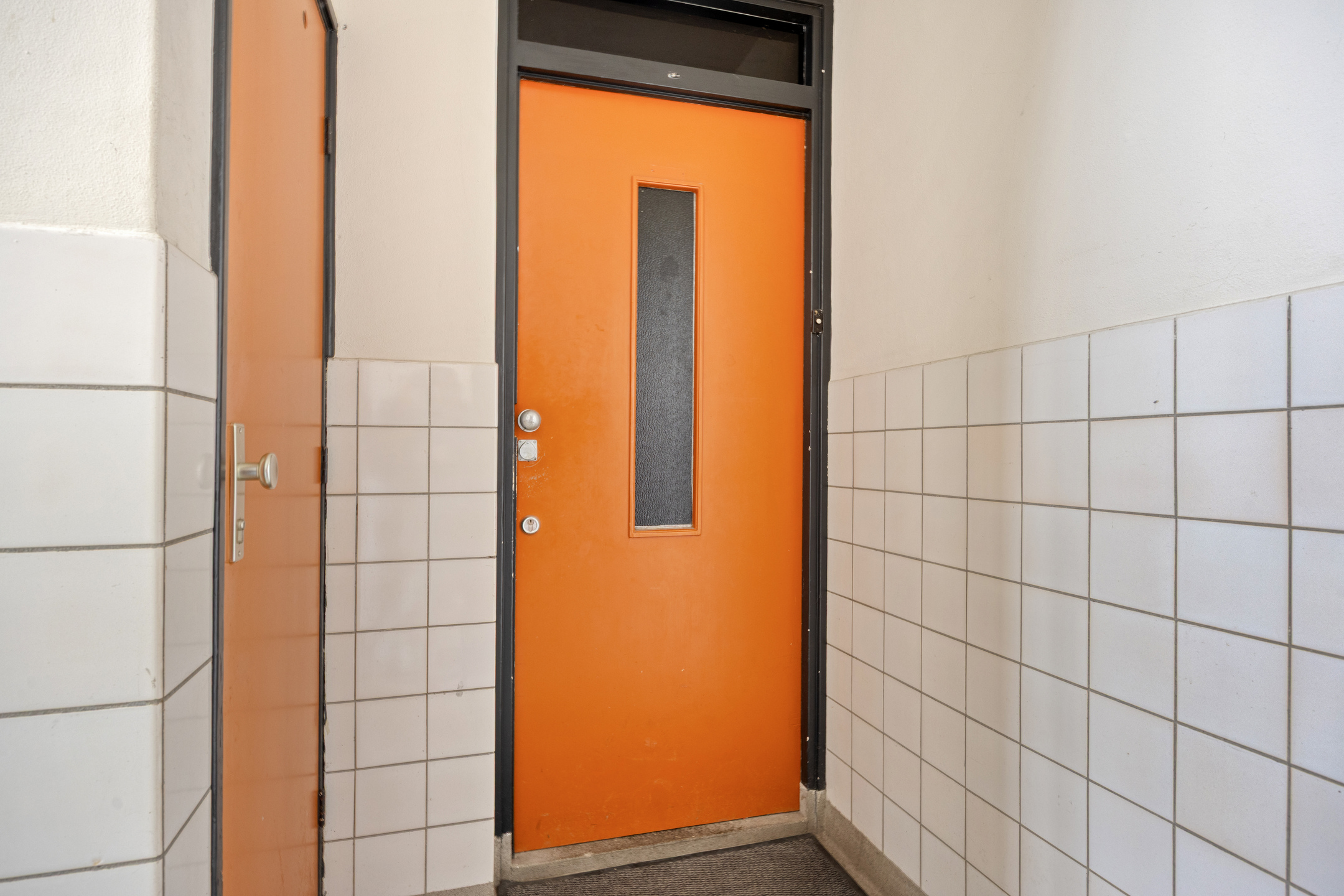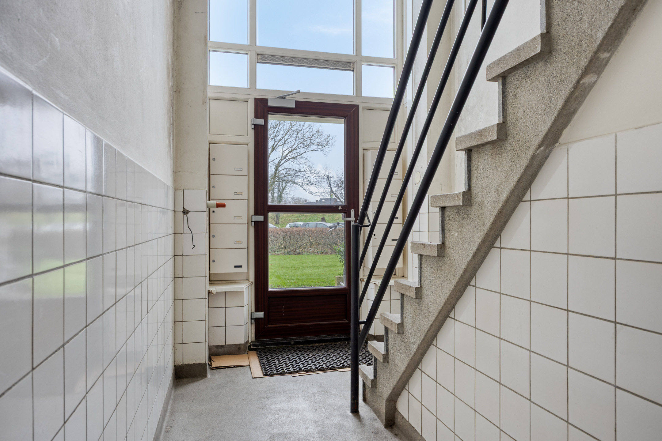 Centraal afgesloten entree met brievenbussen en trappenhuis.