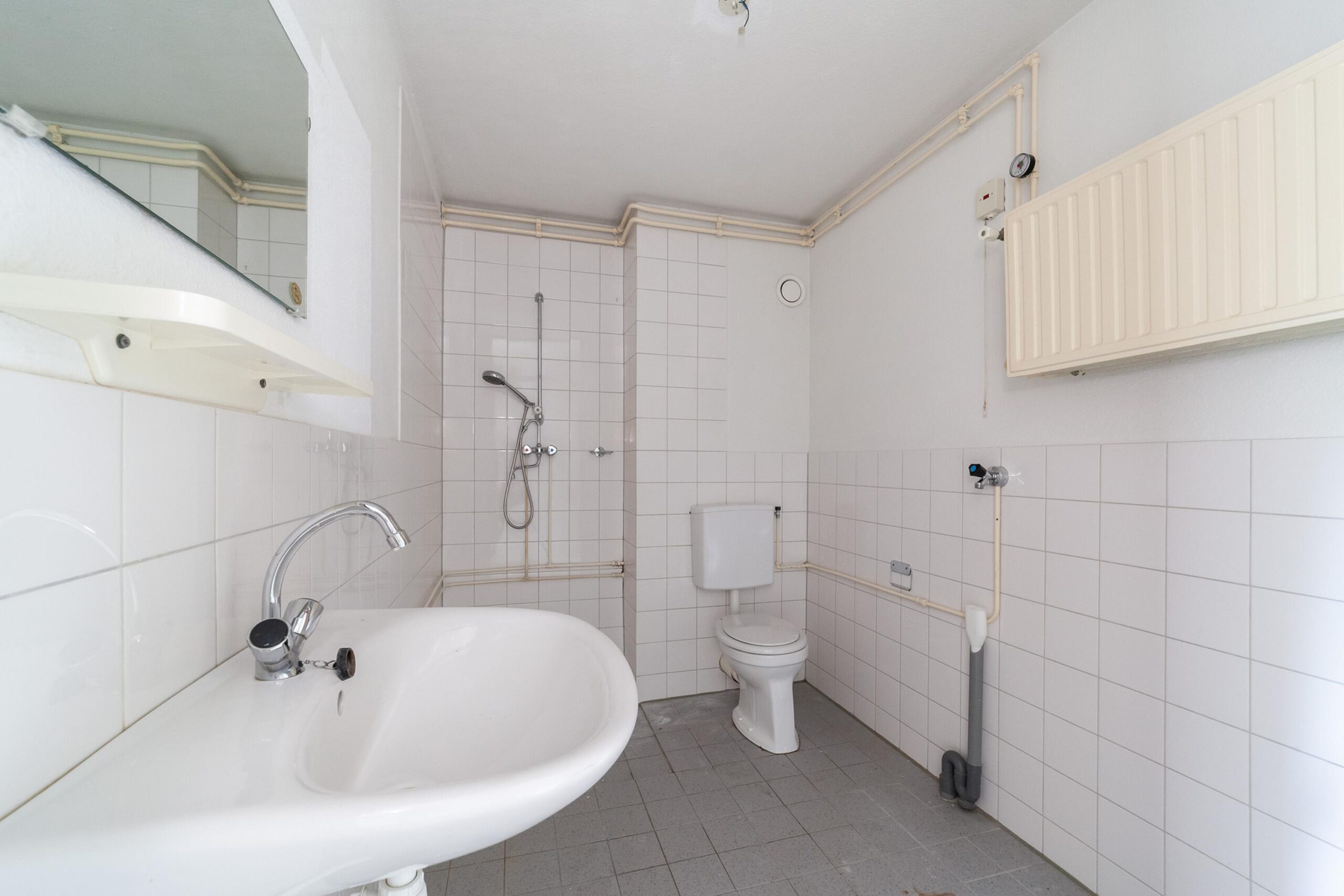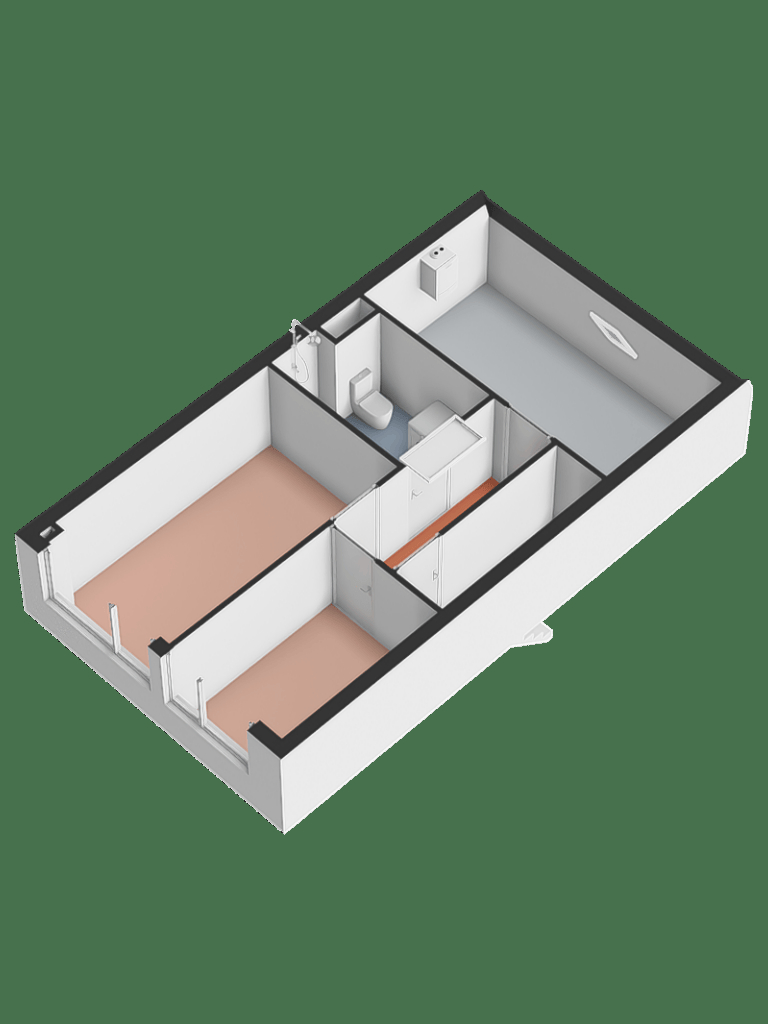 Overloop, twee slaapkamers, badkamer met douche, vaste wastafel en tweede toilet.