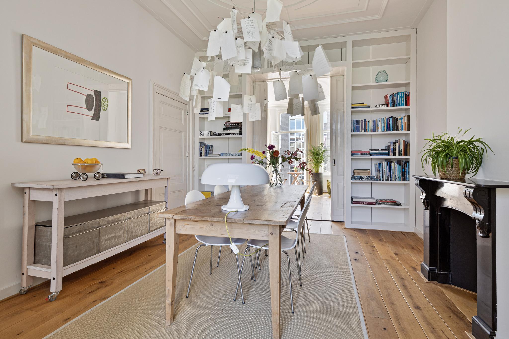Ruime bovenhal met zicht op het karakteristieke trappenhuis en hoge fraaie ornamenten plafonds. De ruime hal biedt een garderobe en een vernieuwd toilet. Toegang tot de sfeervolle en zeer lichte woonkamer en- suite en grote woonkeuken met kookeiland en alle denkbare inbouwapparatuur. De huidige eigenaren hebben de keuken opengemaakt en daardoor is een mooie doorkijk ontstaan. De woonkamer en-suite is prachtig, alle mooie authentieke details zijn bewaard gebleven, ornamenten plafonds, kamer-ensuite deuren met inbouwkasten en natuurstenen schouwen. Ook is deze verdieping voorzien van een heerlijk balkon aan de voorzijde. Aan de achterzijde is een ruim balkon met overkapping aanwezig. Genieten van een kopje koffie of een heerlijk drankje in de zon gegarandeerd.