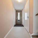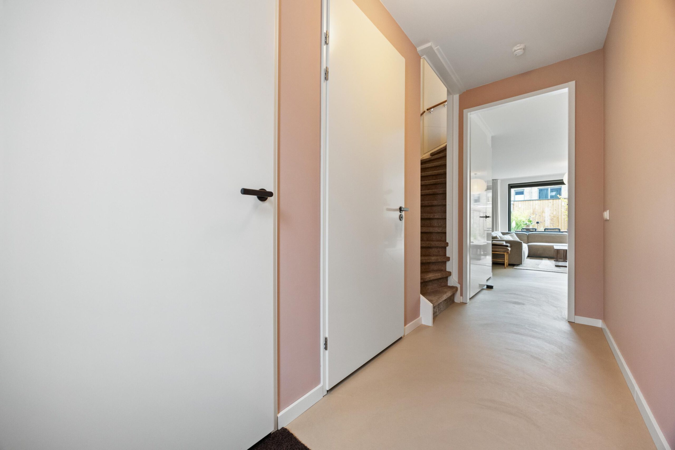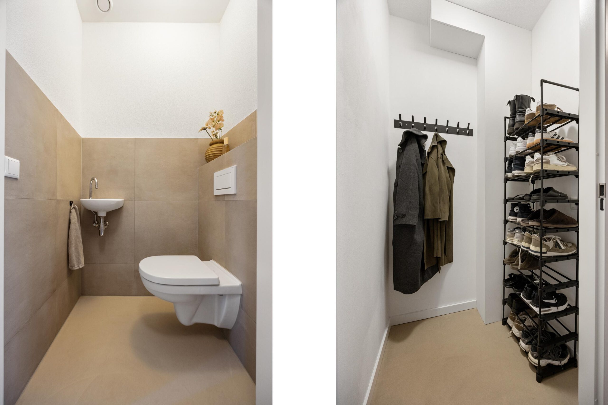 Ruime entree, hal met inbouwkast, perfect als garderobe en schoenenkast, meterkast en luxe toilet met fontein.