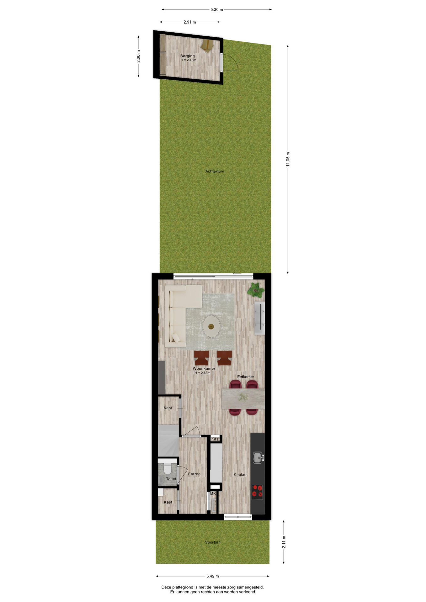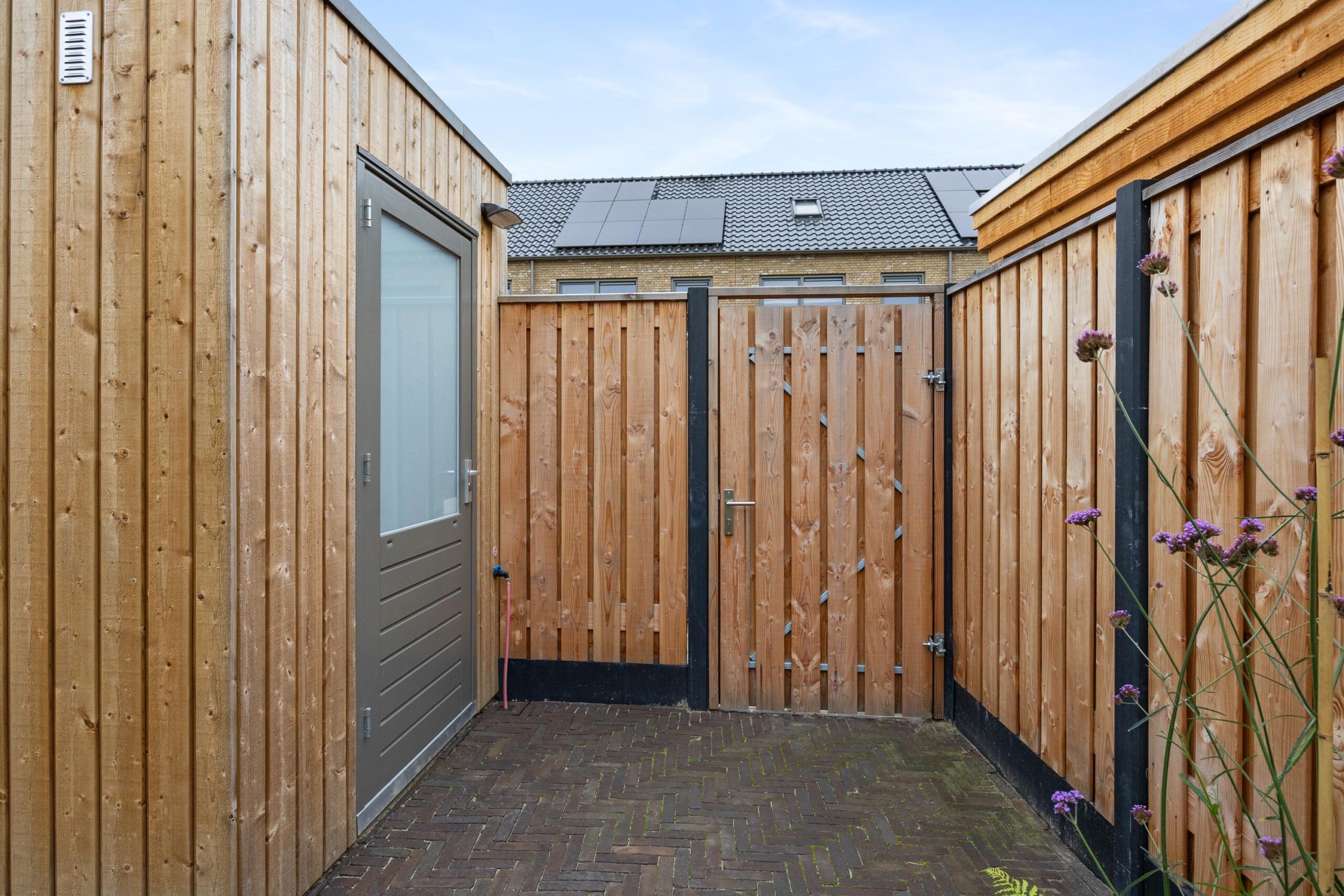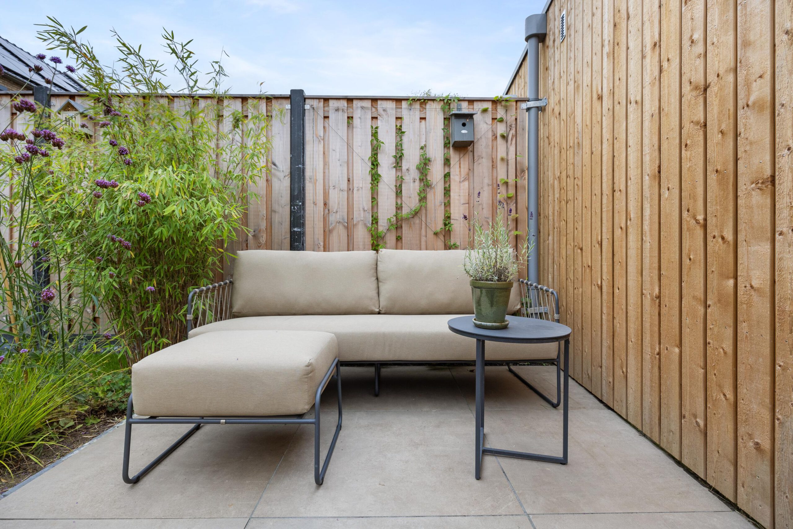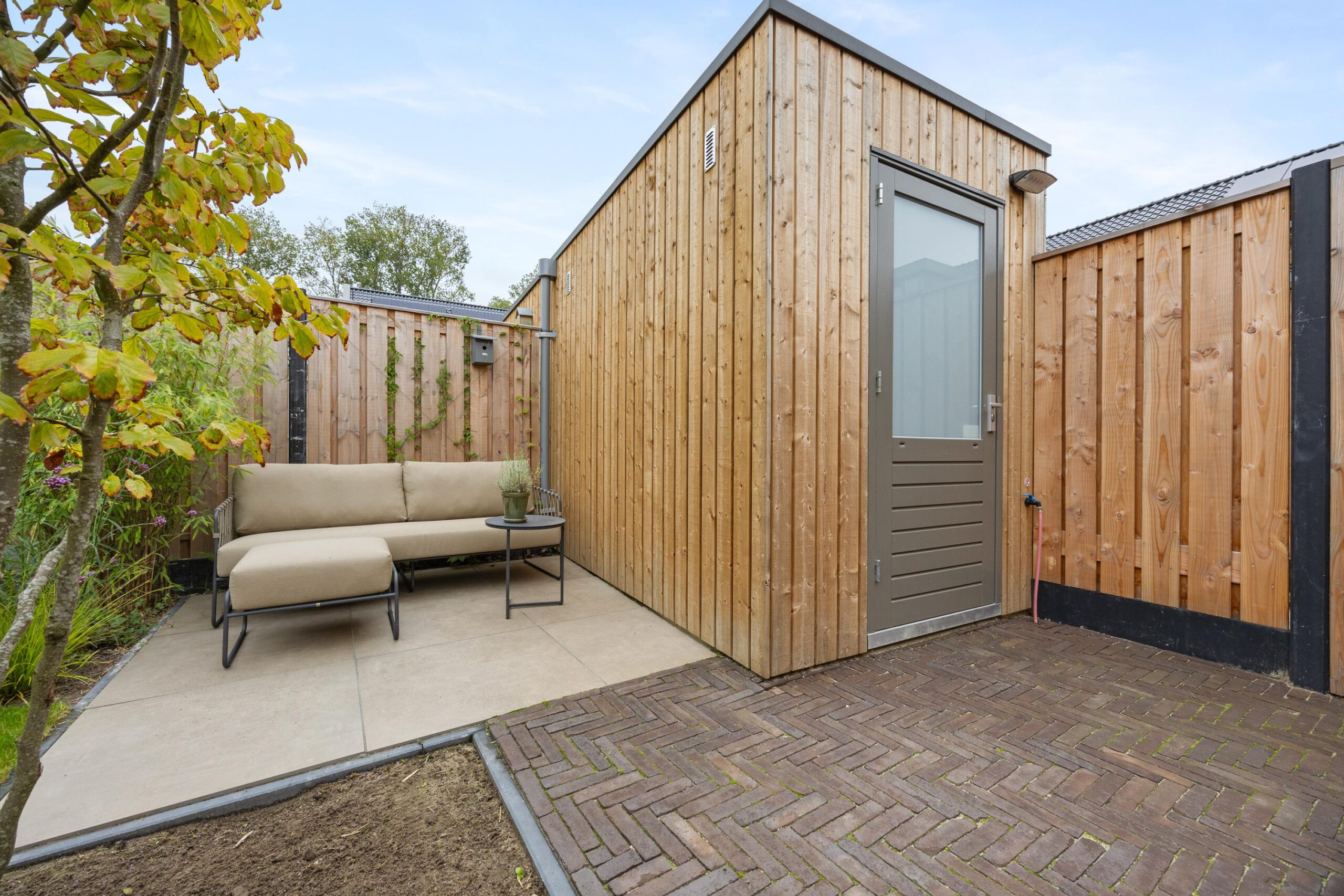 Zonnige en prachtig aangelegde tuin voorzien van sfeervolle zitjes, genieten van de zon gegarandeerd. Ook is er een ruime berging en een achterom