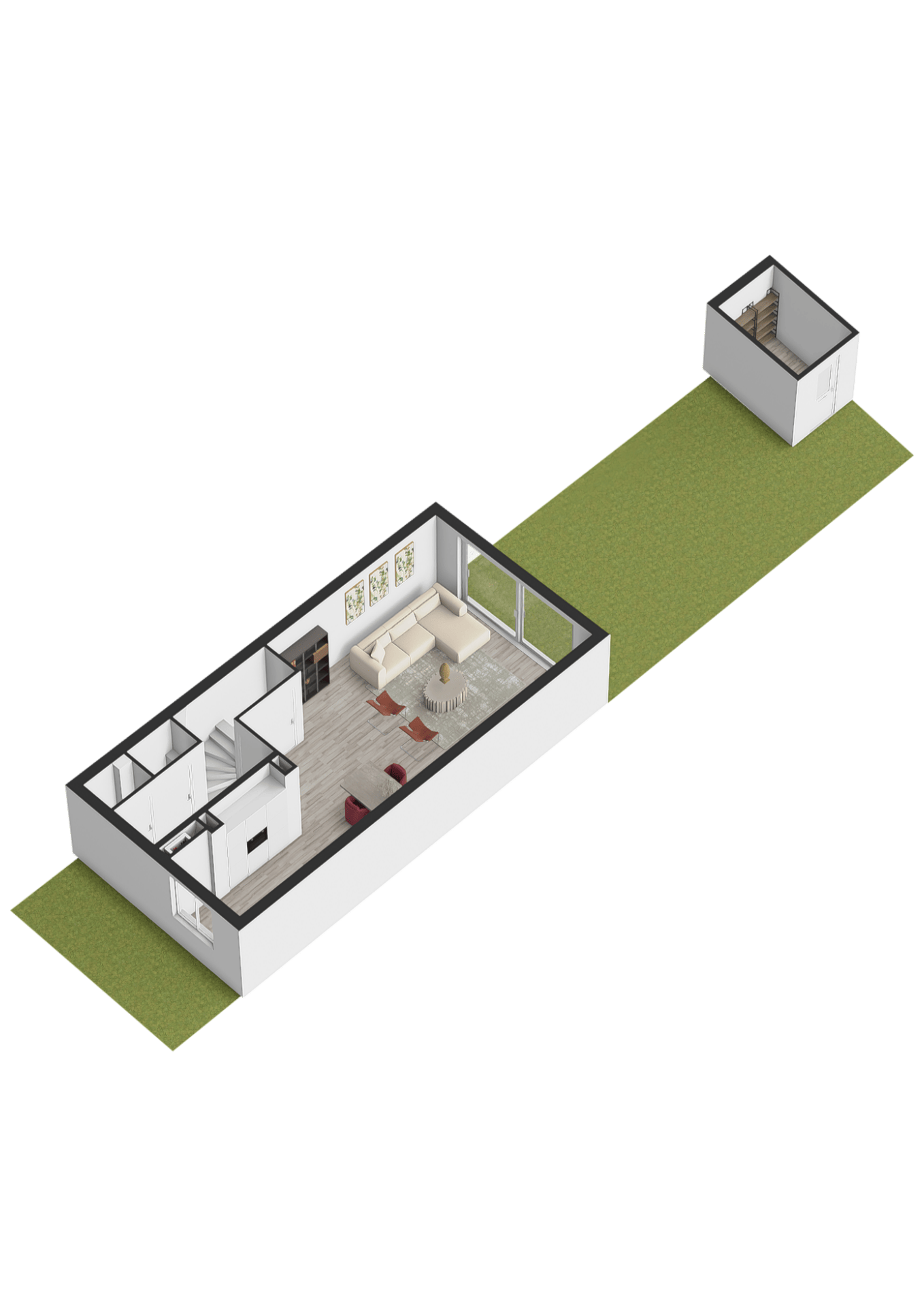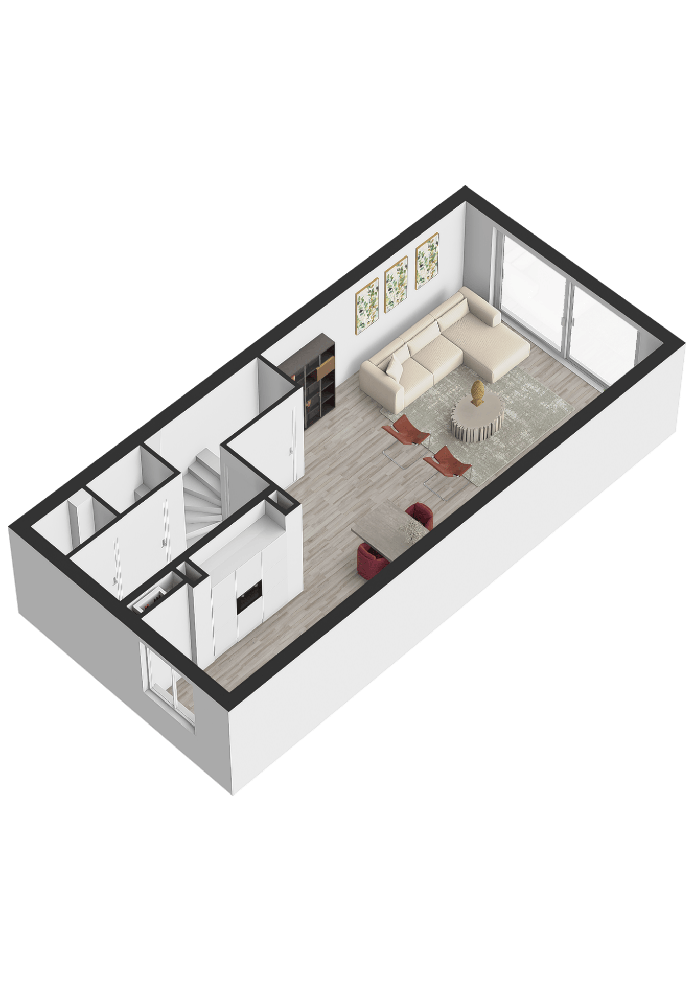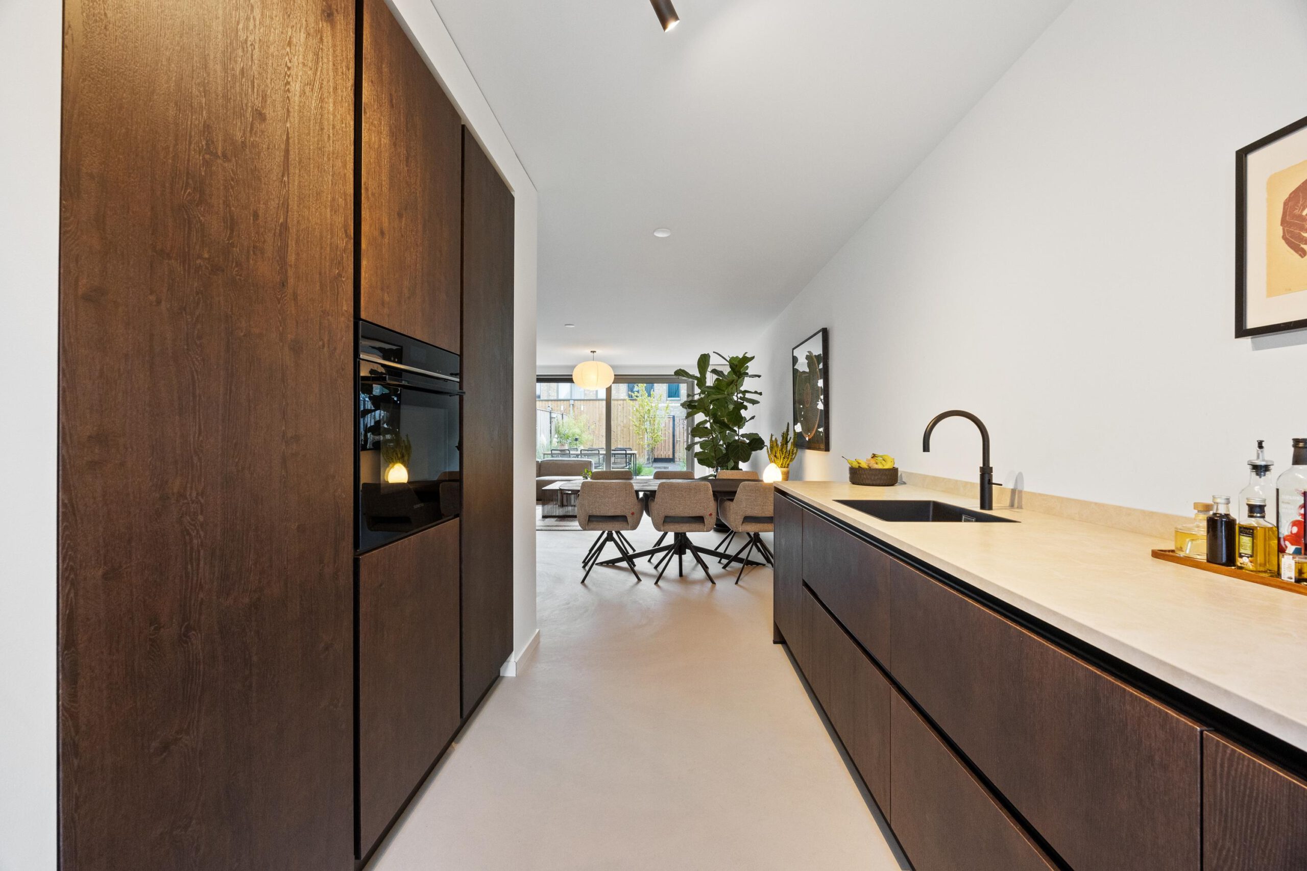 Ruime en uitgebouwde woonkamer met een strakke eigentijdse lavasteen gietvloer voorzien van vloerverwarming. Prachtige open keuken voorzien van luxe inbouwapparatuur en veel bergruimte. Middels de mooie stijlvolle schuifpui kom je in de zeer fraai aangelegde zonnige tuin met achterom.
