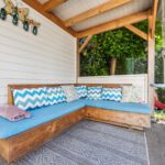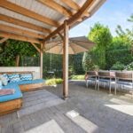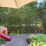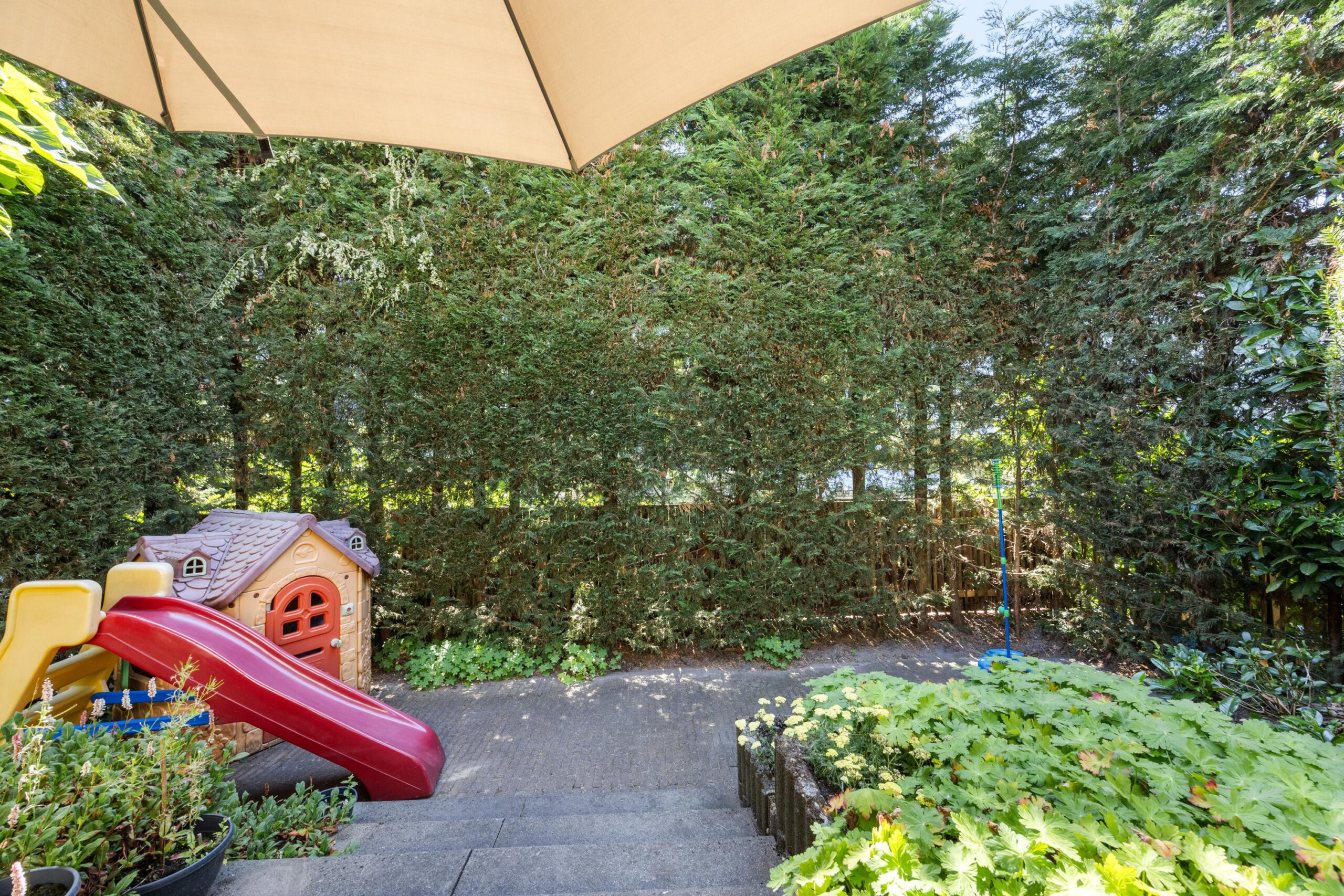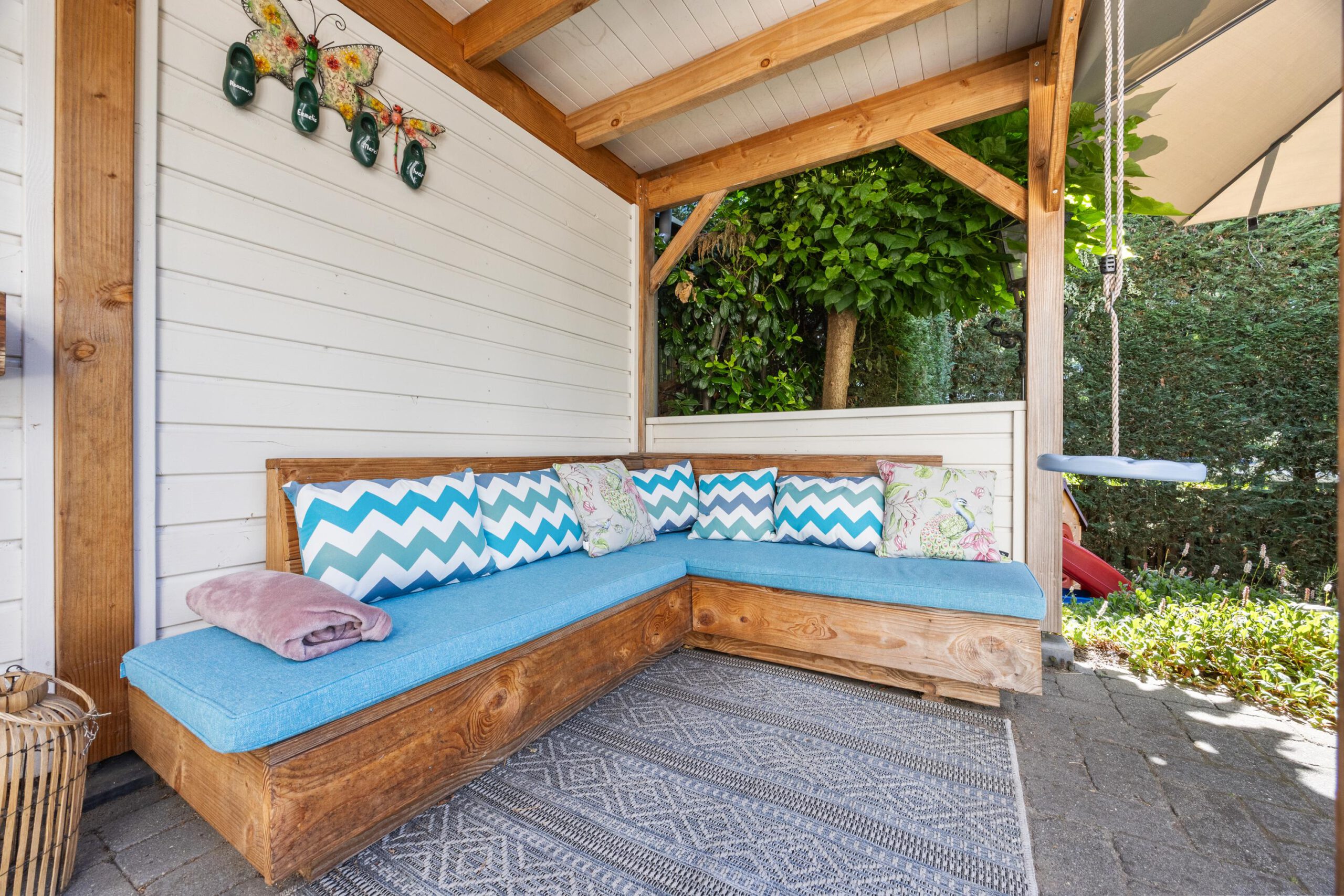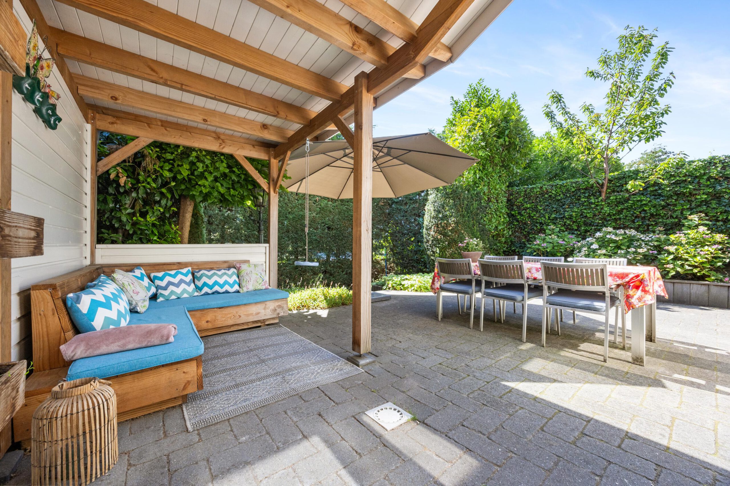 De sfeervolle tuin op het zuiden is een echte verlenging van de leefruimte, met een gezellig terras en een praktische overkapping. Deze overkapping is een waardevolle toevoeging aan het woongenot: of je nu op een zomerse dag de verkoelende schaduw opzoekt, of op een frisse herfstavond beschut wil zitten met een kop thee of een goed glas wijn – hier kan het allemaal. Dankzij deze fijne buitenruimte geniet je het hele jaar door van het buitenleven, ongeacht het seizoen.