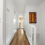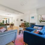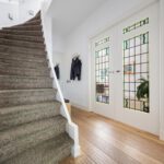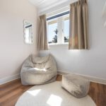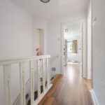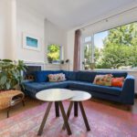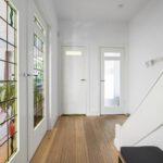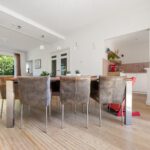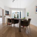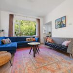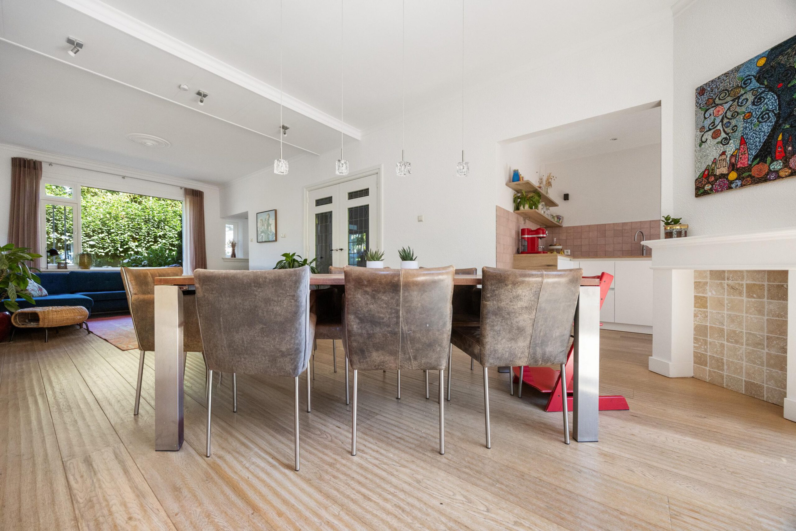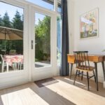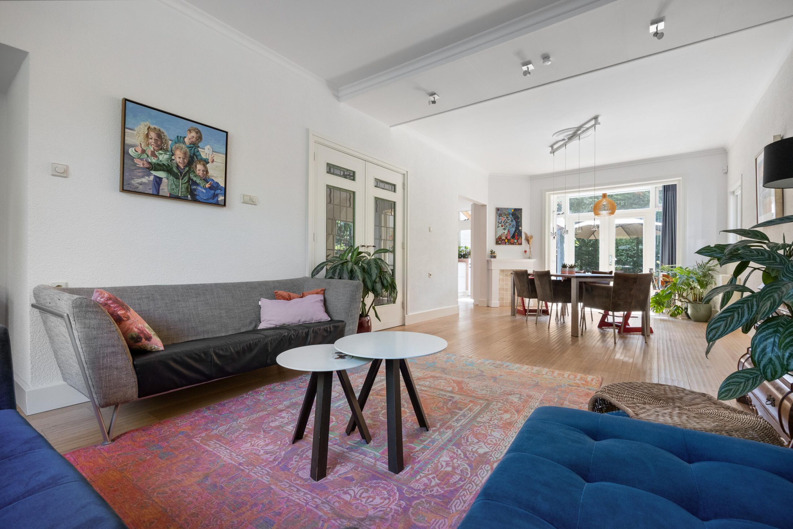 Bij binnenkomst in de hal valt direct het prachtige glas-in-lood op in de stijlvolle toegangsdeuren naar de woonkamer – een charmant detail dat direct de toon zet. De ruime, lichte woonkamer vormt het warme hart van de woning. Aan de achterzijde zorgen openslaande deuren voor een natuurlijke verbinding met de tuin, waardoor binnen en buiten naadloos in elkaar overlopen.