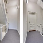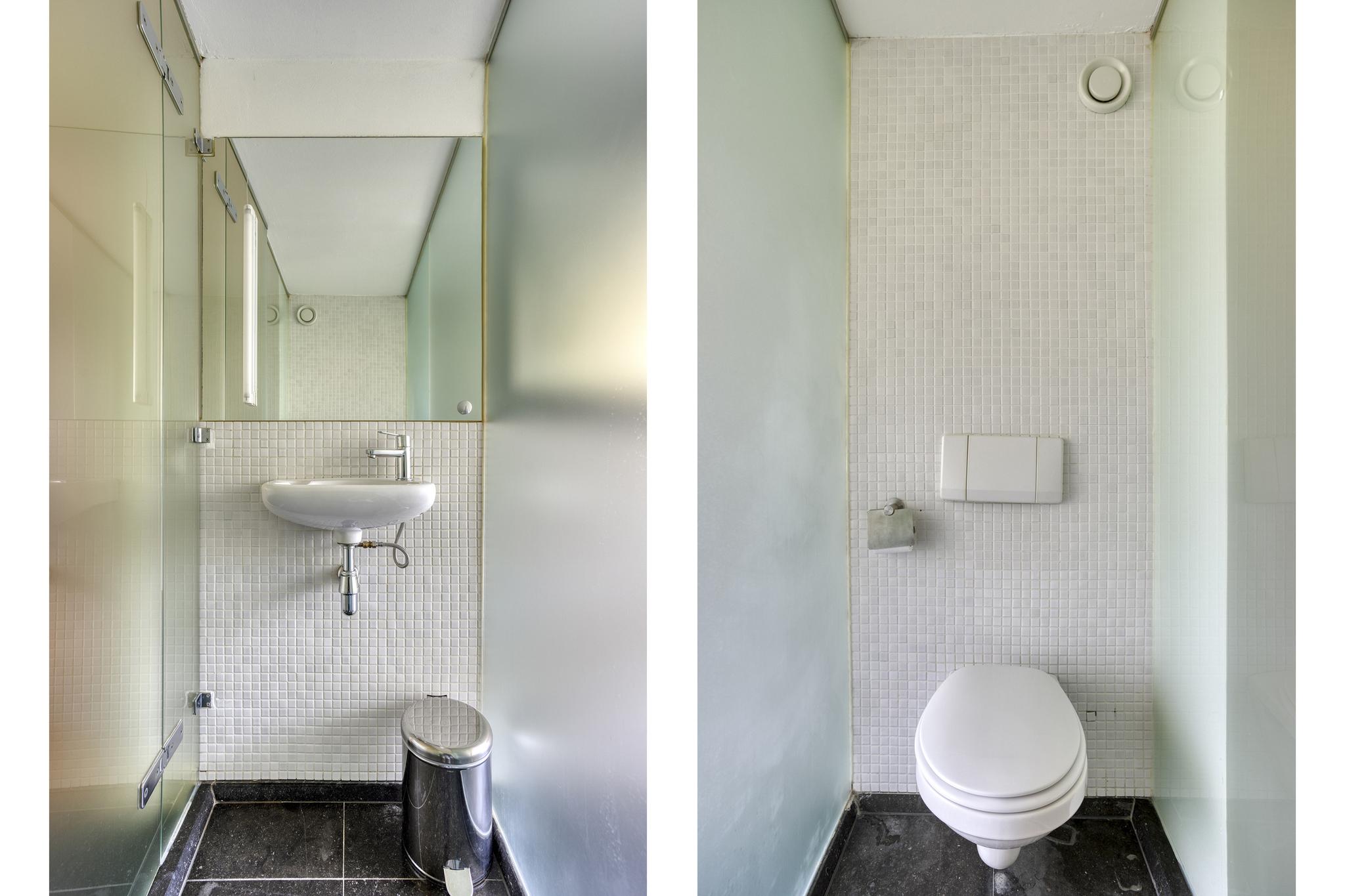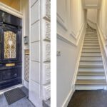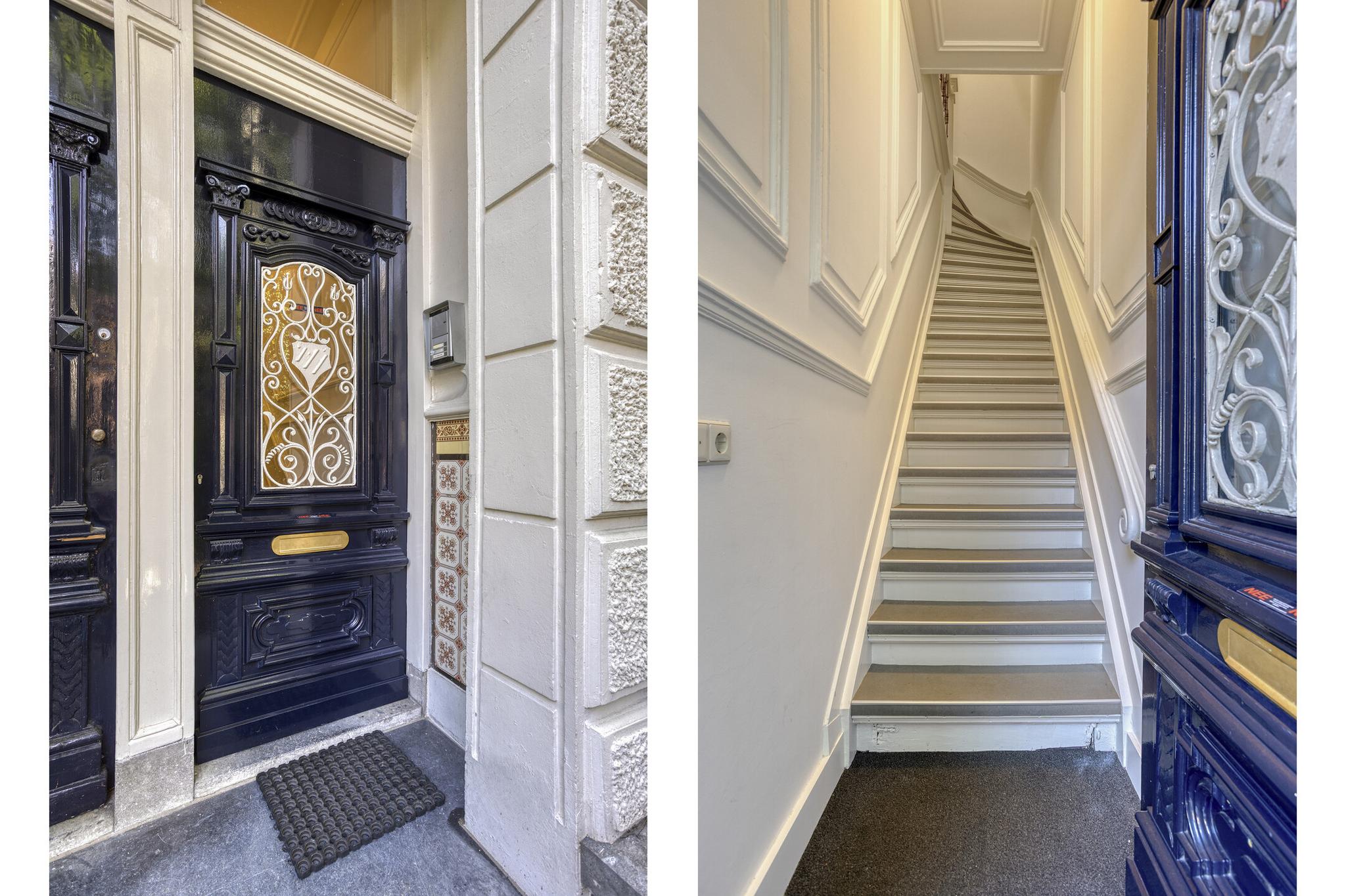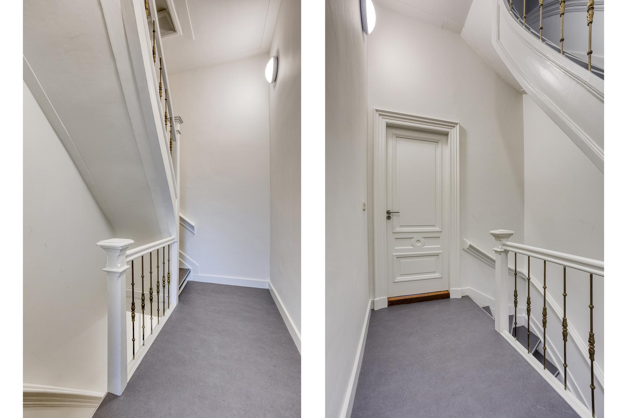 Perfect onderhouden trap op gang, overloop, ingang, portaal-entree, garderobe kastenwand, c.v. ketel kast, toilet met fontein met hardstenen vloer.
