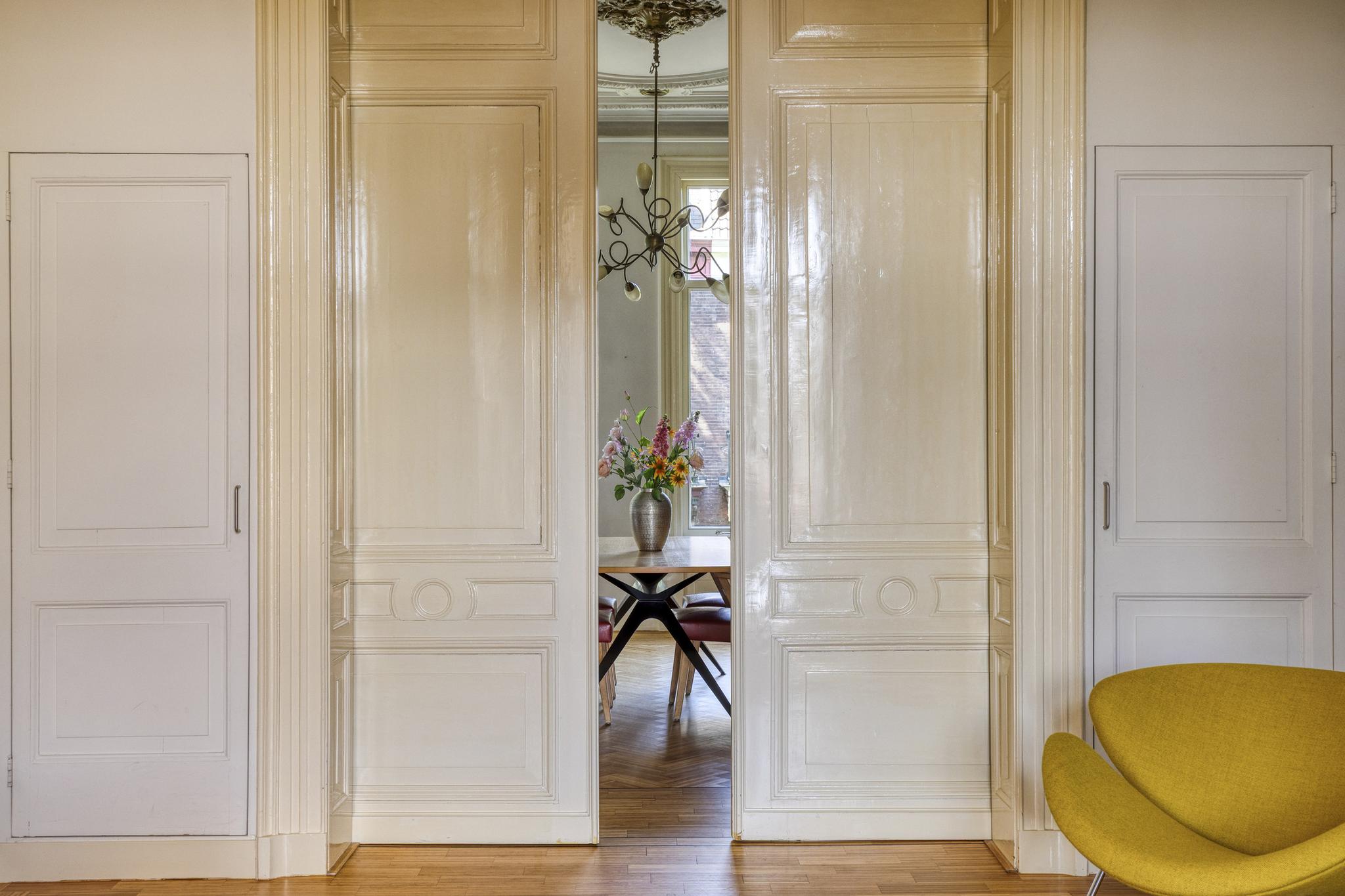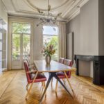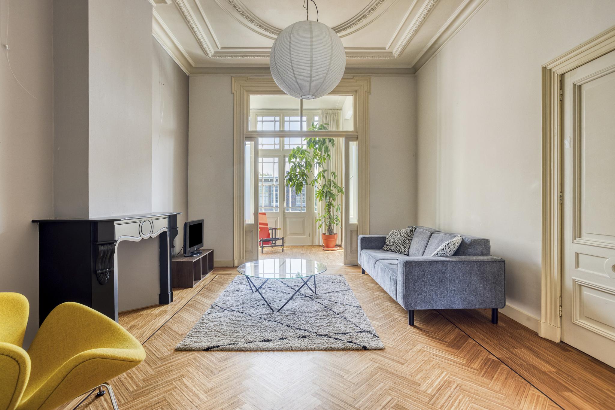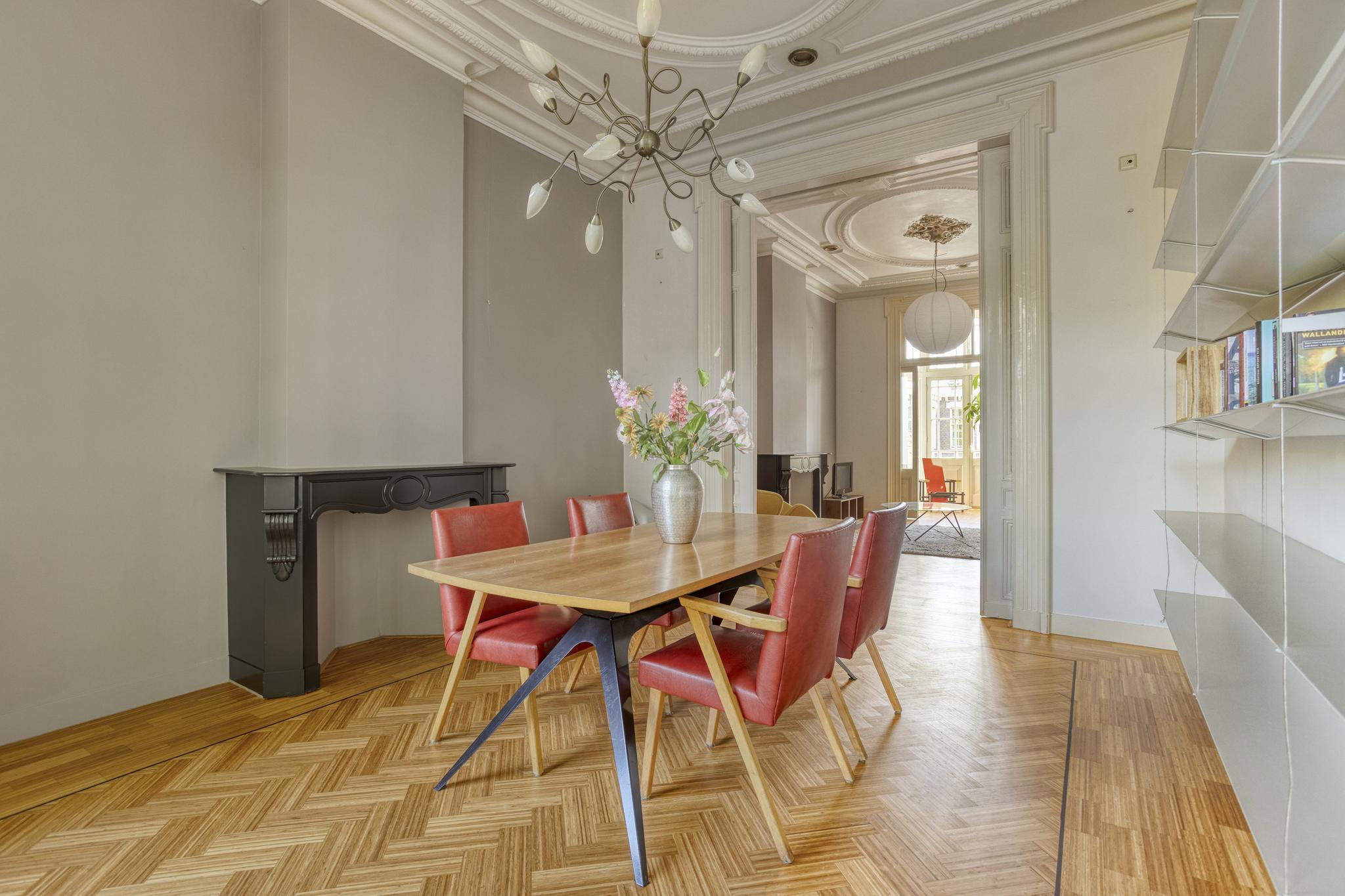 Royale kamer en suite met schuifdeuren, hoge geornamenteerde plafonds, vanuit de voorkamer stap je op het westen gelegen voorbalkon, half open volledig ingericht, authentieke schouwen.