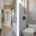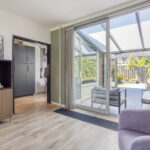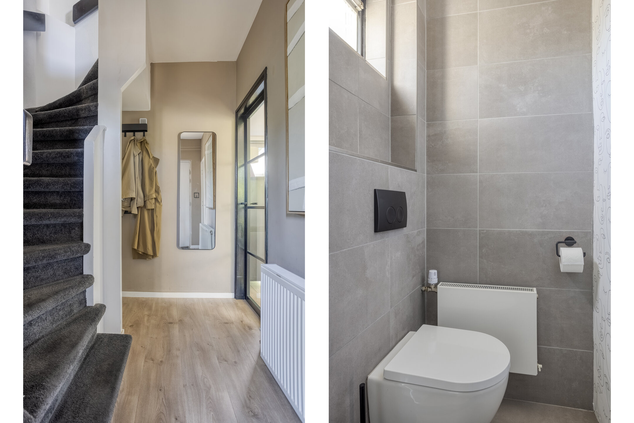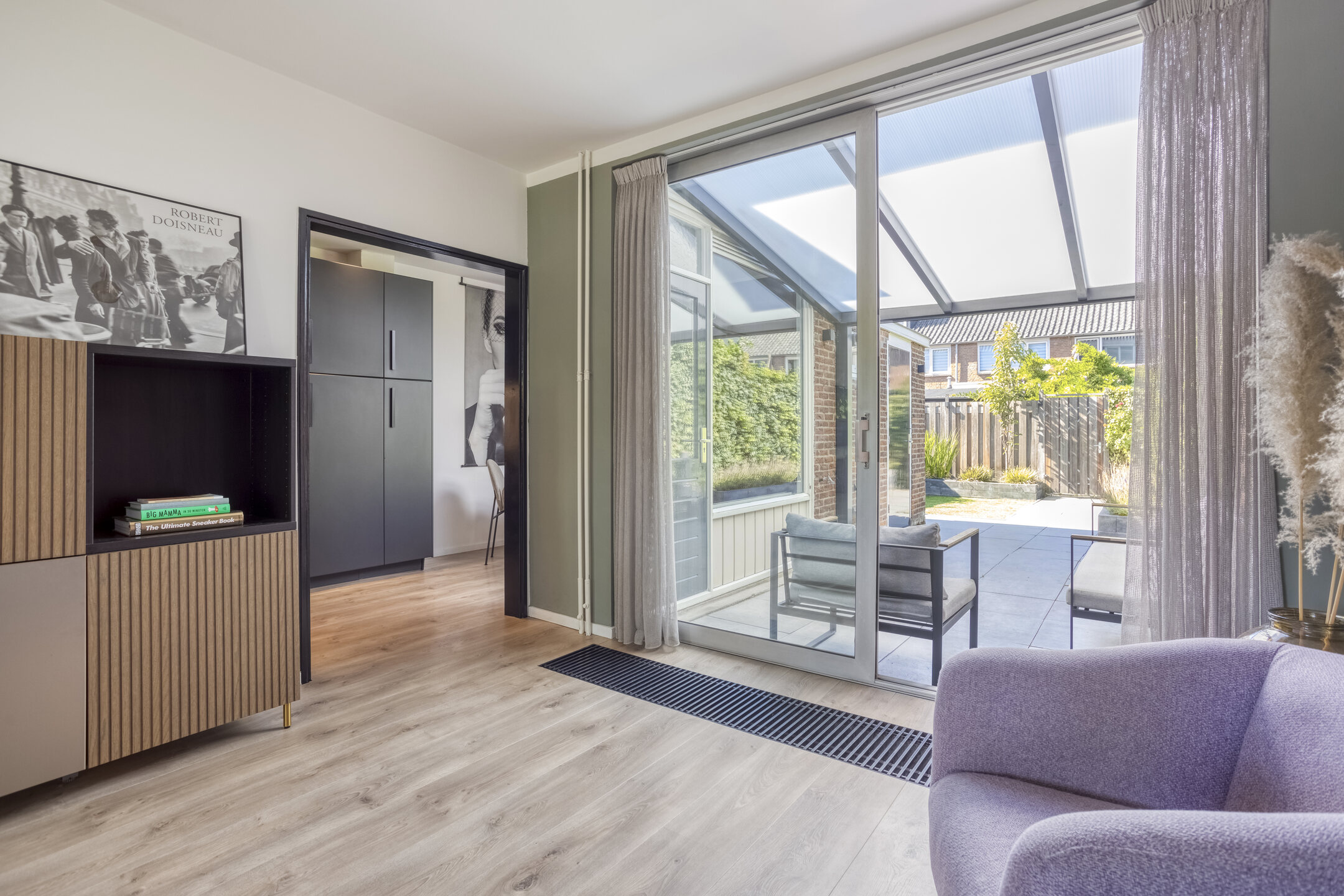 Entree met hal, welke toegang geeft tot het toilet en de royale woonkamer. De woonkamer is voorzien van een schuifpui naar de overkapping en geeft tevens toegang naar de woonkeuken. Deze moderne en luxe keuken is voorzien van diverse inbouwapparatuur, waaronder: inductie met afzuigkap, vaatwasser, combi magnetron en koelkast. Bij deze woonkeuken is er ook een ideale ruimte voor de eetkamer, welke ook doorgang biedt tot de overkapping.