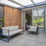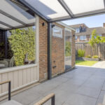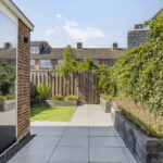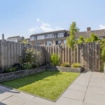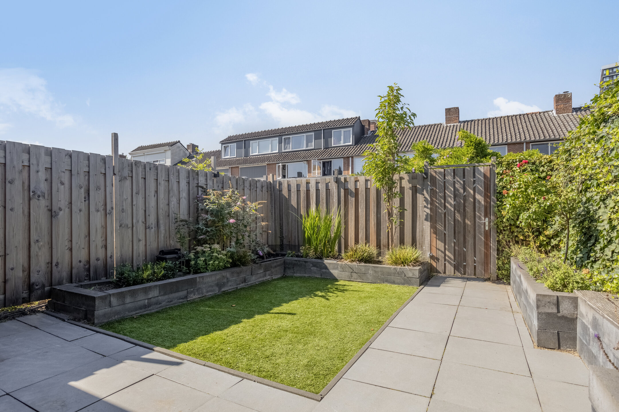 Fijne achtertuin gelegen op het zuid westen met diverse groen borders, kunstgras, vrijstaande stenen berging en een achterom.