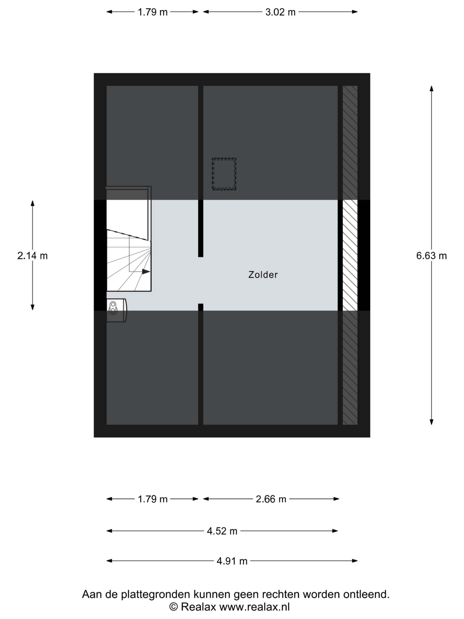 Via een vaste trap bereikbare ruime bergzolder met voorzolder en opstelling van de cv-ketel (AWB, 2018). Daarnaast is er een kleine zolderkamer, geschikt als werk- of hobbyruimte. Mechanische ventilatie is aanwezig.