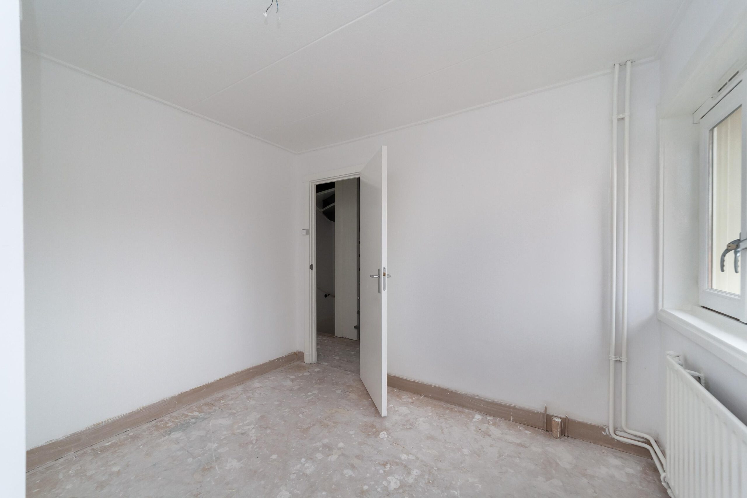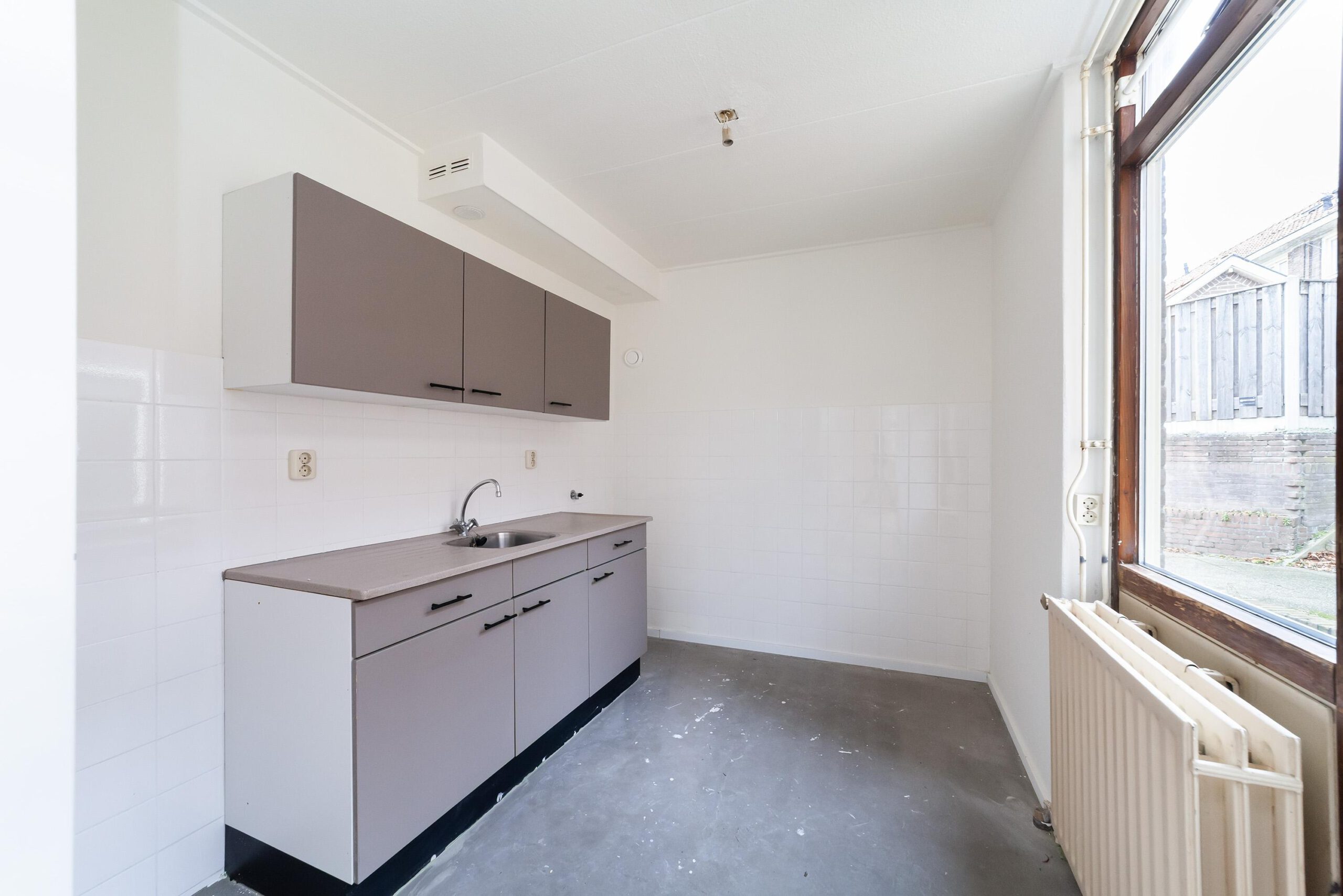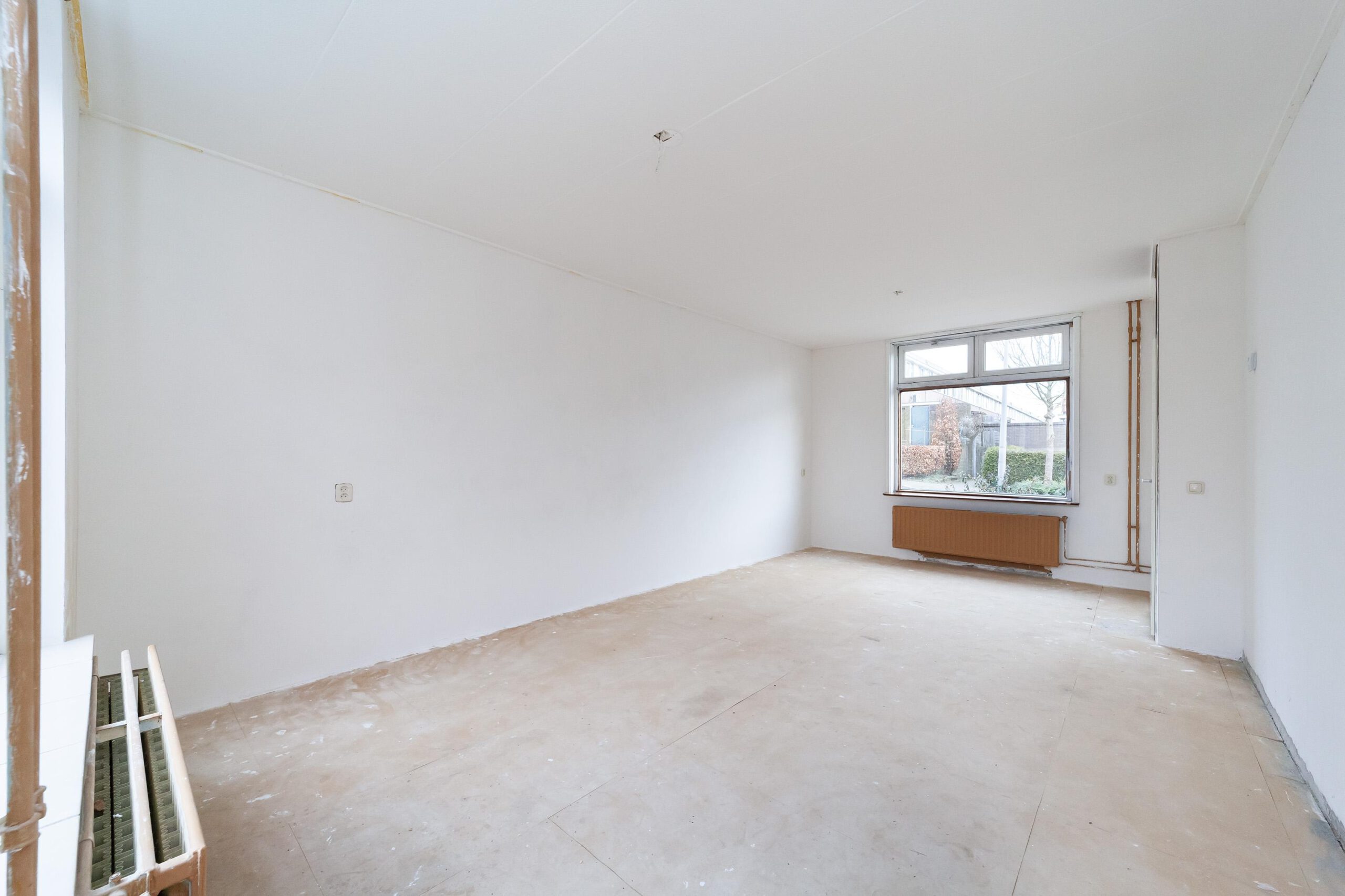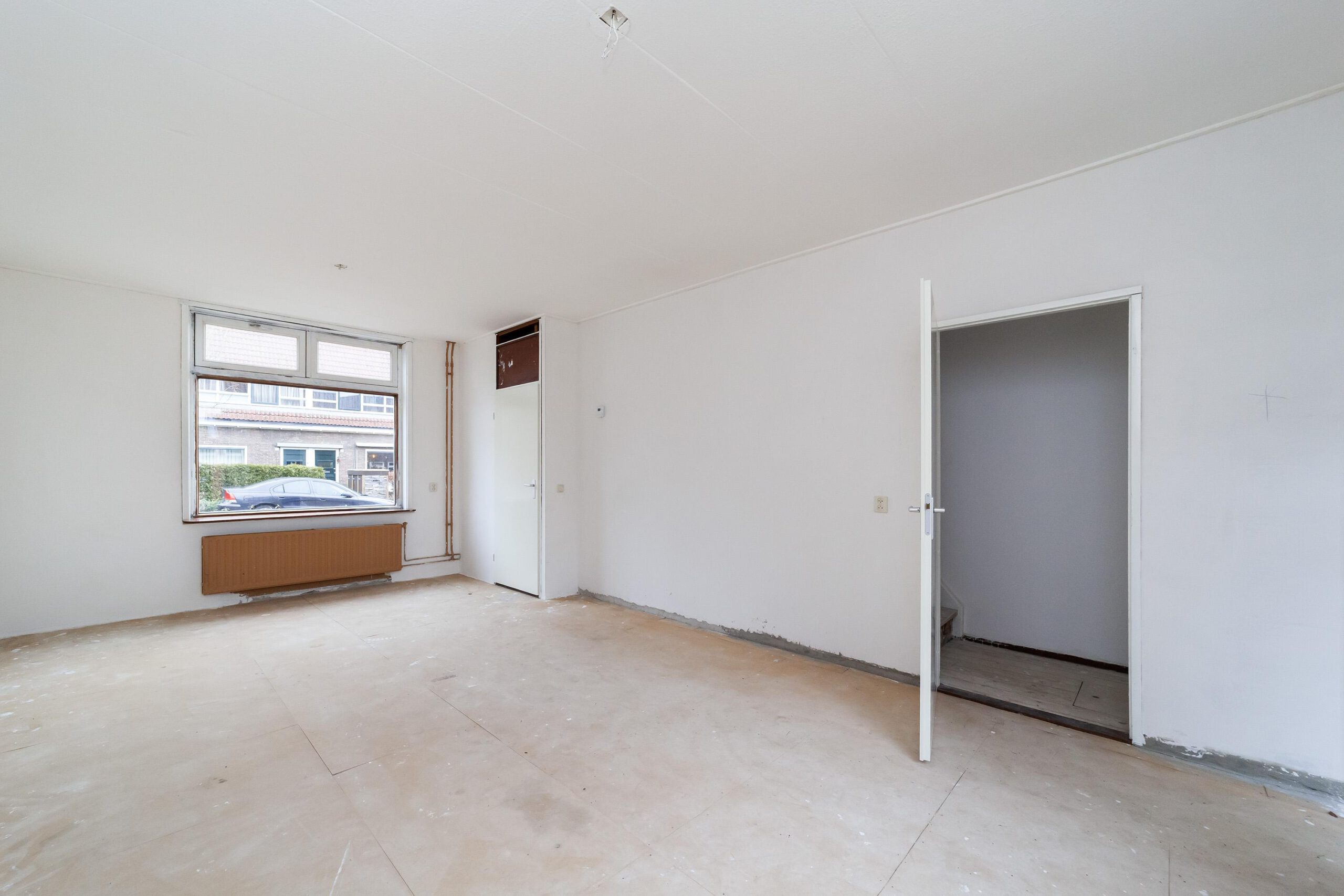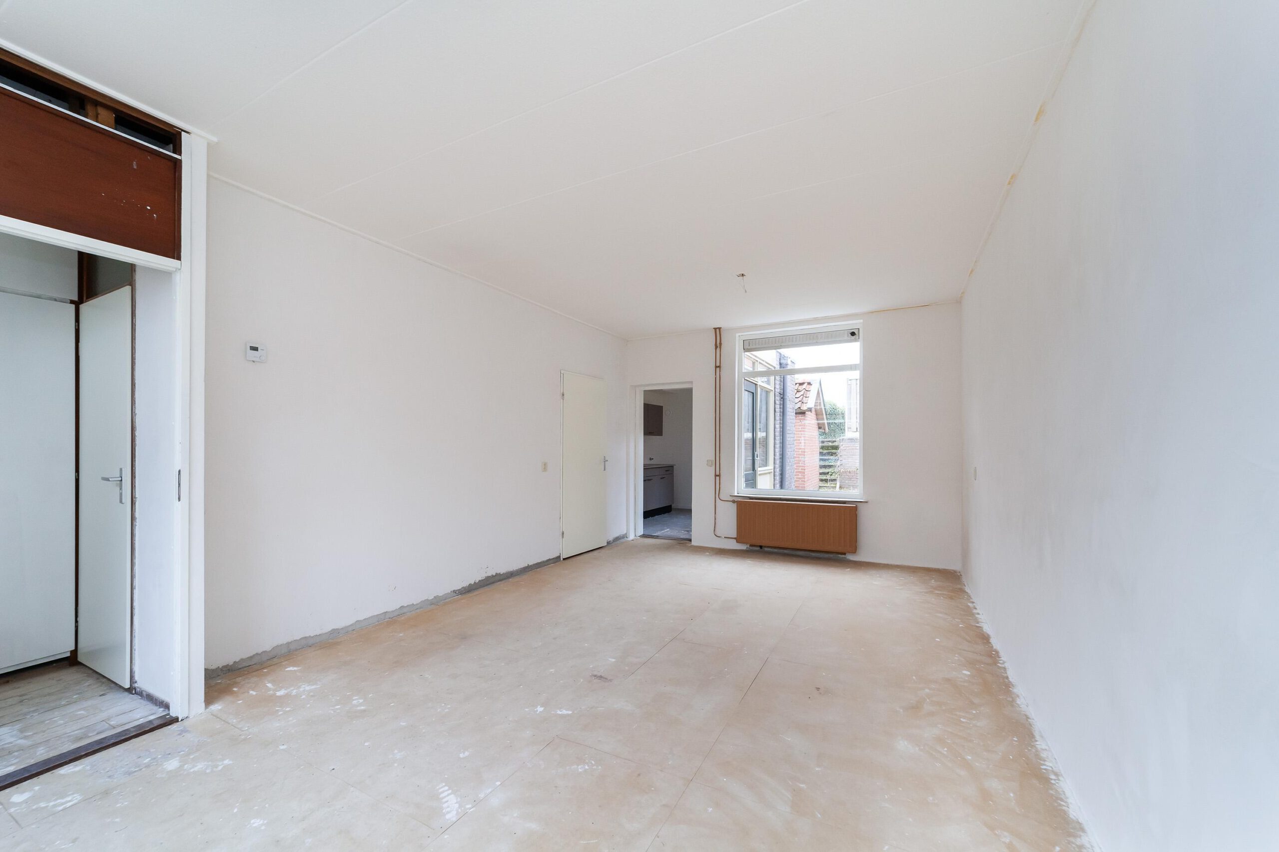 Entree, hal met trapopgang, toegang tot de lichte woonkamer met ramen aan zowel de voor- als achterzijde, wat zorgt voor een prettige lichtinval. Aan de achterzijde van de woning bevindt zich de keuken, uitgevoerd zonder apparatuur.