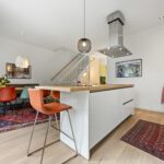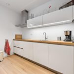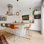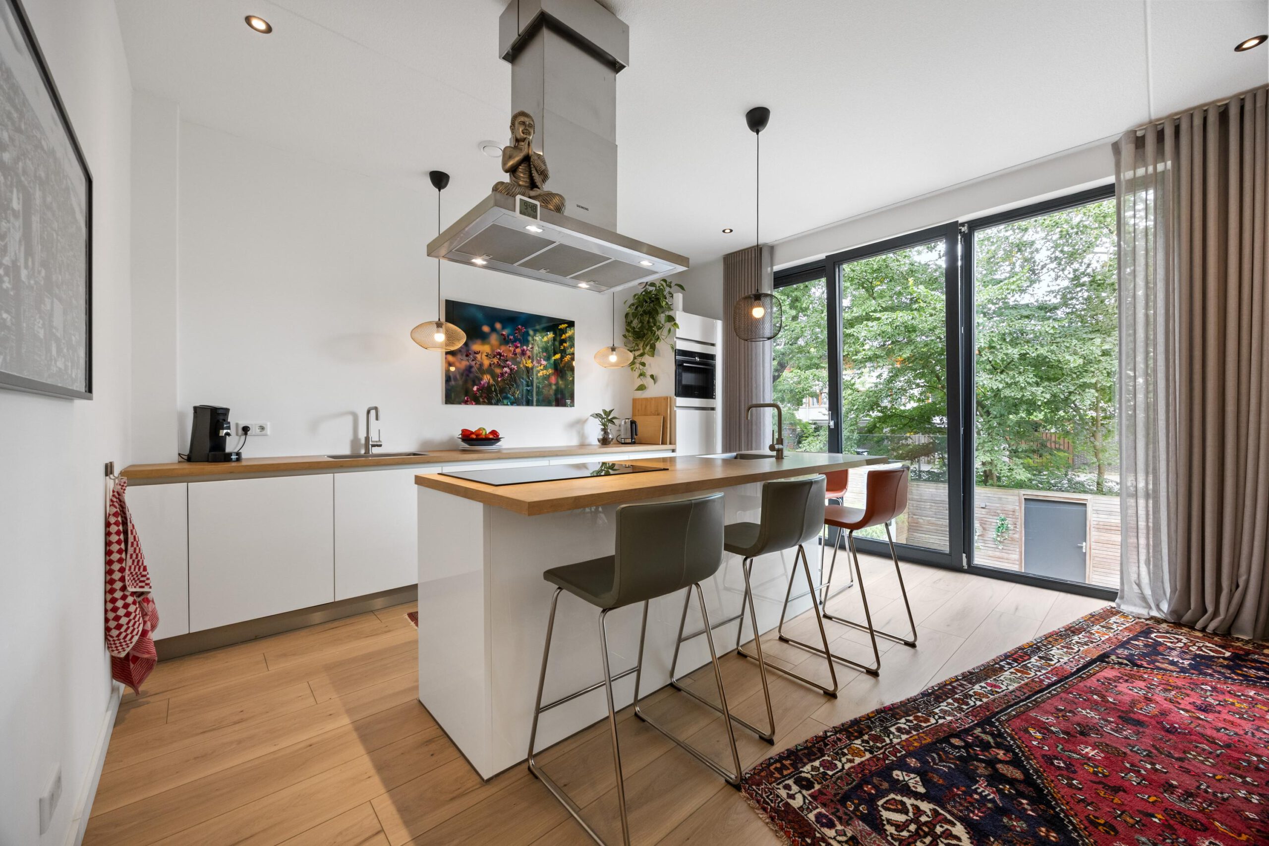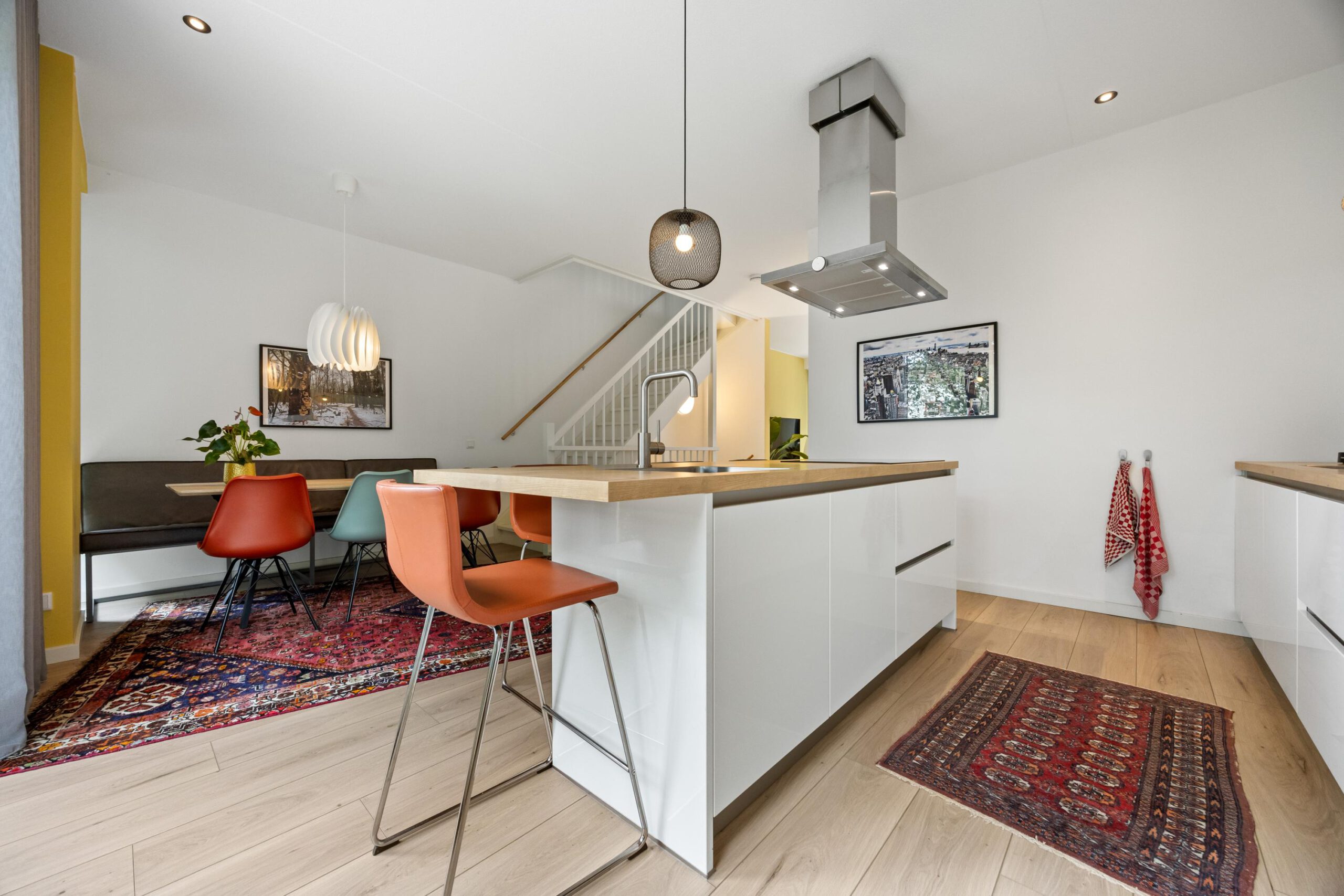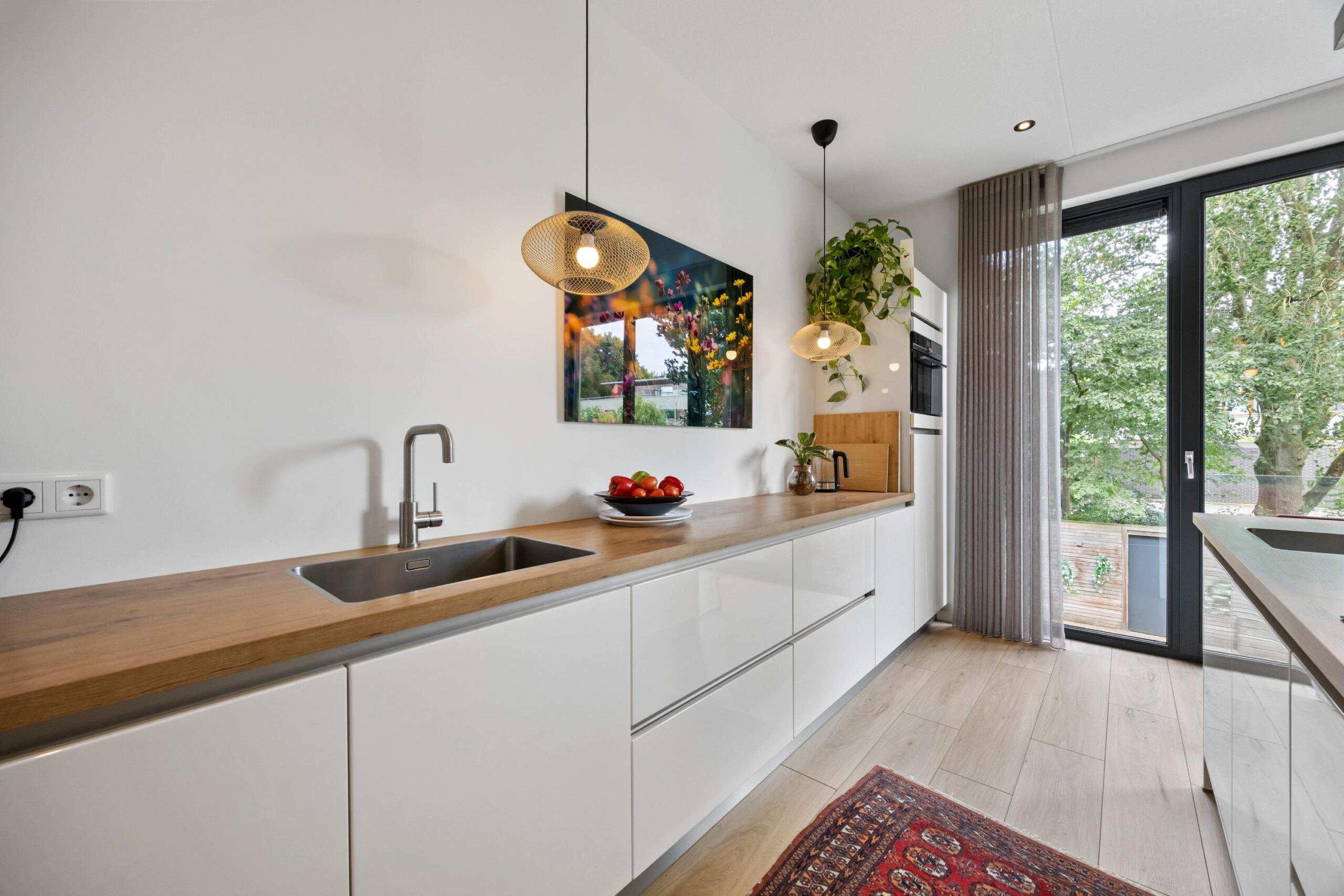 De achterzijde is voorzien van een ruim kookeiland met plek om hieraan te zitten. Tevens is er genoeg ruimte voor een eettafel. Deze fantastische keuken is voorzien van alle hedendaagse gemakken en geeft een fijn uitzicht over de achtertuin.
