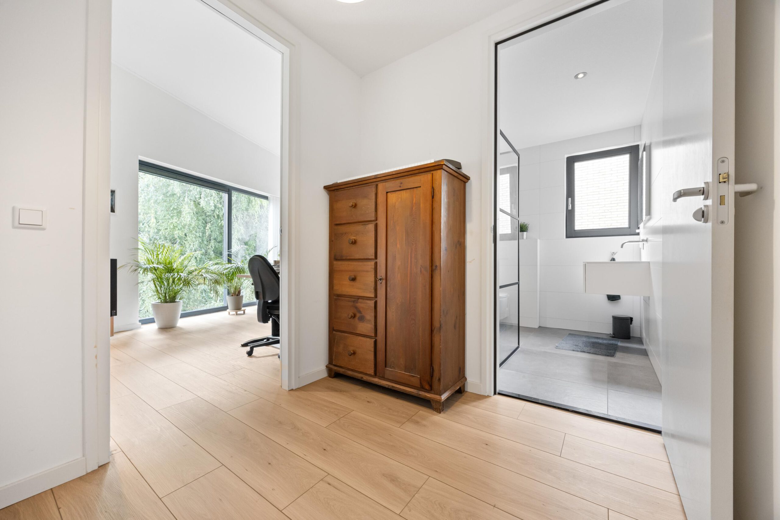 1e verdieping: Overloop, toegang tot de slaapkamer, badkamer en de kantoor/hobby ruimte aan de voorzijde, of in te richten als slaapkamer. De moderne badkamer is voorzien van moderne inloopdouche, wastafel met lade, spiegel en toilet.