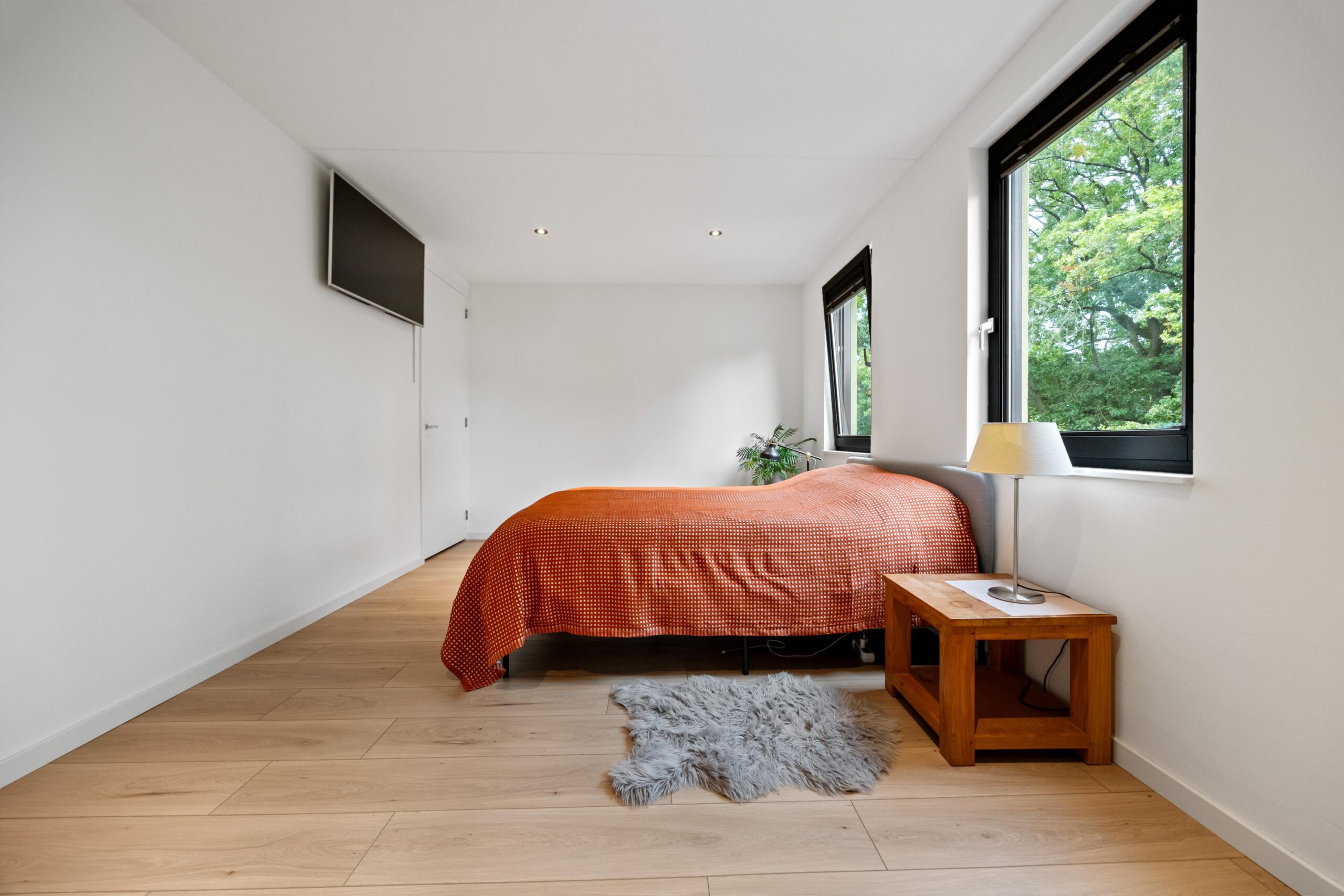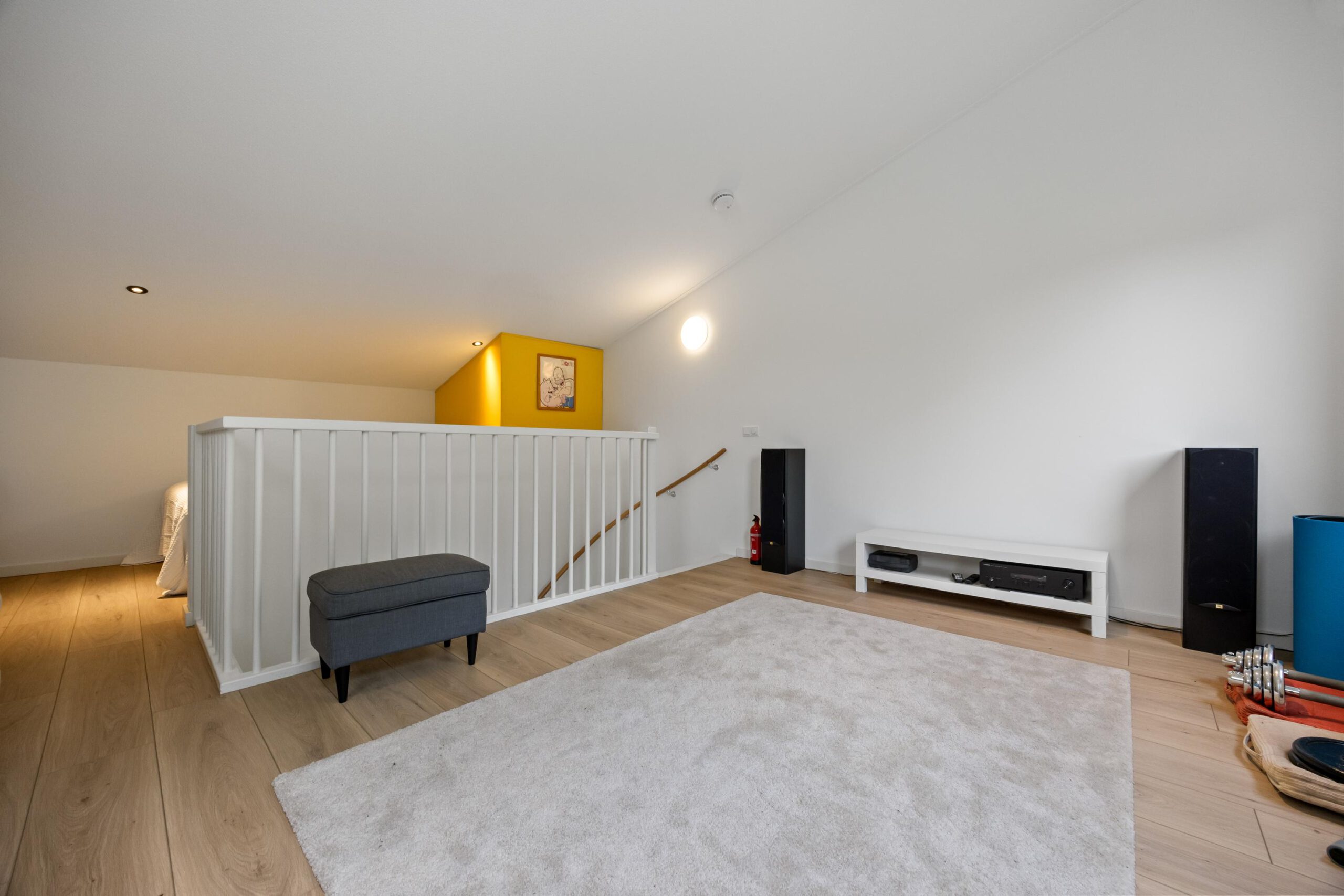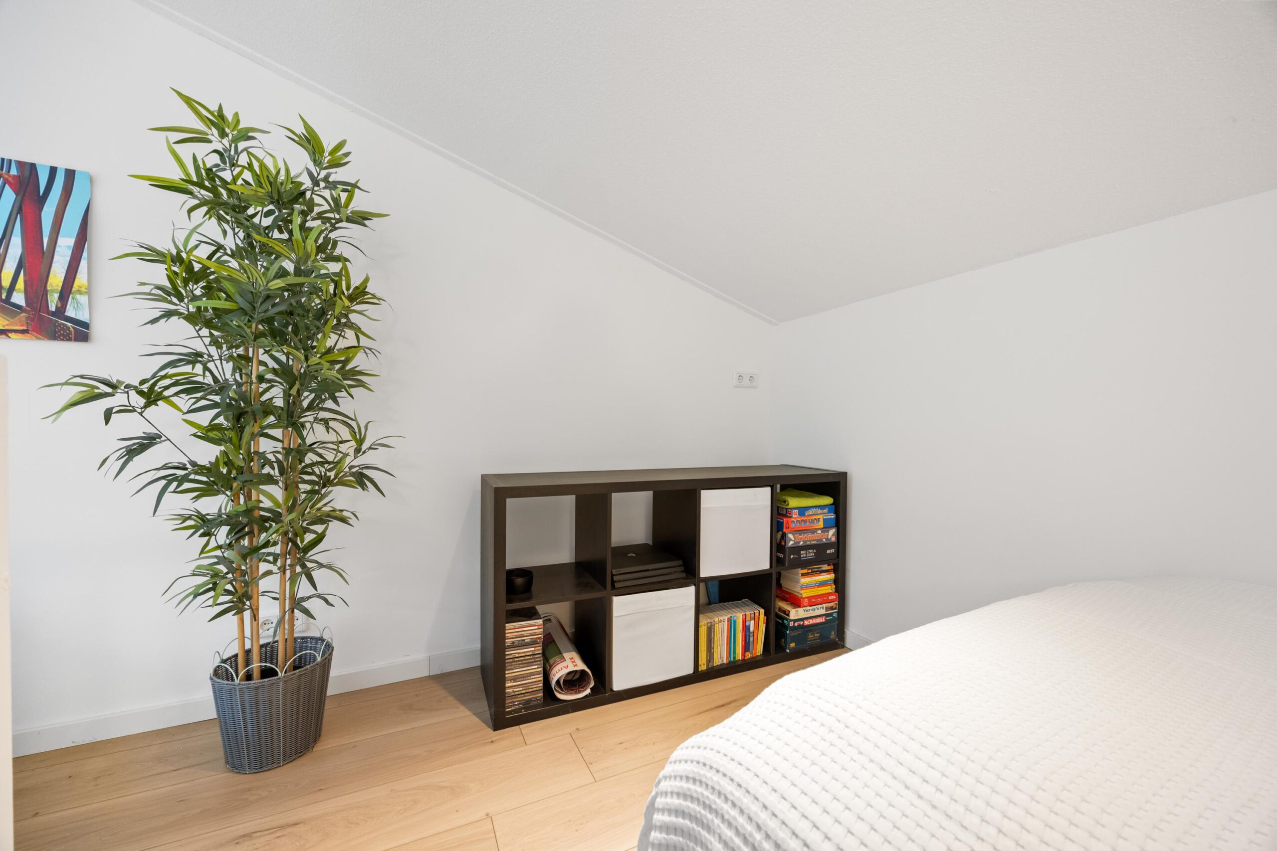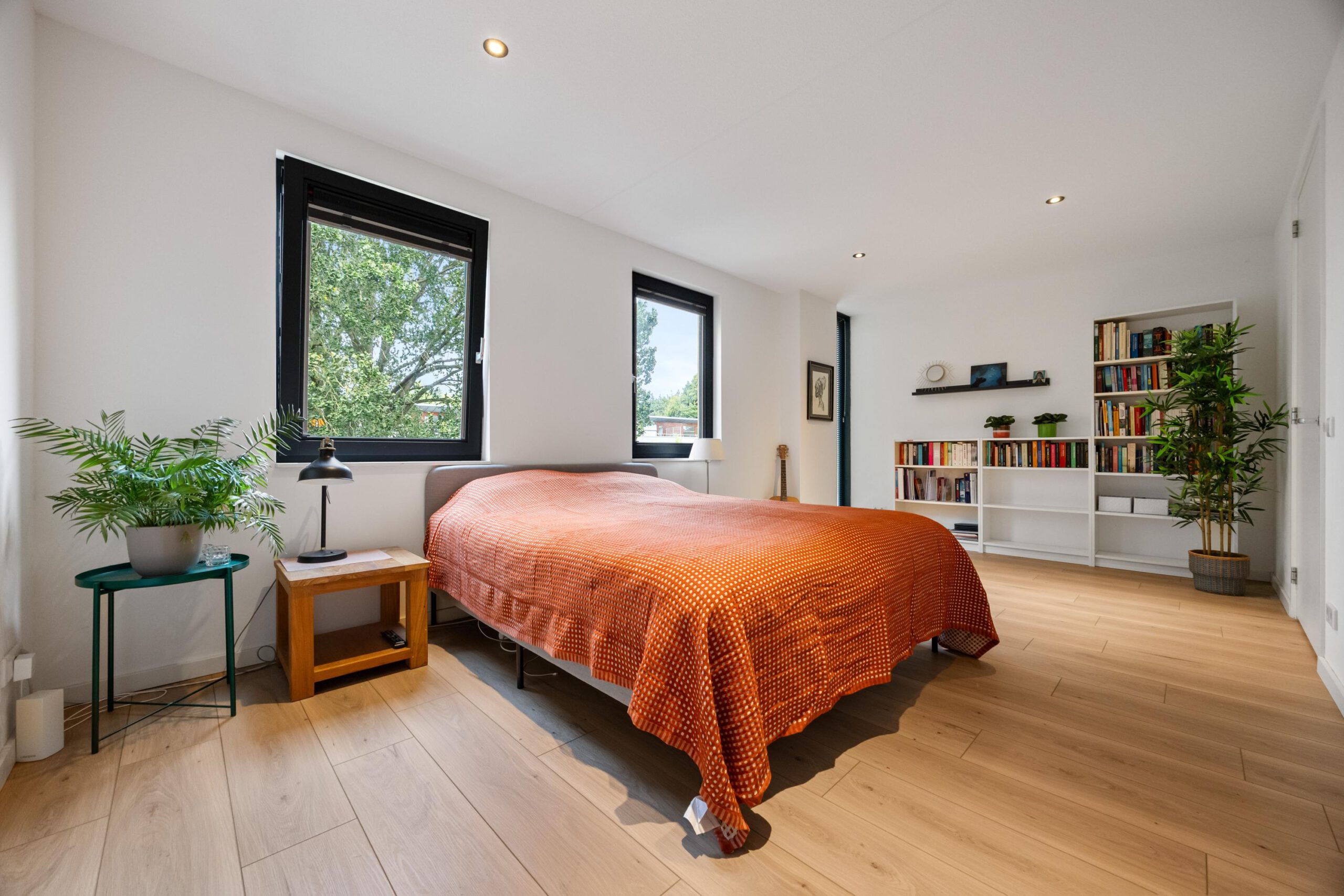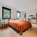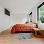 2e verdieping: Grote slaapkamer met veel lichtinval. Thans ingericht als sportruimte, bioscoop en logeerkamer. Het zijraam biedt toegang tot het dak